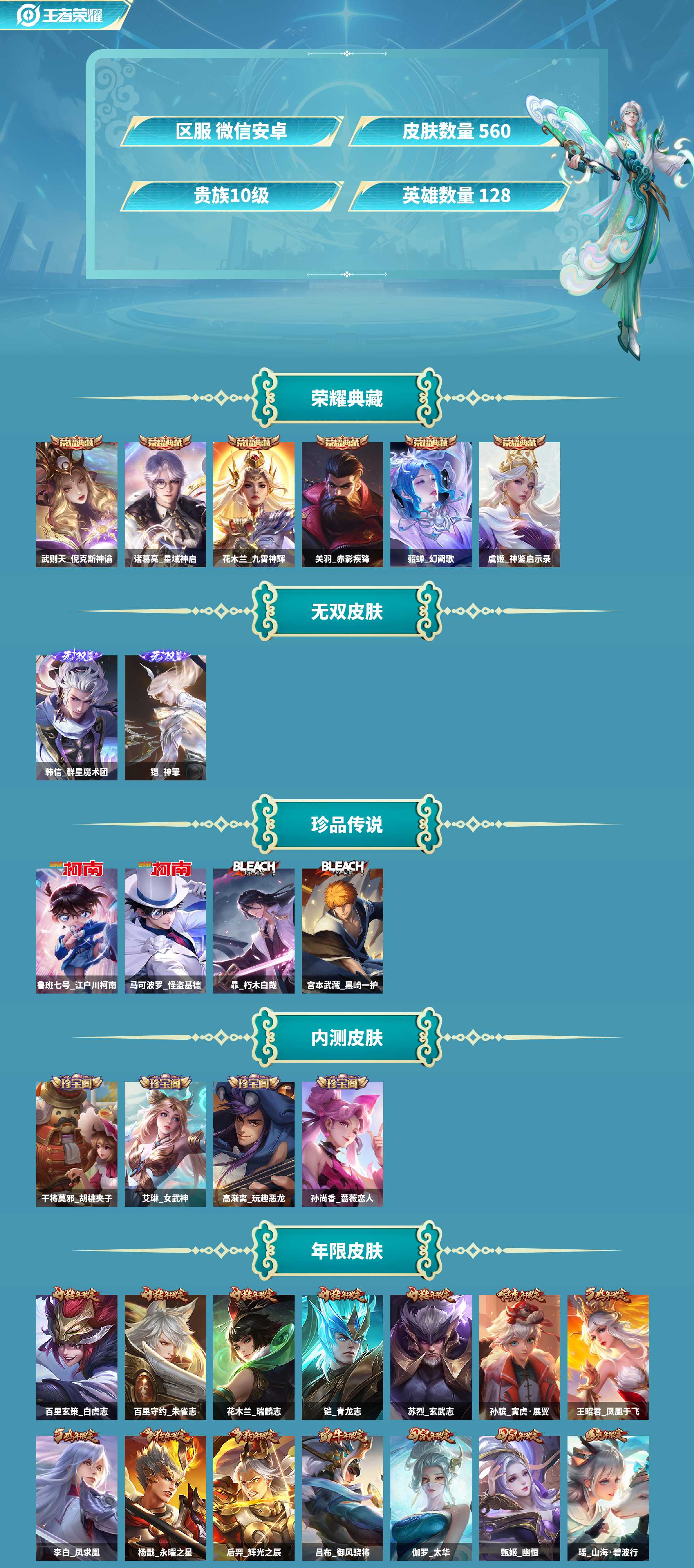 al670227 【特价安卓v区560皮微信永久社交貂蝉幻阙歌,关羽赤影疾锋,虞姬神鉴启示录,花木兰九霄神辉,诸葛亮星域神启,武则天倪克斯神谕武则天 无双皮肤:铠神罪,韩信群星魔术团 】 皮肤数560 无双皮肤数3 传说皮肤数69 珍品传说皮数4 史诗皮肤数196 英雄数128 营地id236393354 贵族等级【文本】贵族10级 【贵族10级】 荣耀典藏6 无双皮肤2 珍品传说4 内测皮肤4 年限皮肤22 限定皮肤240 赛季限定41 史诗皮肤191 战令限定55 勇者皮肤198 其他皮肤83 荣耀典藏:貂蝉幻阙歌,关羽赤影疾锋,虞姬神鉴启示录,花木兰九霄神辉,诸葛亮星域神启,武则天倪克斯神谕; 无双皮肤:铠神罪,韩信群星魔术团; 珍品传说:宫本武藏黑崎一护,暃朽木白哉,鲁班七号江户川柯南,马可波罗怪盗基德; 内测皮肤:艾琳女武神,高渐离玩趣恶龙,干将莫邪胡桃夹子,孙尚香蔷薇恋人; 年限皮肤:瑶山海碧波行,孙膑寅虎展翼,大乔乘龙忆丹青,安琪拉乘龙聚宝船,孙策乘龙淬吴钩,赵云乘龙铭钟鼎,孙尚香乘龙问璇玑,伽罗炽翼辉光,李信山海炽霜斩,马可波罗山海玄木吟,吕布御风骁将,甄姬幽恒,伽罗太华,苏烈玄武志,花木兰瑞麟志,百里守约朱雀志,铠青龙志,百里玄策白虎志,后羿辉光之辰,杨戬永曜之星,王昭君凤凰于飞,李白凤求凰; 限定皮肤:百里玄策罗小黑战记,曹操逐霄之志,马超琥珀纪元,夏侯惇霜北刀,艾琳女武神,杨戬纵目迁山,少司缘巫礼祀神,女娲万灵启世,蔡文姬夏日便利店,张良罗小黑战记,虞姬夏日便利店,露娜一生所爱,孙悟空大圣娶亲,少司缘涂山红红,大司命东方月初,公孙离涂山容容,西施织梦人,元歌诡秘之主,鬼谷子克喵,瑶山海碧波行,弈星守夜人,大司命死亡执政官,司马懿九山相柳,诸葛亮天机白泽,朵莉亚幻珠鲛人,大乔白鹤梁神女,太乙真人华丽摇滚,云缨赞萌露比,西施至美乘鲤谣,甄姬至美化雀舞,孙膑寅虎展翼,白起死霸装,宫本武藏黑崎一护,暃朽木白哉,后羿石田雨龙,亚瑟布丁狗之誓,老夫子_藏狐·褐绒,百里守约雪豹霜爪,沈梦溪匿光破解者,姬小满小满鸭,牛魔小牛鸭,梦奇顽趣,狂铁龙之律动,扁鹊灵蛊蚀心,钟馗虚灵犬护,阿轲化蝶舞,牛魔星界战将,鲁班七号江户川柯南,马可波罗怪盗基德,吕布逐霄战戟,百里守约百相守梦,雅典娜黎明之约,艾琳陌上桑,老夫子百相守梦,李白谪仙醉月,奕星炽弈燎原,镜匿光追影者,桑启鸣野蒿,东皇太一噬灭天穹,姜子牙天穹之誓,镜青焰无极,关羽决胜骁骑,项羽苍威无极,上官婉儿群星魔术团,墨子黄金天蝎座,艾琳觅芳踪,鲁班七号蔬乡物语,李元芳蔬乡物语,海月金乌负日,刘邦剑破天穹,沈梦溪龙舞盛年,亚连落雪白狼,吕布曦玄引,貂蝉曦玄引,百里玄策超元猎域,大乔乘龙忆丹青,安琪拉乘龙聚宝船,孙策乘龙淬吴钩,赵云乘龙铭钟鼎,孙尚香乘龙问璇玑,周瑜雪夜绮愿,伽罗琥珀纪元,嫦娥漠中幻影,高渐离燃音魔法,鬼谷子天穹祈灯,妲己灵卜魔法,蒙犽百解令,狄仁杰夜礼服假面,王昭君永恒水手月亮,高渐离玩趣恶龙,阿古朵江河有灵,司空震地狱燃心,吕布遇见神鼓,张良古海寻踪,艾琳流音漫舞,李元芳匿光侦查者,戈娅驭风魔法,马可波罗妄想实况,赵云引擎之心,鲁班大师探海日志,西施玲珑珍味,诸葛亮鹤羽星尊,扁鹊奇幻香踪,裴擒虎擒涛扼浪,杨戬潮玩骑兵,夏洛特浮生妄,干将莫邪画中仙,暃星界游侠,花木兰燃星之曲,虞姬无限倾心,伽罗炽翼辉光,李信山海炽霜斩,桑启海盐诗旅,马可波罗山海玄木吟,嫦娥暖冬兔眠,墨子降魔,元歌无心,狄仁杰神器狴犴令,阿轲迷踪丽影,盾山梦圆繁星,不知火舞绯月行,鬼谷子五谷丰年,钟无艳超时空战士,王