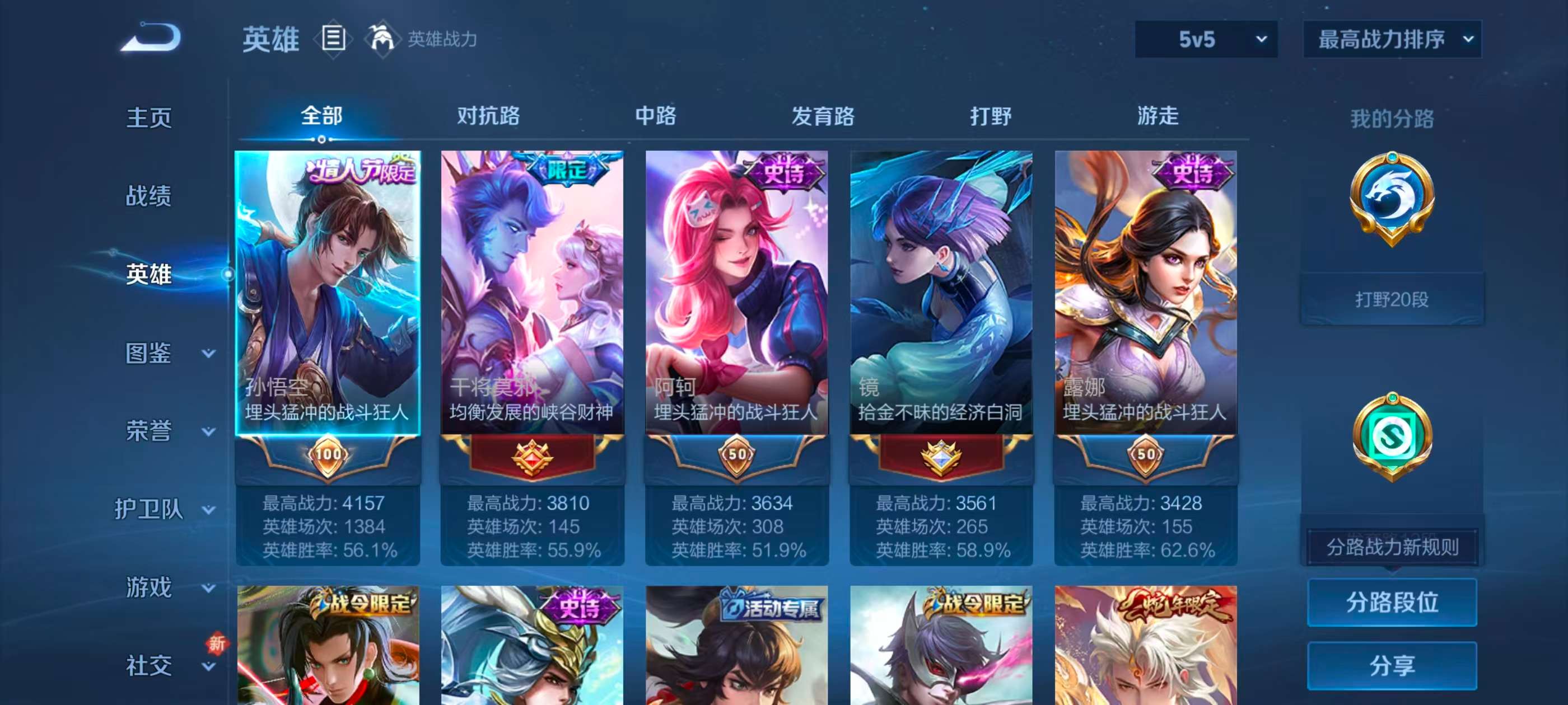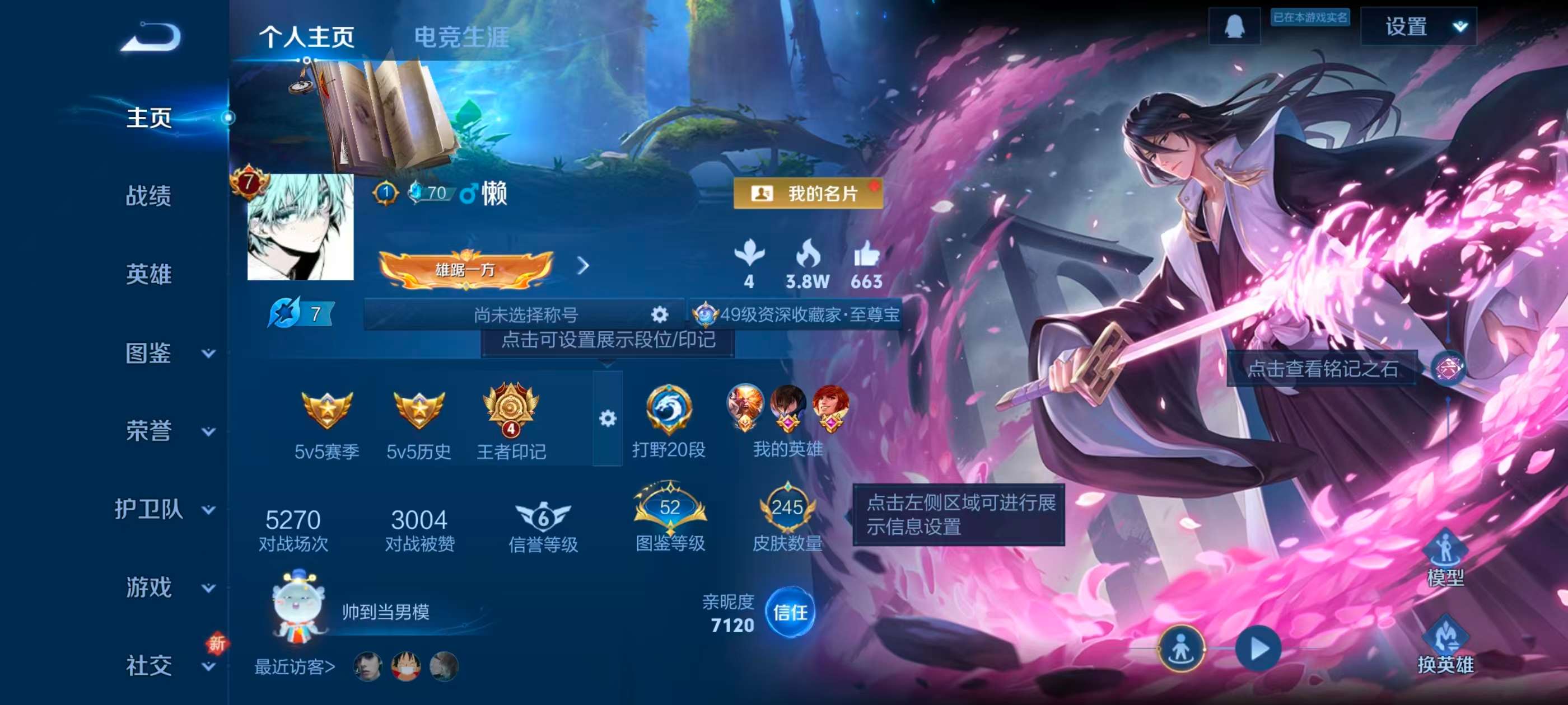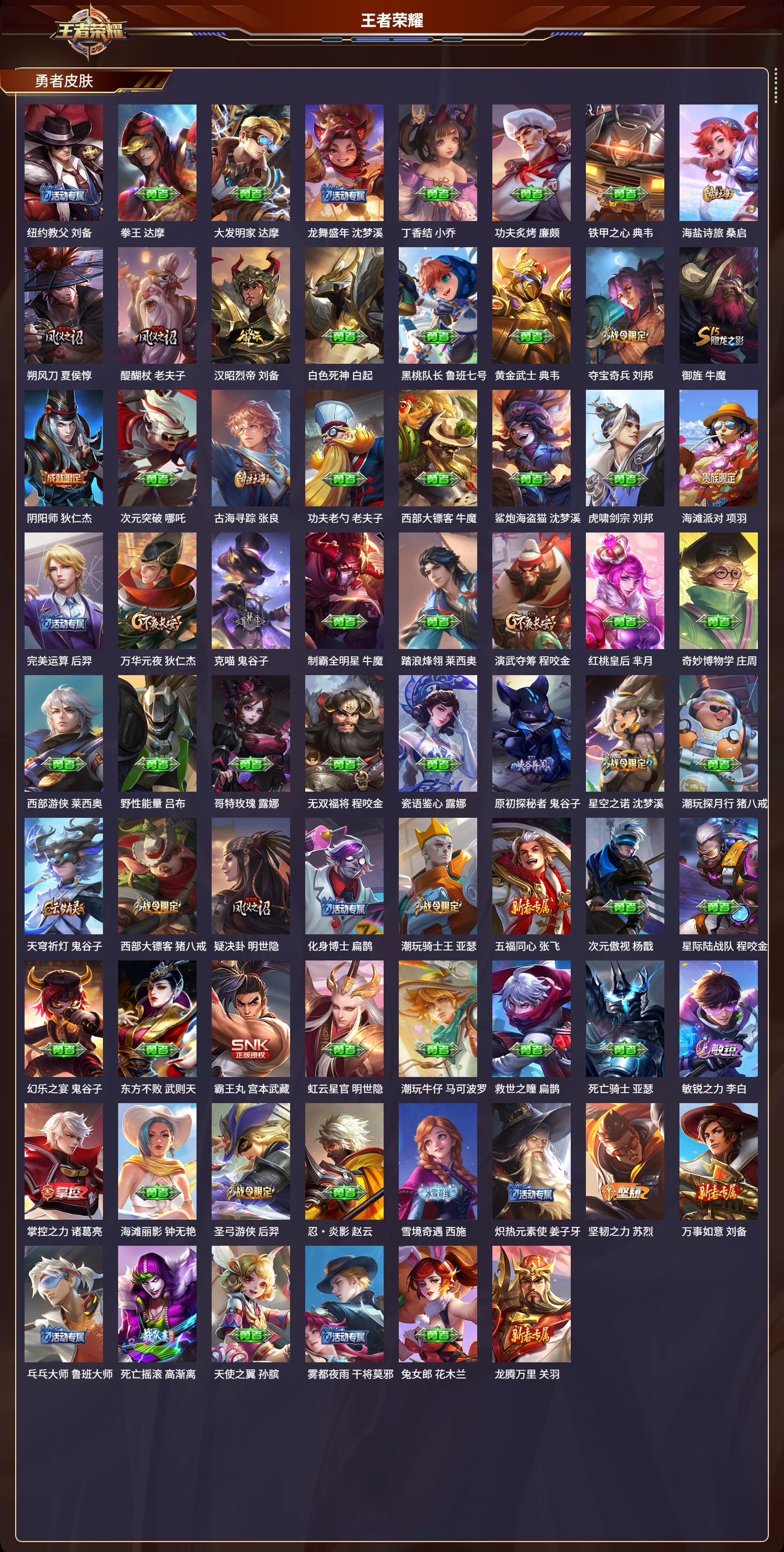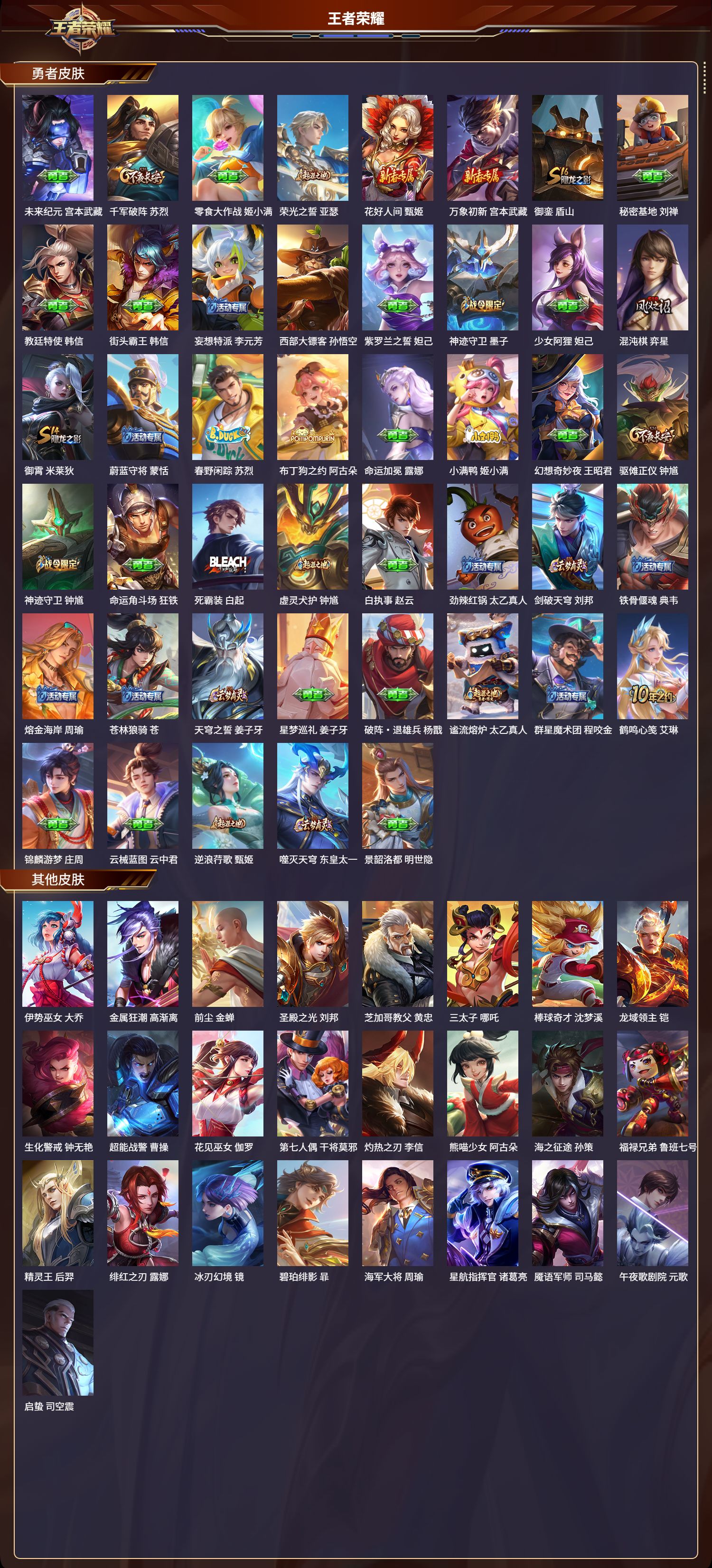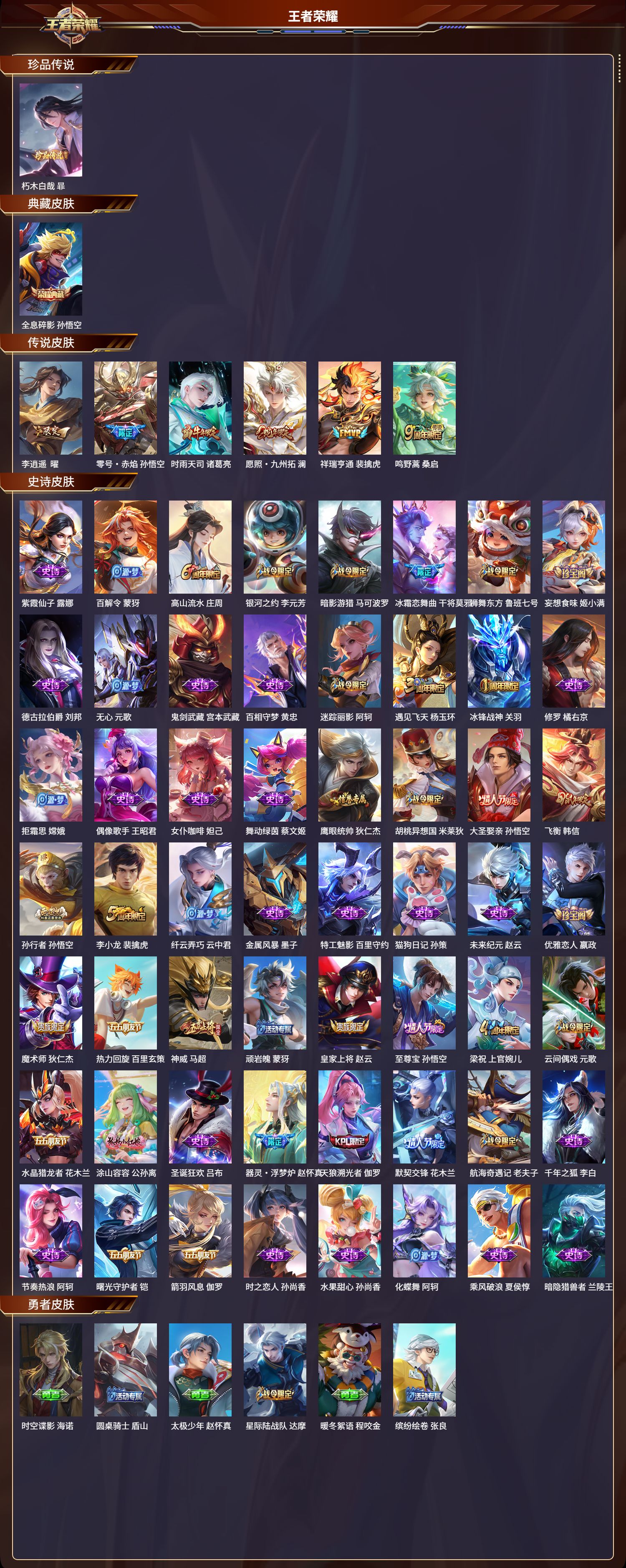 安卓qq/非凡王者/245皮肤/125英雄/1典藏/0珍品无双/0无双/1珍品传说/6传说/56史诗/7稀有英雄【1 珍品传说】朽木白哉 暃【1 典藏皮肤】全息碎影 孙悟空【6 传说皮肤】李 曜零号·赤焰 孙悟空时雨天司 诸葛亮愿照·九州拓 澜祥瑞亨通 裴擒虎鸣野蒿 桑启【56 史诗皮肤】紫霞仙子 露娜百解令 蒙犽高山流水 庄周银河之约 李元芳暗影