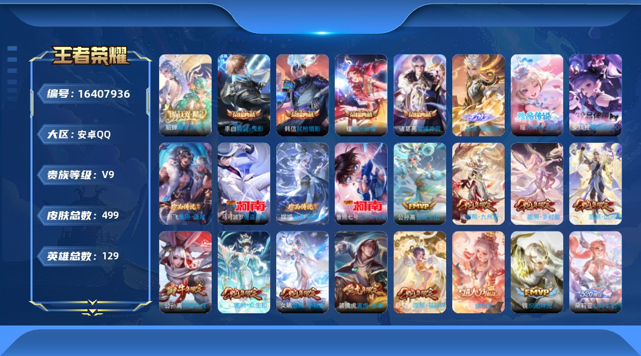 [16407936]安卓q-v9-127英雄-490皮肤-3典藏-1珍品无双-1无双-6珍品传说-45传说-162史诗,小国韩信,1颗水晶未兑换,朵利亚全皮,杨玉环全皮,嫦娥全皮,夏洛特全皮,,yy 【英雄全皮】:刘邦全皮,朵莉亚全皮,钟馗全皮,杨玉环全皮,苍全皮,鬼谷子全皮,狂铁全皮,嫦娥全皮,蒙恬全皮,夏洛特全皮,司空震全皮,空空儿全皮,影全皮,海诺全皮 【荣耀典藏】:武则天英雄,李白鸣剑曳影,诸葛亮星域神启,韩信弑呛猎影 【珍品无双】:貂蝉馥梦繁花 【无双皮肤】:曜器灵螭龙剑 【珍品传说】:马可波罗怪盗基德,鲁班七号江户川柯南,嫦娥器灵落星盏,张飞兔狲蓬尾,瑶大耳狗之梦,安琪拉酷洛米之心 【传说皮肤】:后羿神树通天,公孙离云诺千山,西施续相思,杨玉环星之鸣奏,后羿千劫归真,司空震愿照山河定,女娲愿照千秋盛,妲己愿照众生和,澜愿照九州拓,蔡文姬愿照福禄聚,虞姬愿照岁时盈,云缨幻光神呛,裴擒虎祥瑞亨通,嬴政玄雷天君,王昭君映山客,桑启鸣野蒿,庄周牧神诗旅,铠冥王哈迪斯,朵莉亚心动手记,海月金乌负日,典韦战鼓燎原,吕布遇见神鼓,张飞百相守梦,夏洛特浮生妄,马超无双飞将,裴擒虎寅虎赤拳,孙尚香异界灵契,赵云淬星耀世,西施游龙清影,周瑜音你心动,公孙离祈雪灵祝,镜炽阳神光,虞姬启明星使,关羽武圣,李信一念神魔,刘备时之恋人,貂蝉猫影幻舞,达摩黄金狮子座,梦奇胖达荣荣,后羿黄金射手座,诸葛亮武陵仙君,貂蝉仲夏夜之梦,孙尚香末日机甲,宫本武藏地狱之眼,武则天海洋之心 【限定皮肤】:铠冥王哈迪斯,暃埋骨钱,蒙犽顽岩魄,蔡文姬夏日便利店,大乔绒语心约,虞姬夏日便利店,姜子牙天穹之誓,杨戬破阵退雄兵,李白谪仙醉月,狄仁杰阴阳师,赵云皇家上将,赵云引擎之心,赵云龙胆,孙尚香异界灵契,鲁班七号狮舞东方,庄周蜃楼王,庄周云端筑梦师,高渐离死亡摇滚,高渐离玩趣恶龙,阿轲迷踪丽影,孙膑天狼运算者,孙膑寅虎展翼,扁鹊奇幻香踪,芈月重明,芈月幻夜卜梦,吕布御风骁将,吕布遇见神鼓,元歌云间偶戏,元歌无心,夏侯惇朔风刀,甄姬游园惊梦,曹操烛龙,典韦穷奇,马可波罗暗影游猎,狄仁杰魔术师,狄仁杰万华元夜,达摩沙漠行僧,项羽海滩派对,老夫子圣诞老人,老夫子醍醐杖,关羽冰锋战神,关羽武圣,安琪拉魔法小厨娘,程咬金演武夺筹,露娜一生所爱,刘邦夺宝奇兵,韩信飞衡,兰陵王金庭之子,花木兰默契交锋,亚瑟潮玩骑士王,孙悟空至尊宝,孙