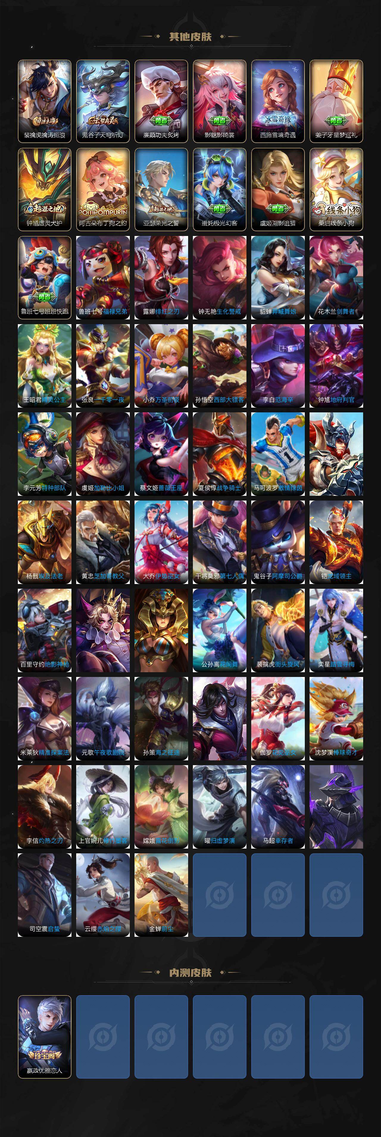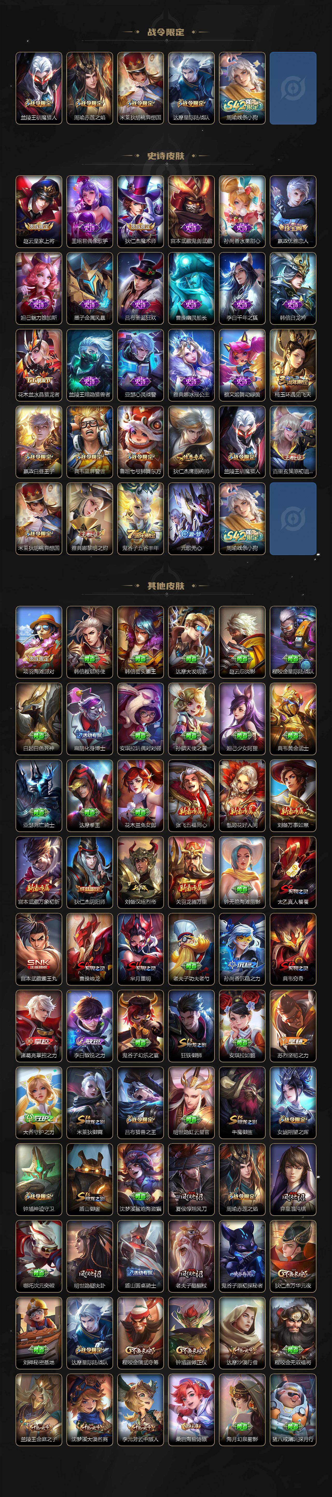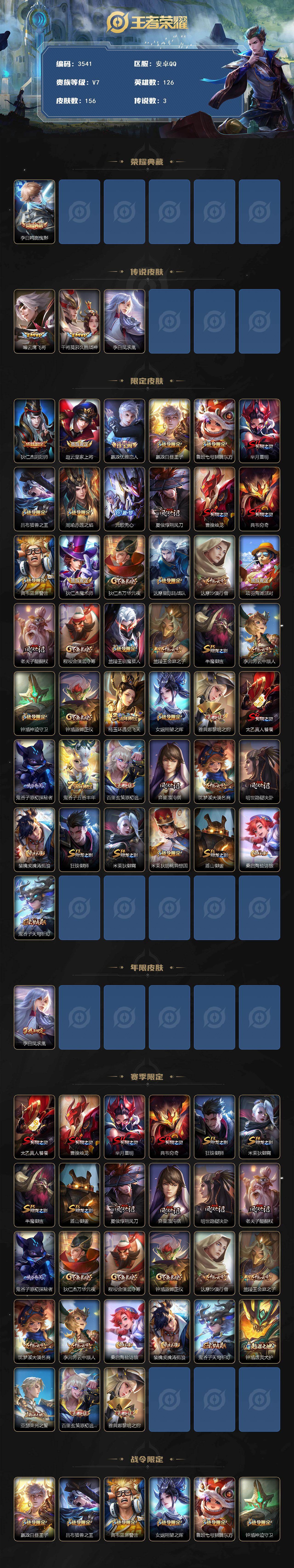 126英雄-156皮肤-贵族7/皮肤156/典藏1/传说3/史诗28/英雄126/影全皮/鸣剑·曳影 李白/云鹰飞将 曜/久胜战神 干将莫邪/凤求凰 李白/阴阳师 狄仁杰/皇家上将 赵云/优雅恋人 嬴政/白昼王子 嬴政/狮舞东方 鲁班七号/重明 芈月/猎兽之王 吕布/赤莲之焰 周瑜/无心 元歌/朔风刀 夏侯惇/烛龙 曹操/穷奇 典韦/蓝屏警告 典韦/魔术师 狄仁杰/万华元夜 狄仁杰/星际陆战队 达摩/沙漠行僧 达摩/