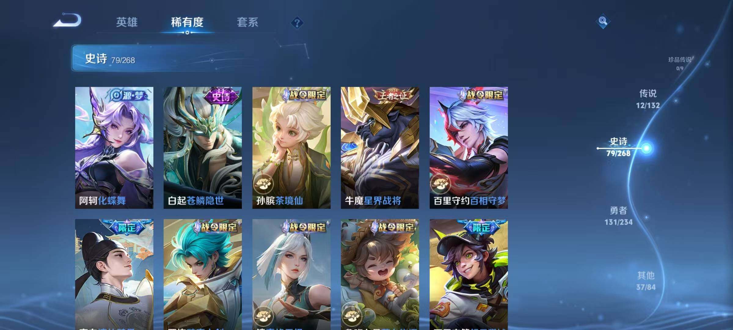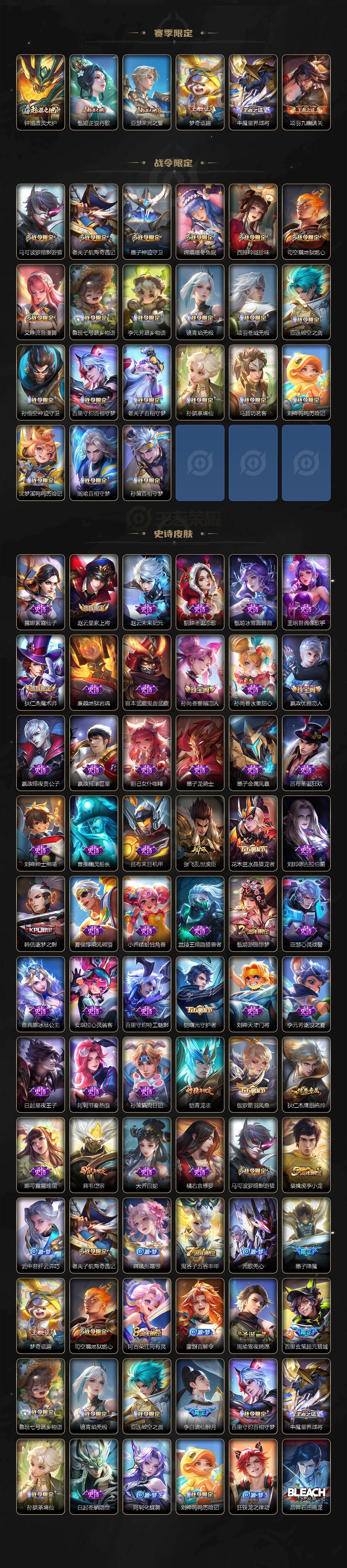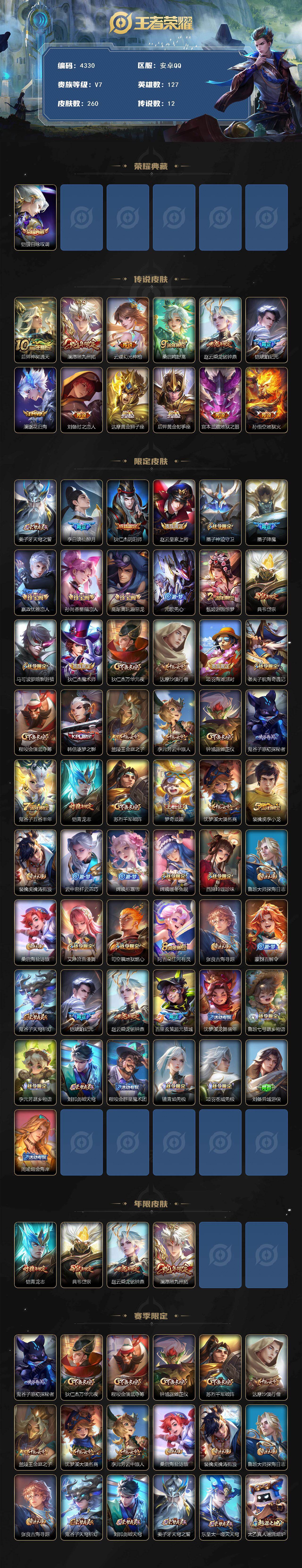 【4330】安卓q-v7-永恒钻石i段位-127英雄-260皮肤-1典藏皮肤-12传说-79史诗 【荣耀典藏】:铠银白咏叹调 【传说皮肤】:后羿神树通天,澜愿照九州拓,云缨幻光神呛,桑启鸣野蒿,赵云乘龙铭钟鼎,铠琥珀纪元,澜逐花归海,刘备时之恋人,达摩黄金狮子座,后羿黄金射手座,宫本武藏地狱之眼,孙悟空地狱火 【限定皮肤】:姜子牙天穹之誓,李白谪仙醉月,狄仁杰阴阳师,赵云皇家上将,墨子神迹守卫