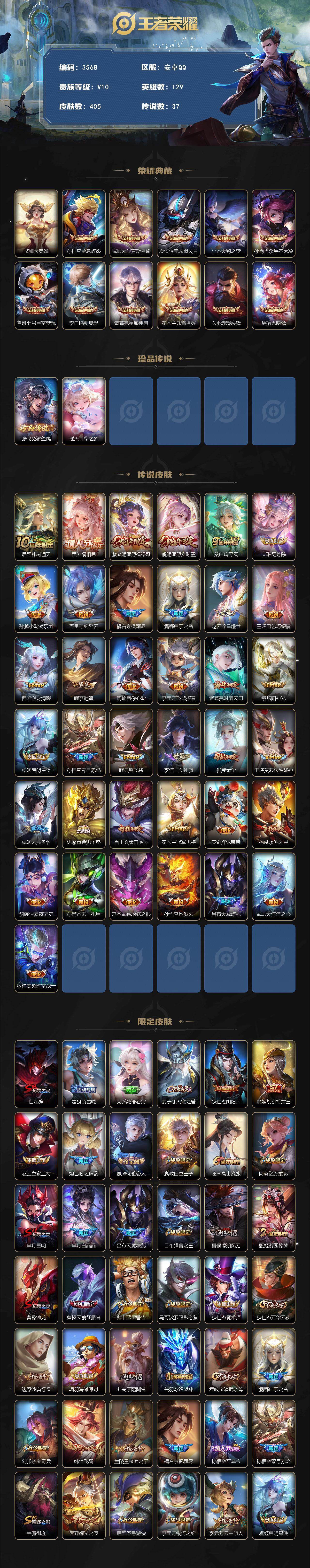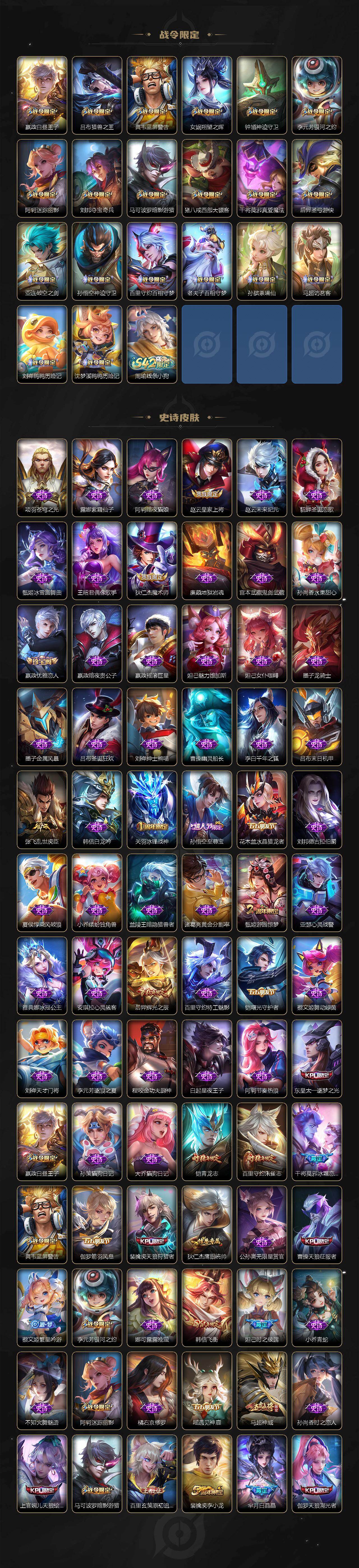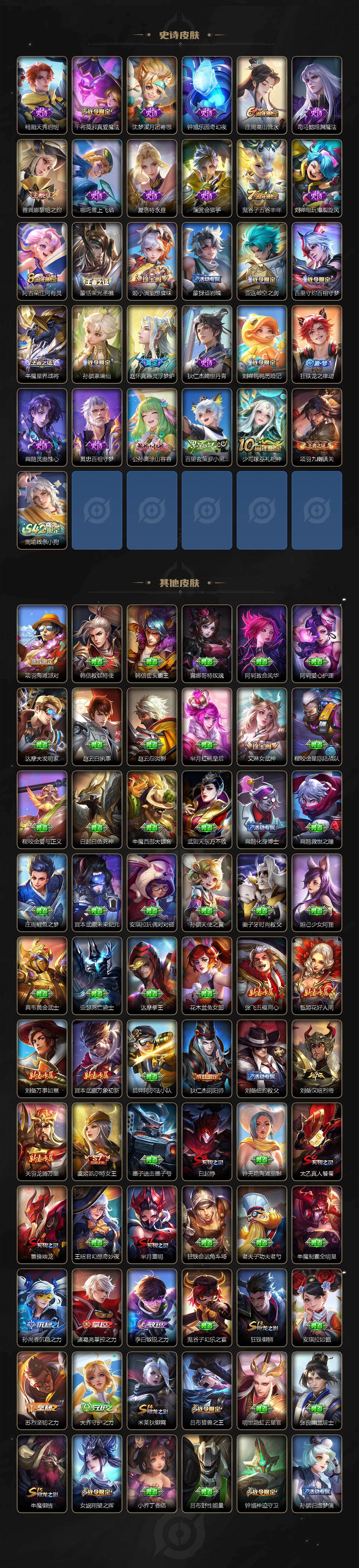 129英雄-405皮肤-贵族10/皮肤405/典藏11/传说37/史诗108/英雄129/刘禅全皮/孙权全皮/橘右京全皮/钟馗全皮/空空儿全皮/影全皮/武则天/全息碎影 孙悟空/倪克斯神谕 武则天/无限飓风号 夏侯惇/天鹅之梦 小乔/杀手不太冷 孙尚香/星空梦想 鲁班七号/鸣剑·曳影 李白/星域神启 诸葛亮/九霄神辉 花木兰/赤影疾锋 关羽/拾光映像 瑶/兔狲·蓬尾 张飞/大耳狗之梦 瑶/神树通天 后羿/续相思 西施