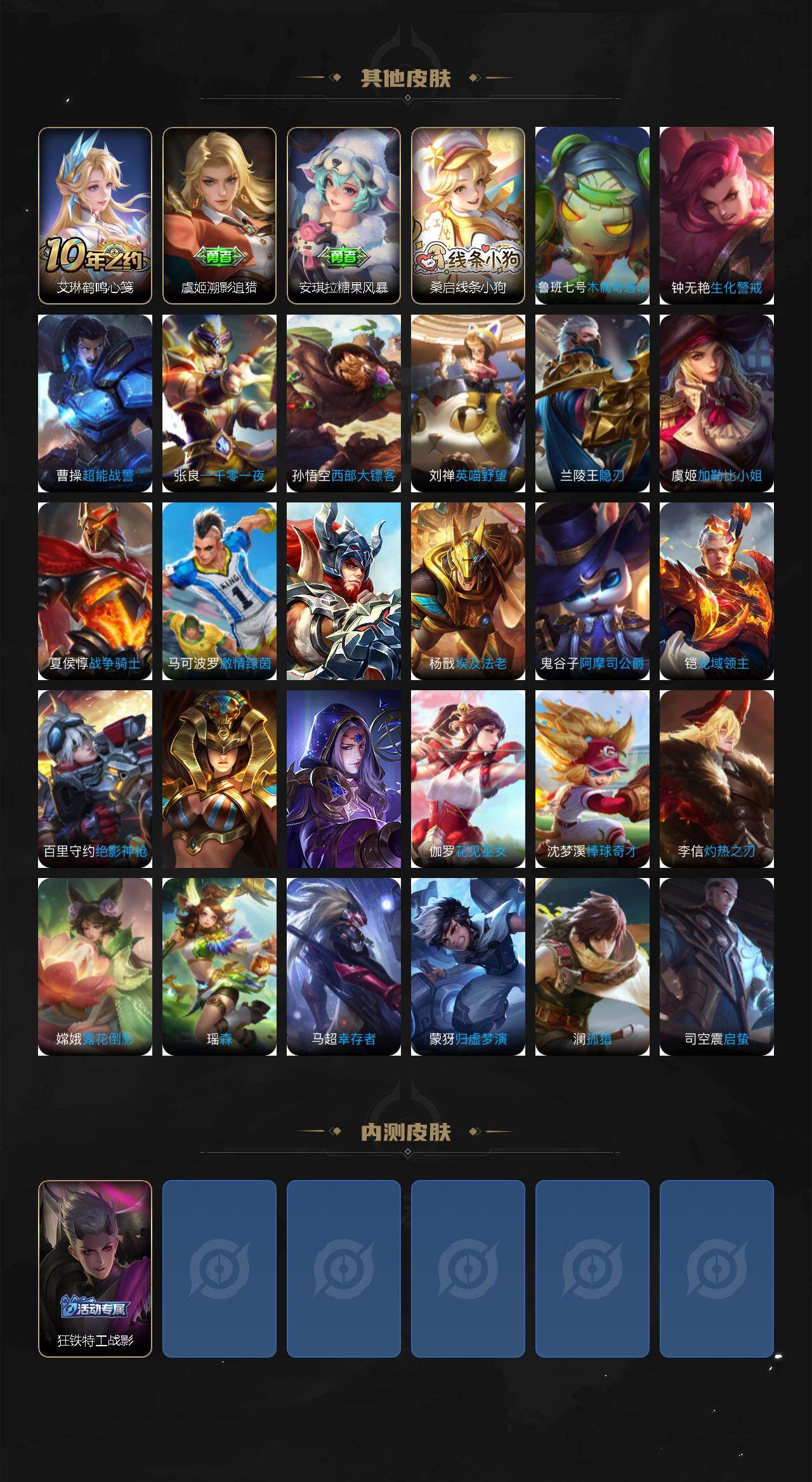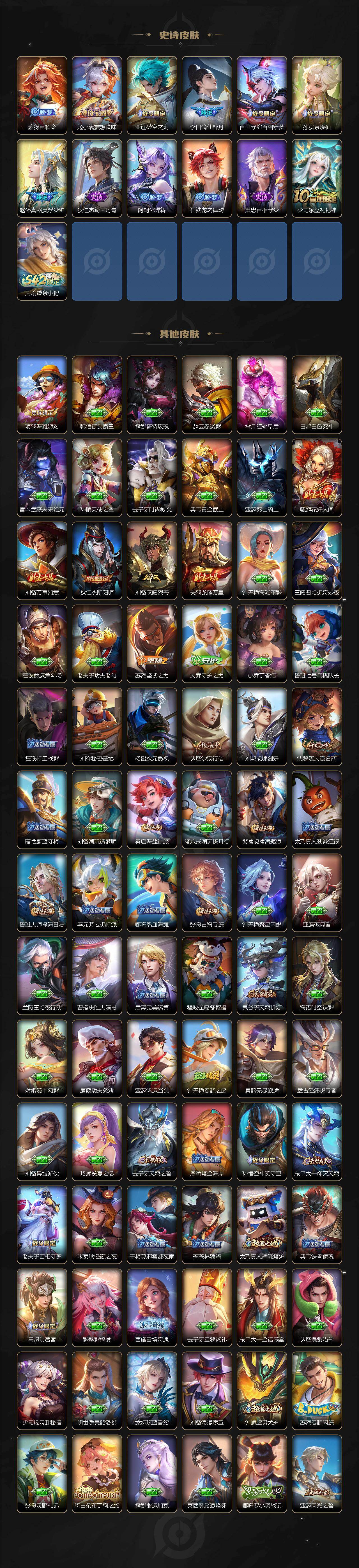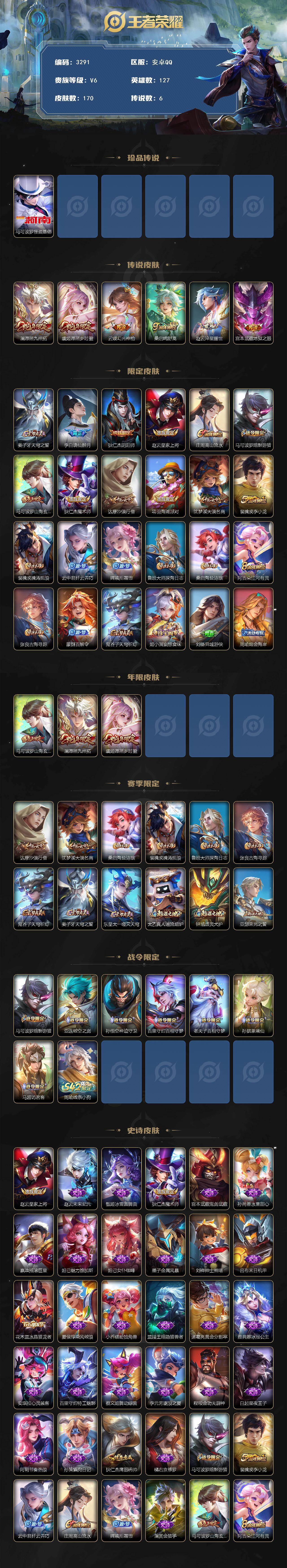 127英雄-170皮肤-贵族6/皮肤170/传说6/史诗48/英雄127/影全皮/怪盗基德 马可波罗/愿照·九州拓 澜/愿照·岁时盈 虞姬/幻光神呛 云缨/鸣野蒿 桑启/淬星耀世 赵云/地狱之眼 宫本武藏/天穹之誓 姜子牙/谪仙醉月 李白/阴阳师 狄仁杰/皇家上将 赵云/高山流水 庄周/暗影游猎 马可波罗/山海·玄木吟 马可波罗/魔术师 狄仁杰/沙漠行僧 达摩/海滩派对 项羽/大漠名商 沈梦溪/李小龙 裴擒虎/擒涛扼