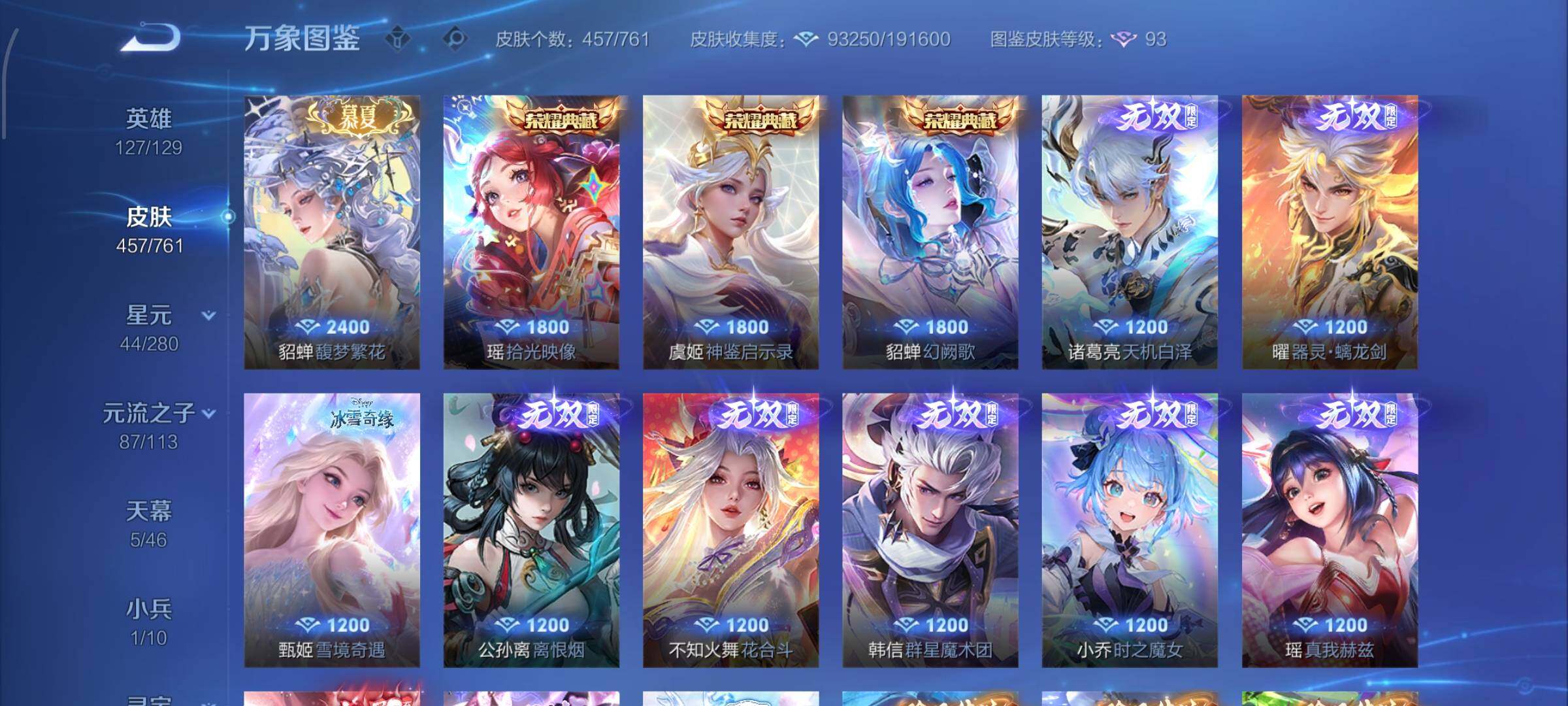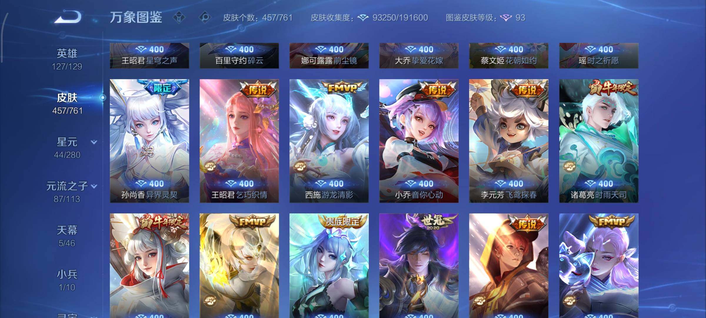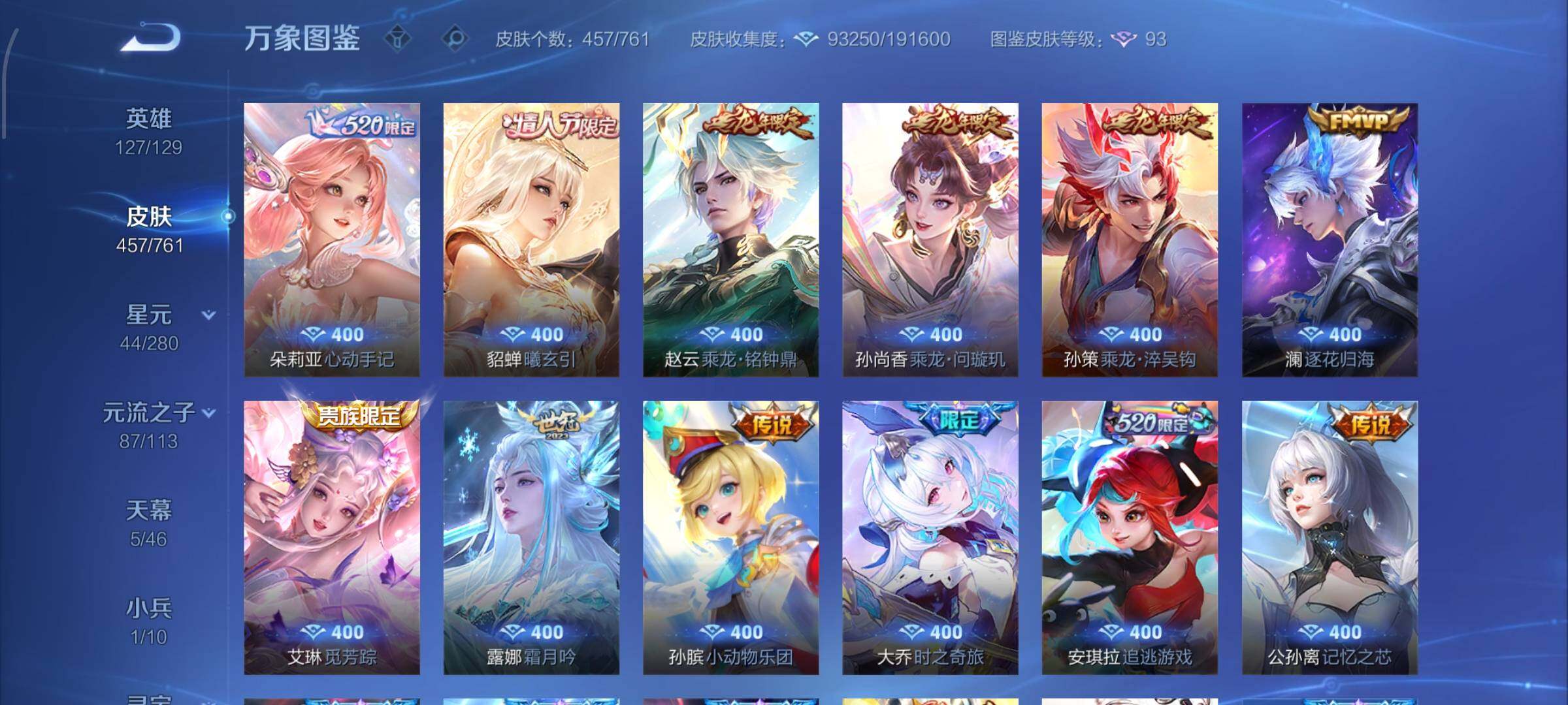 【精品v11·3典藏·1珍品无双·9无双·7珍品·全皮火舞·全皮朵利亚·全皮大乔·全皮瑶·全皮西施·全皮公孙离·馥梦繁花 按键·蛇年全限定·龙年全限定·小兵大耳狗甜茶会·棉花糖聚会天幕·春野列车天幕·春日相逢天幕·龙腾四海天幕·电音狂想天幕·可二次】w12539-安卓wx-127英雄-457皮肤-1王者印记-300铭文-贵族积分29w【无双贵族10】【3典藏·1珍品无双·9无双·7珍品·2