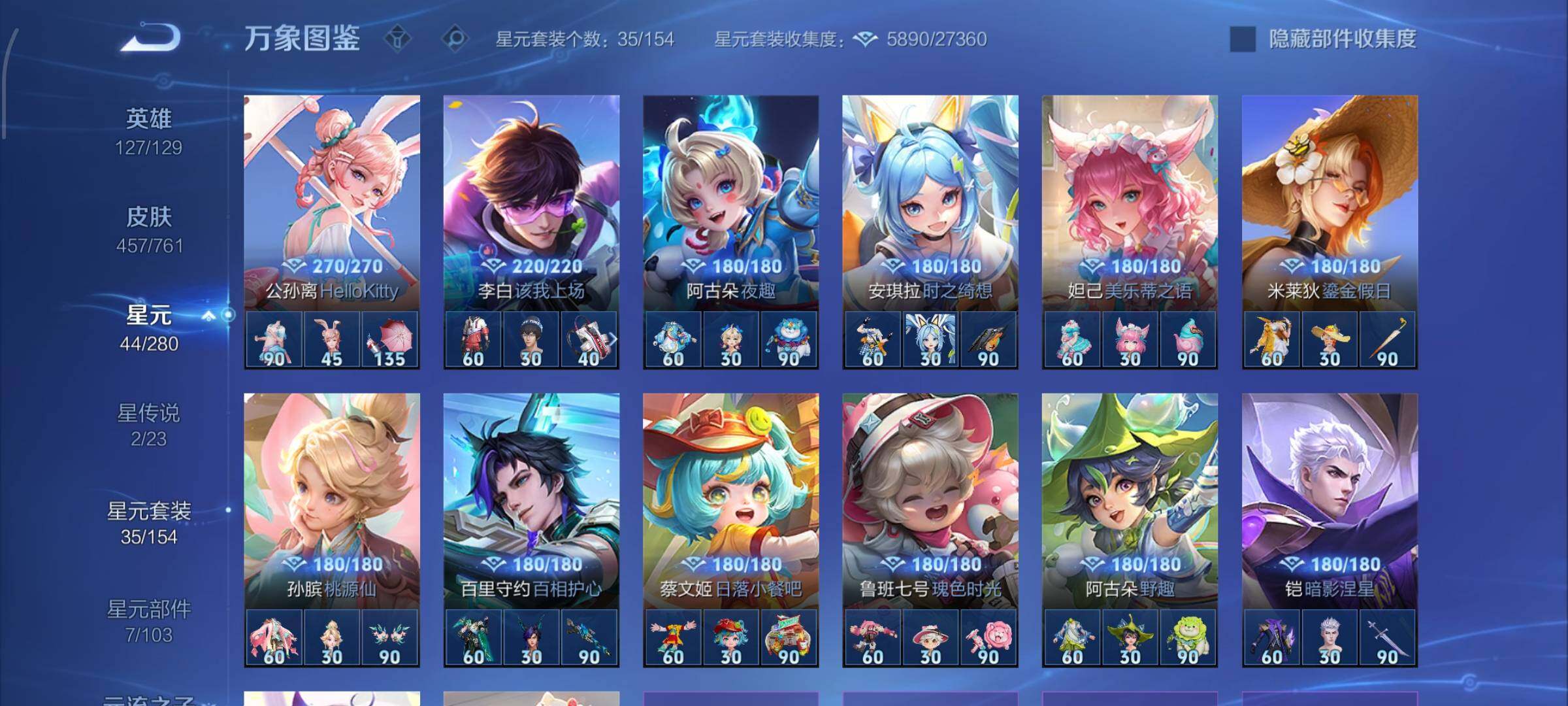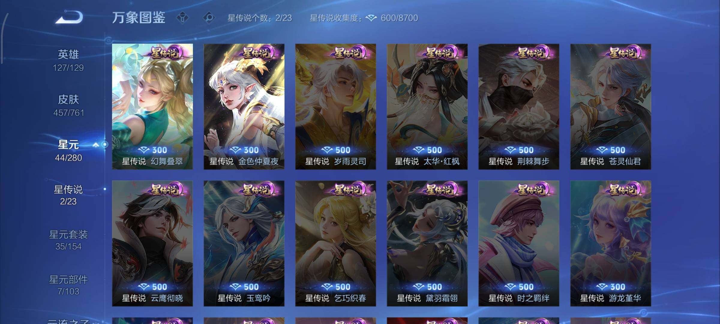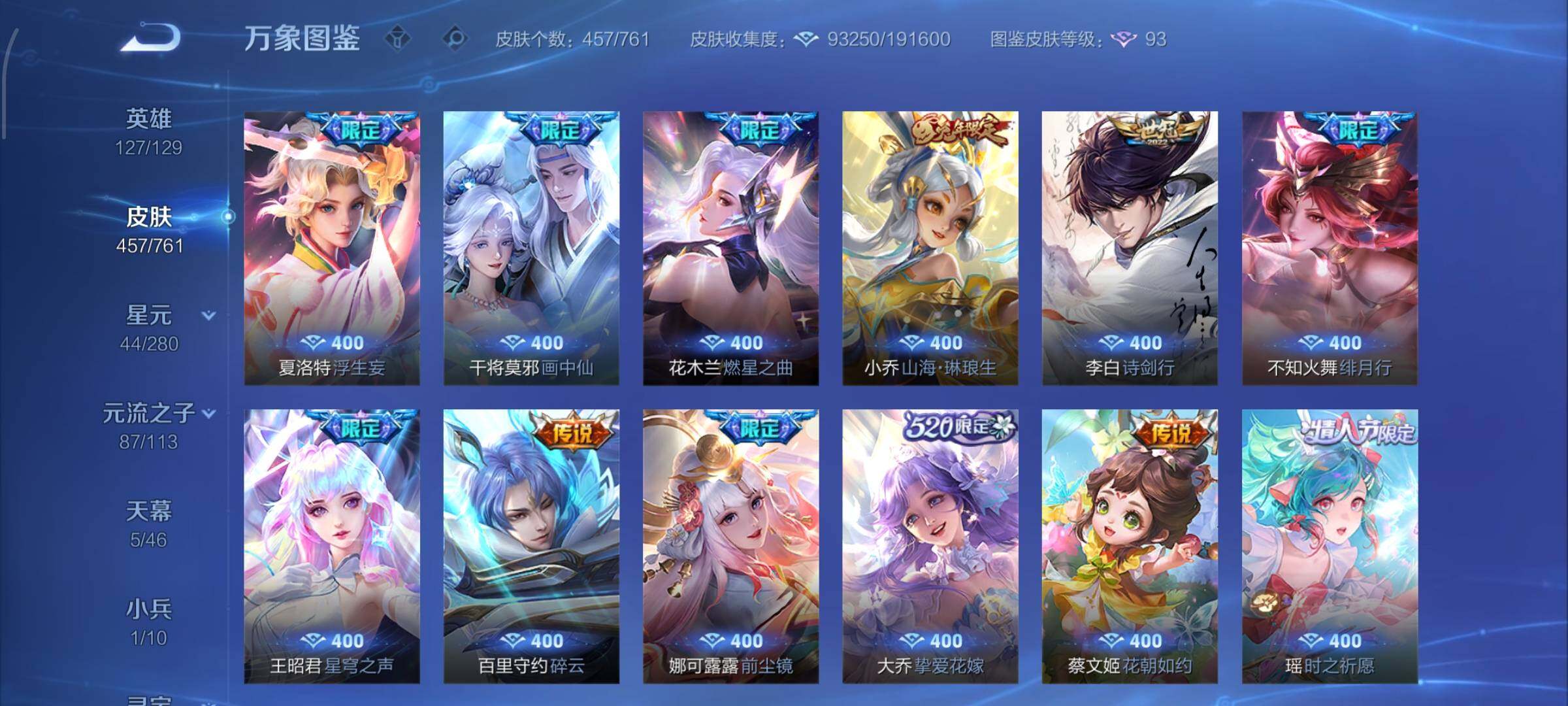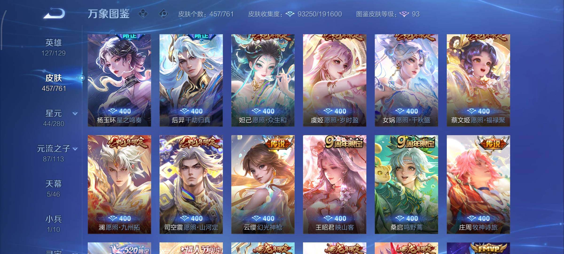 【精品v11·3典藏·1珍品无双·9无双·7珍品·全皮火舞·全皮朵利亚·全皮大乔·全皮瑶·全皮西施·全皮公孙离·馥梦繁花 按键·蛇年全限定·龙年全限定·小兵大耳狗甜茶会·棉花糖聚会天幕·春野列车天幕·春日相逢天幕·龙腾四海天幕·电音狂想天幕·可二次】w12539-安卓wx-127英雄-457皮肤-1王者印记-300铭文-贵族积分29w【无双贵族10】【3典藏·1珍品无双·9无双·7珍品·2