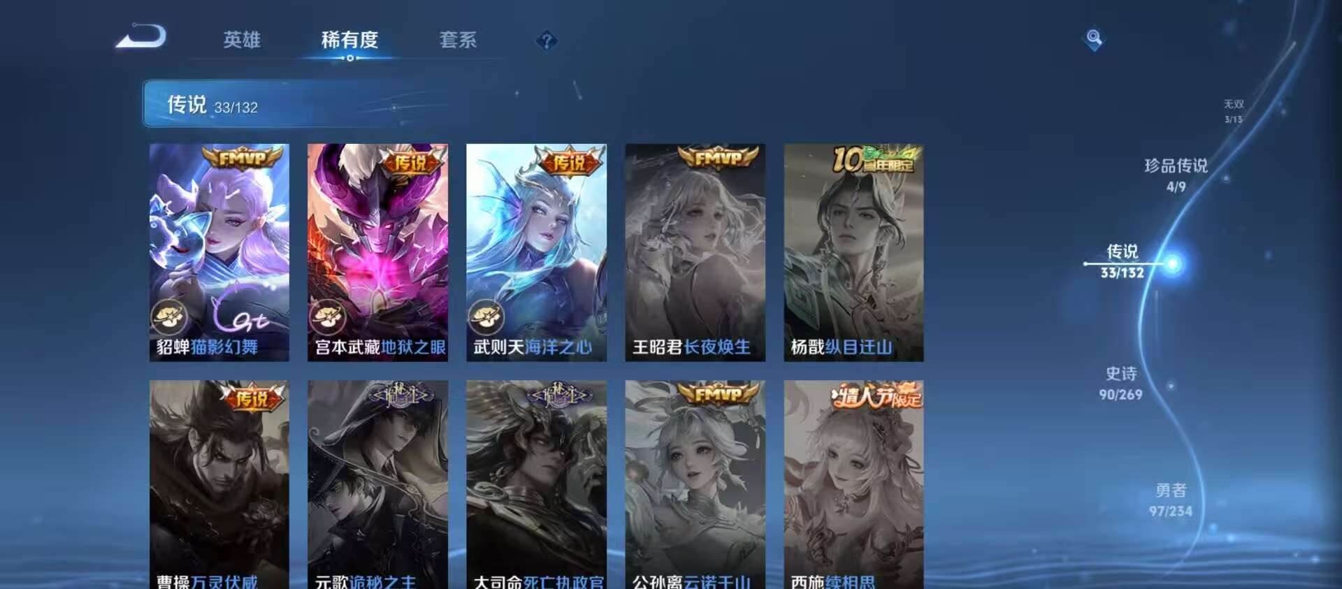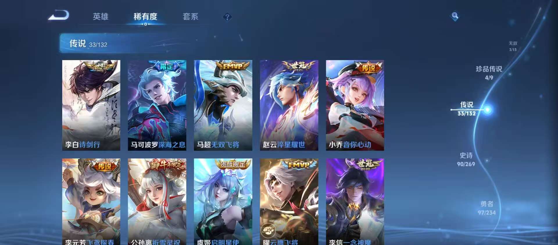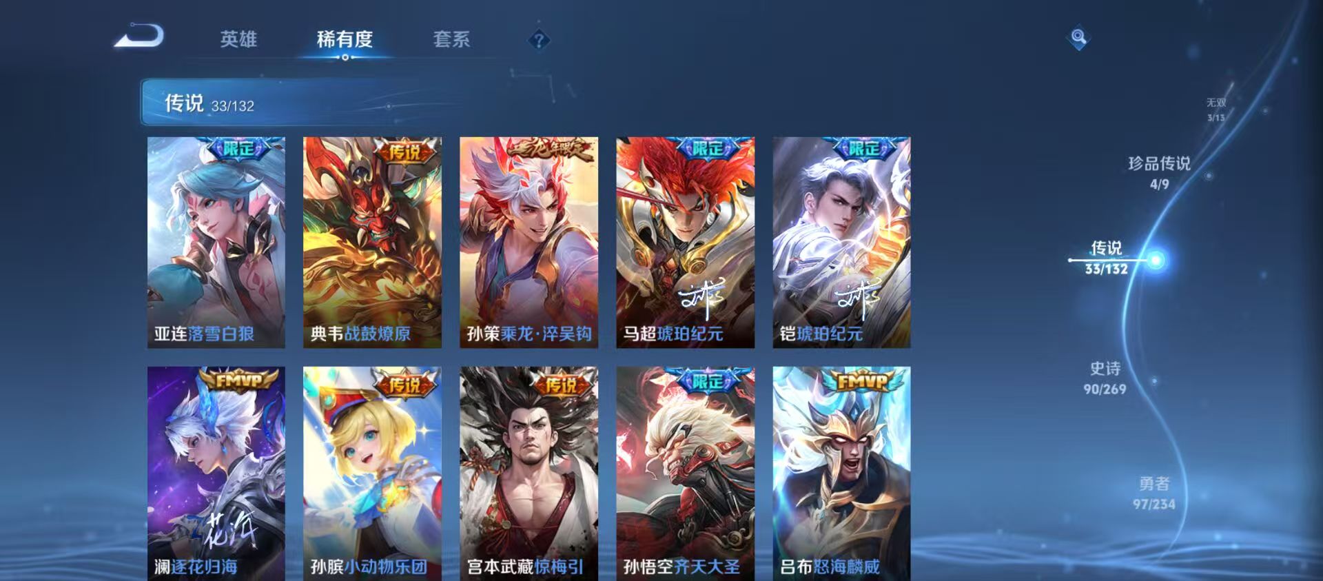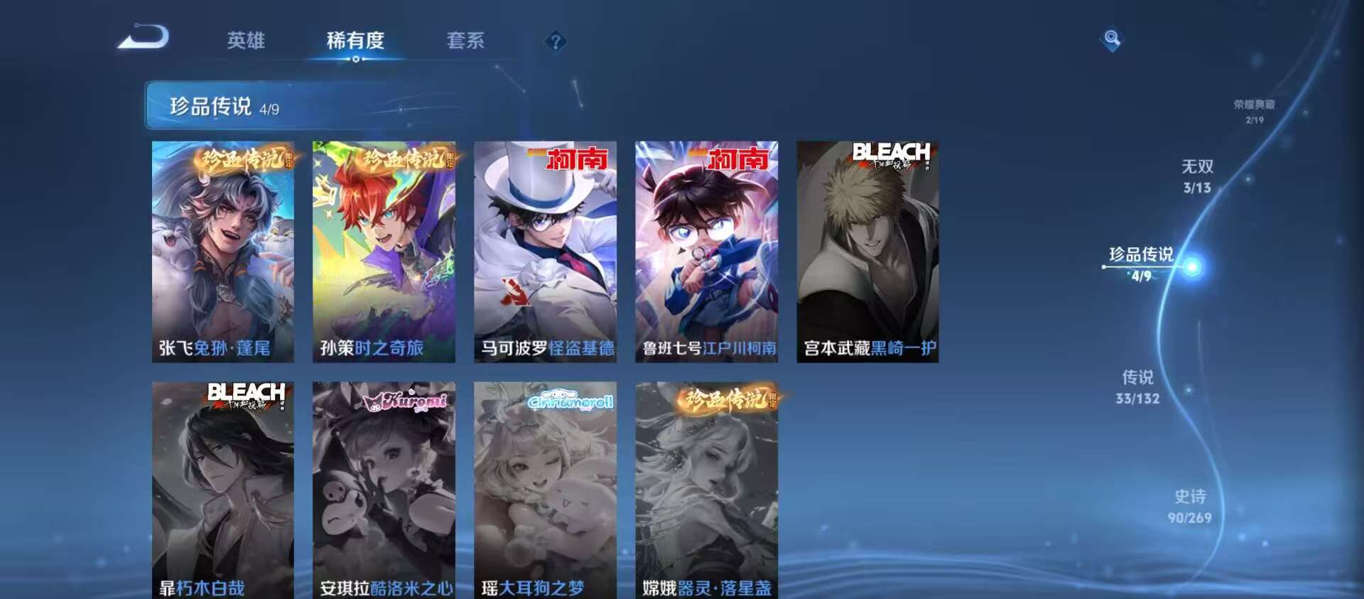 txwz30077 v9 254皮 2典藏 银白咏叹调,无限飓风号 3无双 神罪,器灵·螭龙剑,真我赫兹 4珍品 兔狲·蓬尾,时之奇旅,怪盗基德,江户川柯南 33史诗 一念神魔,飞鸢探春,神树通天,深海之息,千山共赴,九山相柳,猫影幻舞,愿照·众生和,愿照·九州拓,祈雪灵祝,无双飞将,海洋之心,玄雷天君,云鹰飞将,映山客,齐天大圣,鸣野蒿,霜北刀,启明星使,心动手记,音你心动,怒海麟威,诗剑行,落雪白狼,战鼓燎原,乘龙·淬吴钩,琥珀纪元,小动物乐团,琥珀纪元,逐花归海,惊梅引,淬星耀世,地狱之眼
