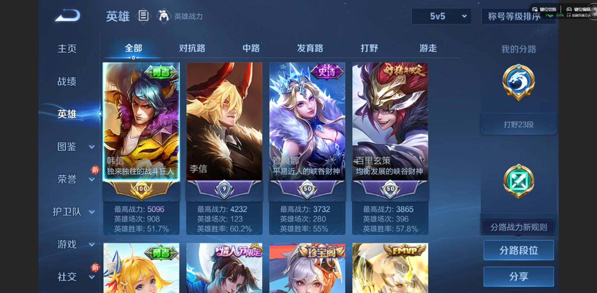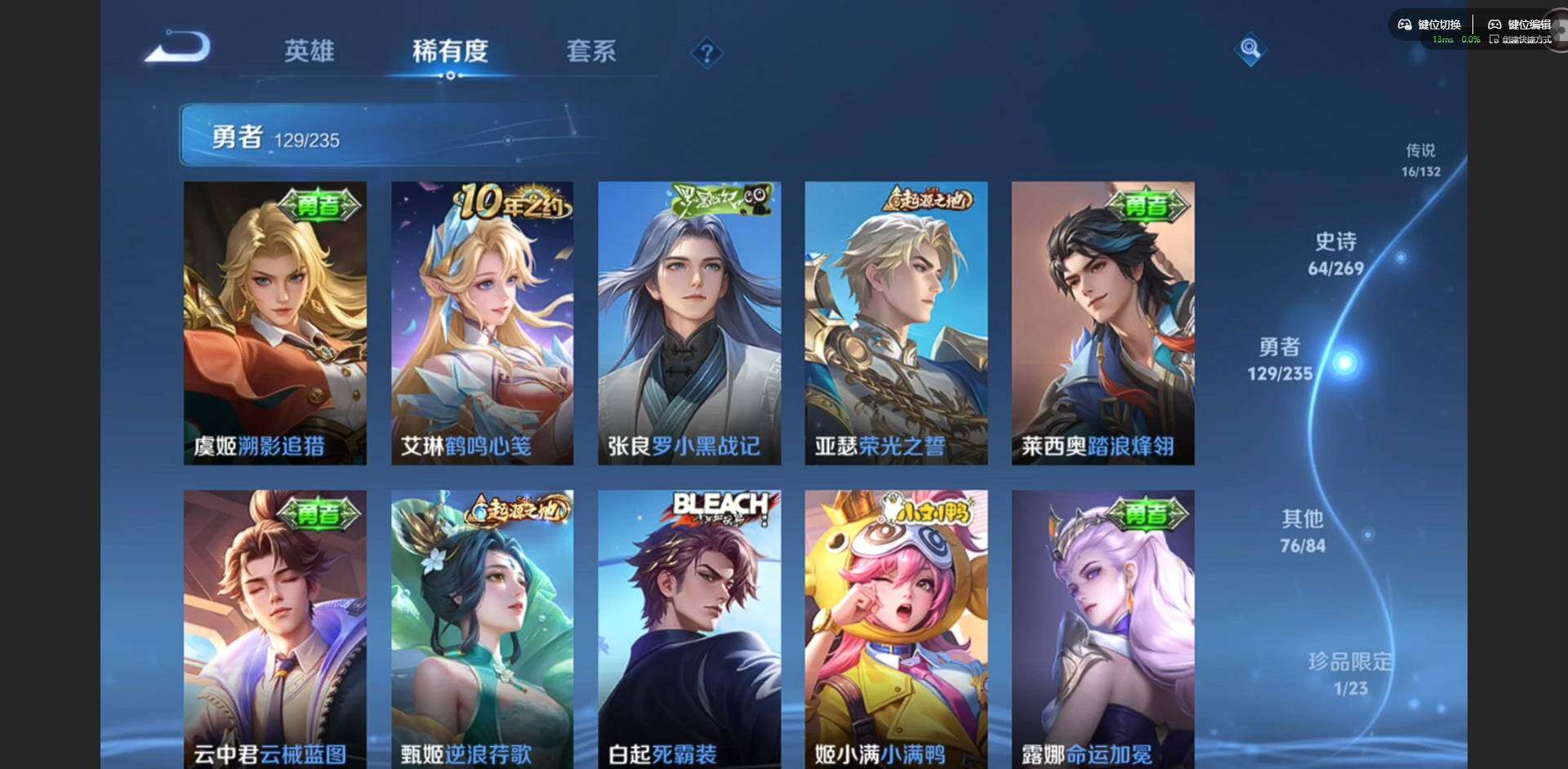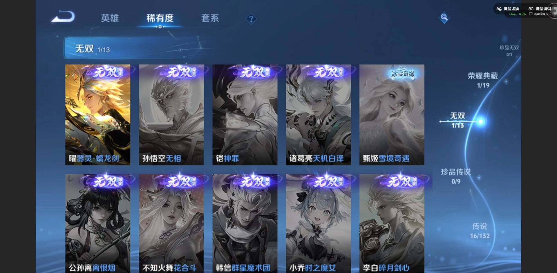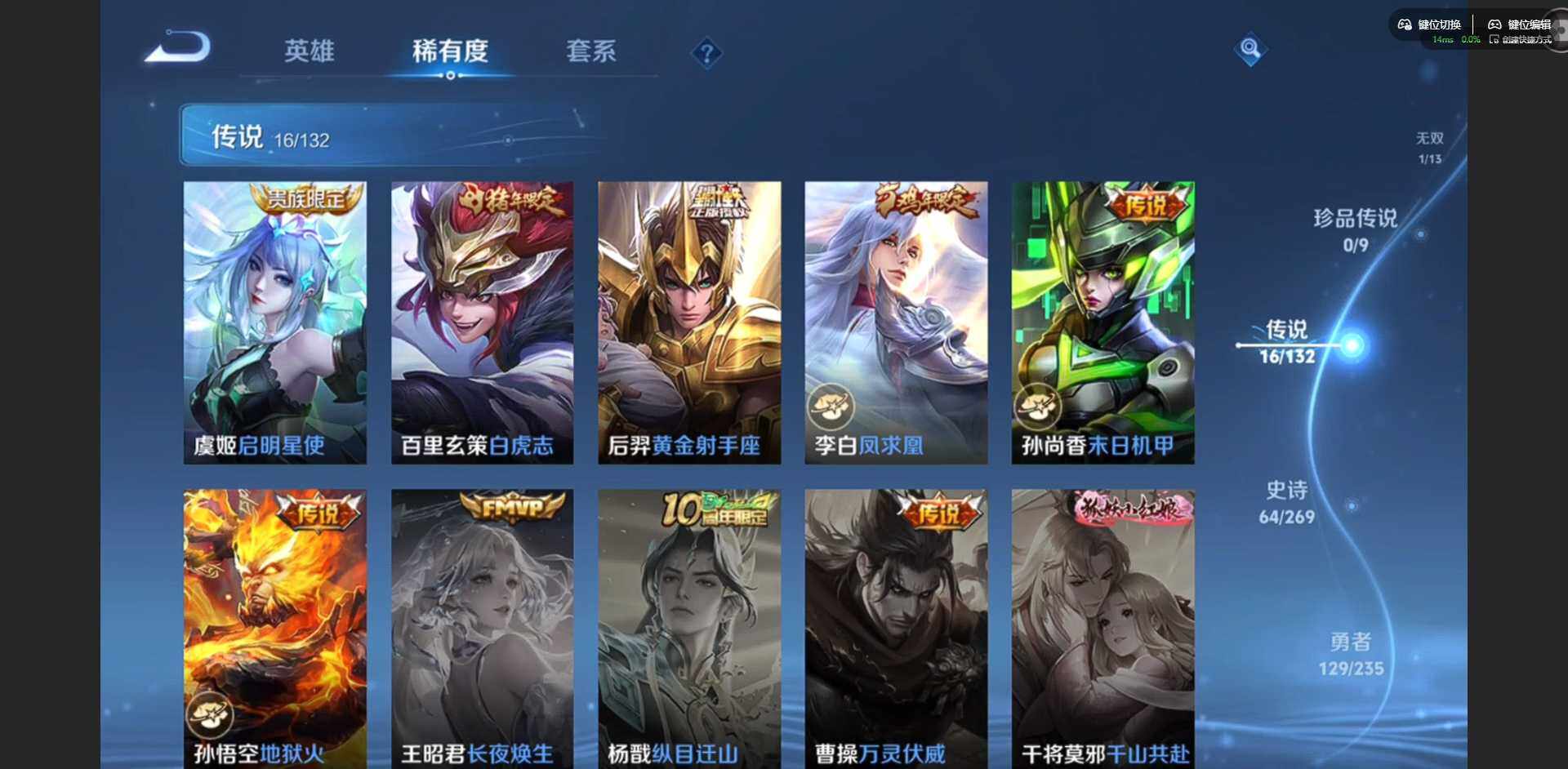 [16502255]【金标韩信】实名: 可修改 贵族等级: v8 英雄数: 128 皮肤数: 287 荣耀水晶: 九霄神辉 无双皮: 器灵·螭龙剑 传说皮: 黄金射手座炽阳神光末日机甲-孙尚香地狱火记忆之芯霜月吟澜逐花归海貂蝉曦玄引落雪白狼幻光神呛神树通天 限定皮: 遇见飞天游园惊梦梁祝白晶晶蜜橘之夏天狼狩猎者逐梦之影凤求凰白虎志如梦令-嫦娥至尊宝大圣娶亲寅虎·赤拳寅虎·心曲时之祈愿-瑶玉兔公主
