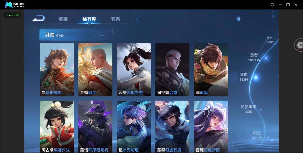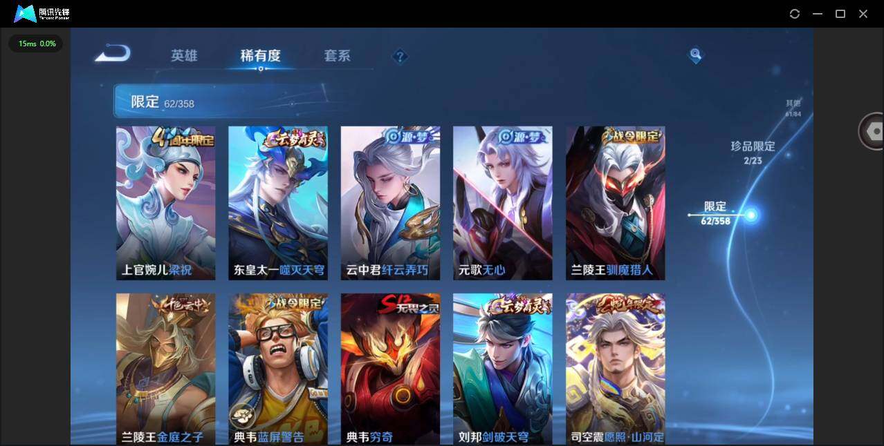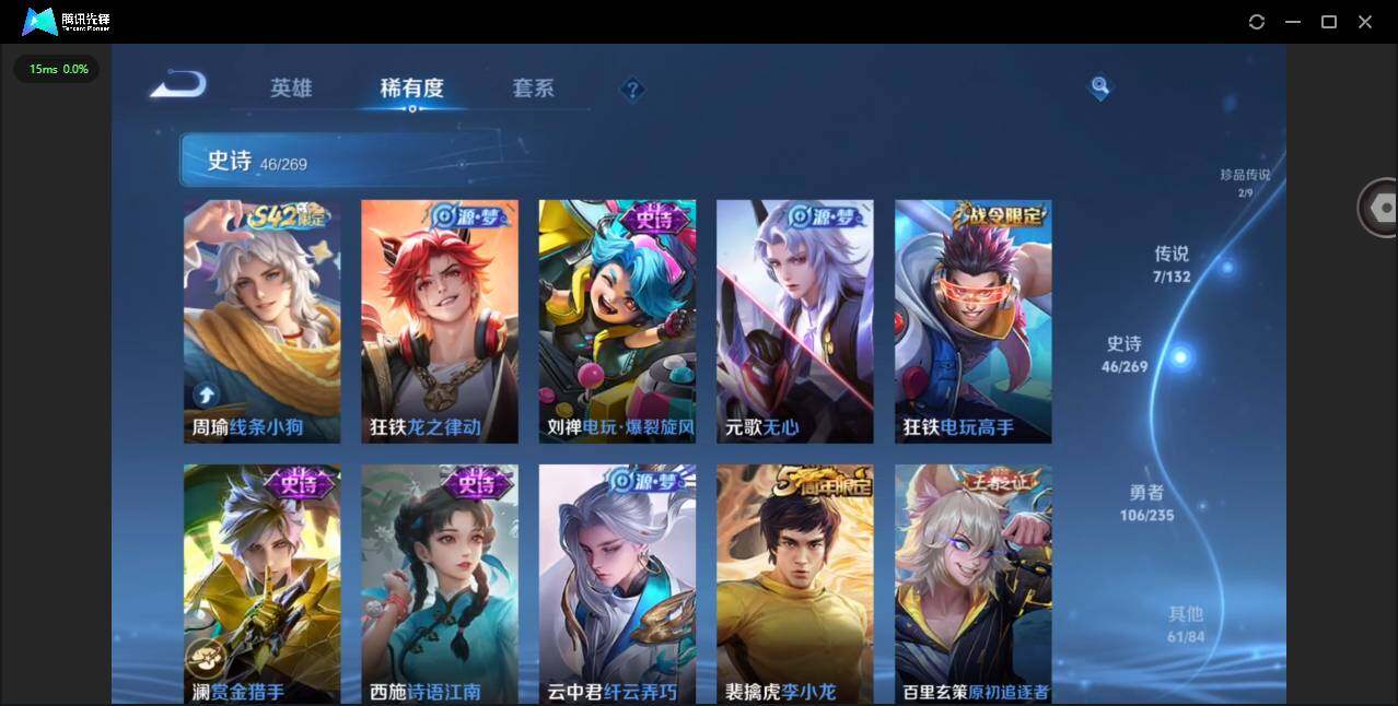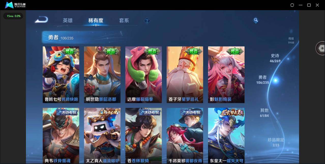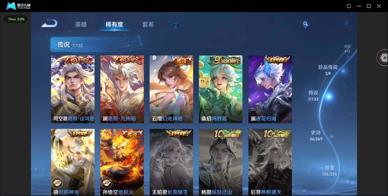 126英雄-222皮肤-实名: 可修改 贵族等级: v7 英雄数: 126 皮肤数: 222 珍品传说: 怪盗基德器灵·落星盏 星传说: 幽冥火 传说皮: 炽阳神光地狱火澜逐花归海幻光神呛 限定皮: 李小龙梁祝瑞麟志一生所爱大圣娶亲鸣野蒿愿照·山河定愿照·九州拓