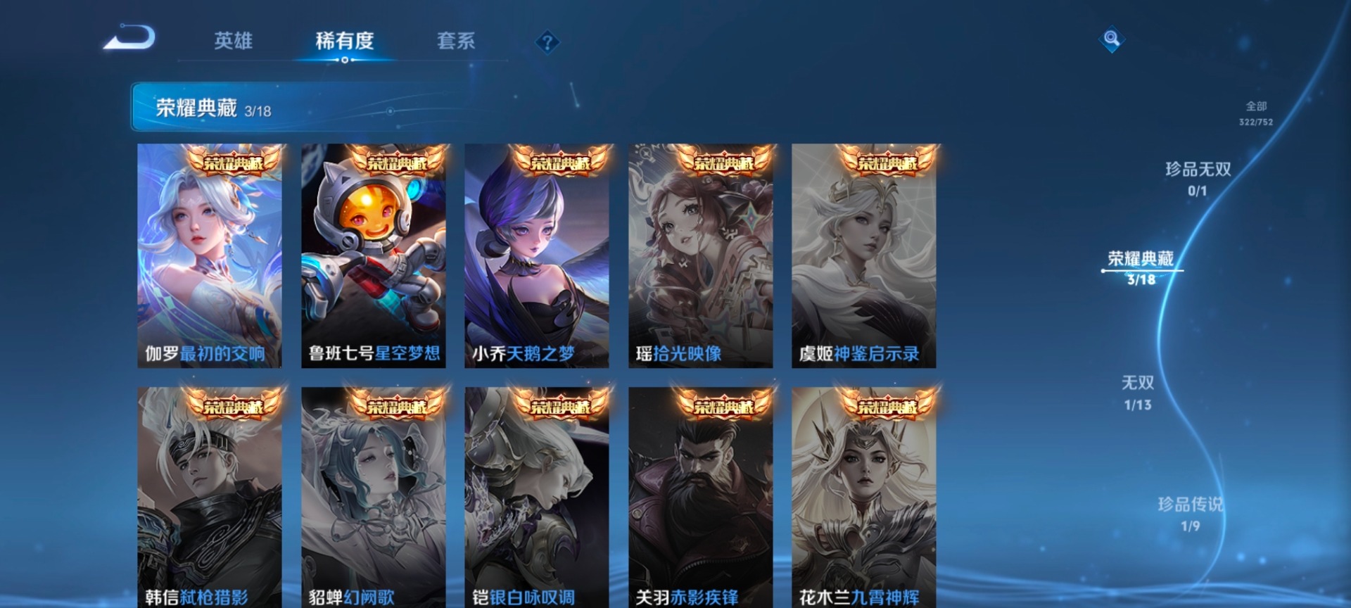 v8 3典藏 1无双 1珍品传说 16传说 127英雄 322皮肤 可修改实名 【英雄全皮】敖隐全皮蚩奼全皮钟馗全皮 【稀有英雄】敖隐小龙人大司命嬴政始皇帝韩信韩跳跳夏洛特夏师傅艾琳橘右京橘子娜可露露鸟人不知火舞赵云金蝉唐僧戈娅 【荣耀水晶】最