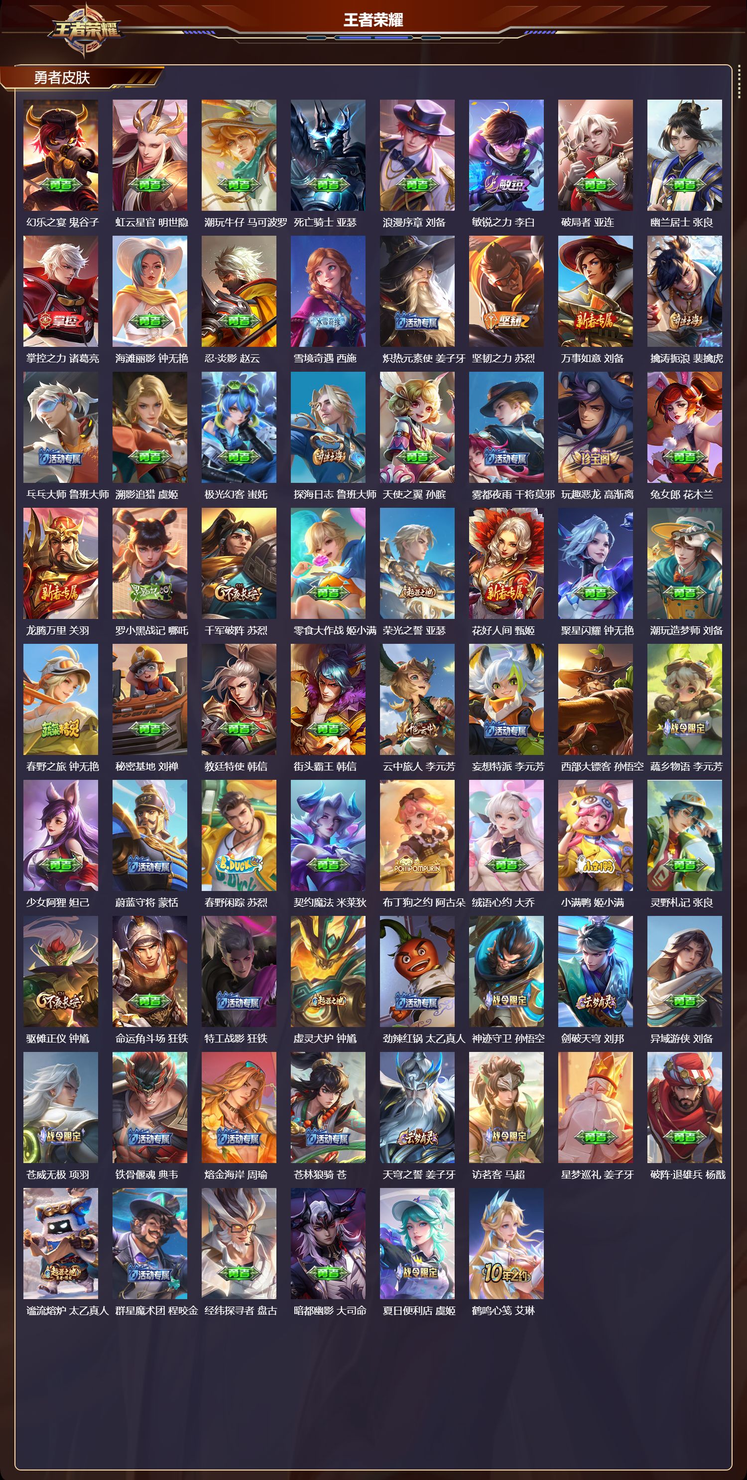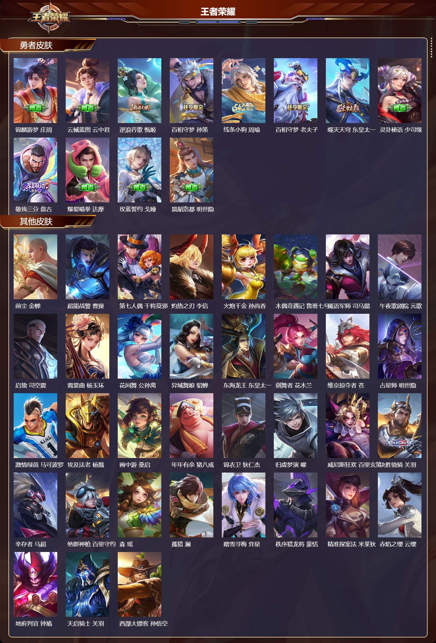 安卓qq/最强王者/255皮肤/126英雄/1典藏/0珍品无双/0无双/0珍品传说/12传说/83史诗/7稀有英雄【1 典藏皮肤】赤影疾锋 关羽【12 传说皮肤】胖达荣荣 梦奇云鹰飞将 曜地狱之眼 宫本武藏炽阳神光 镜时之恋人 刘备黄金狮子座 达摩久胜战神 干将莫邪一念神魔 李信超时空战士 狄仁杰愿照·九州拓 澜愿照·山河定 司空震鸣野蒿 桑启【83 史诗皮肤】末日机甲
