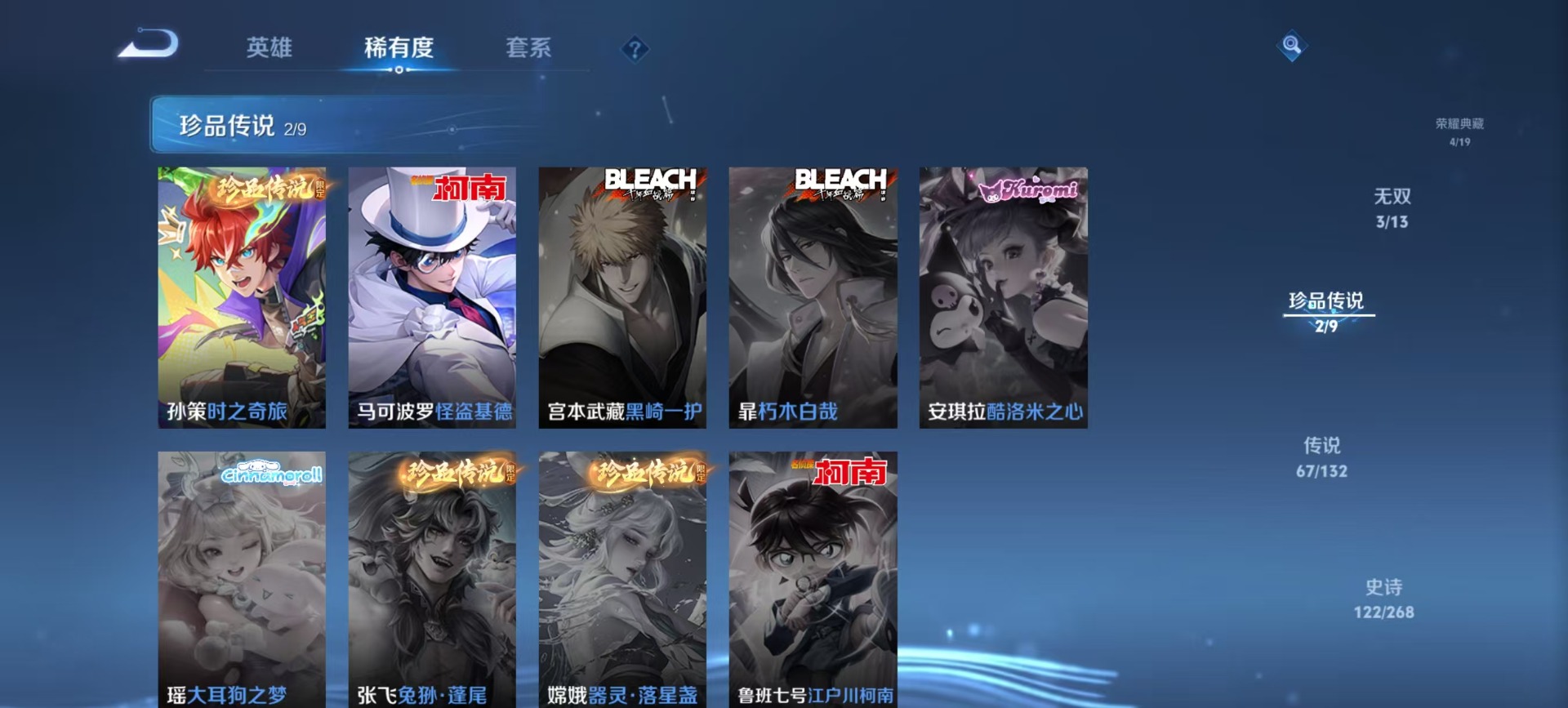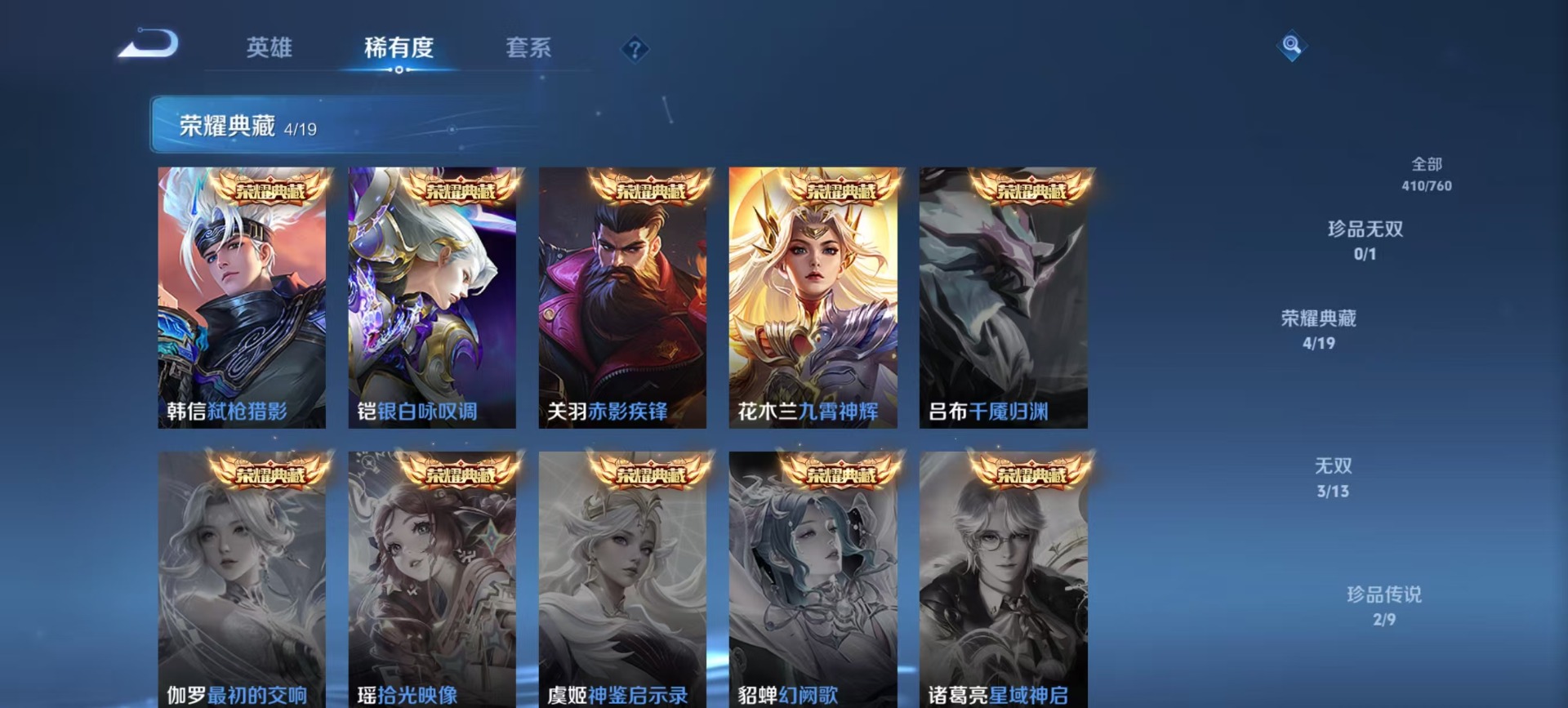 128英雄-410皮肤-[]v10 4典藏 3无双 2珍品传说 67传说 128英雄 410皮肤 可修改实名 男号 【英雄全皮】马超全皮李信全皮司空震全皮澜全皮敖隐全皮空空儿全皮孙权全皮蚩奼全皮海诺全皮司马懿全皮影全皮大禹全皮 【稀有英雄】敖隐小龙人大司命嬴政始皇帝韩信