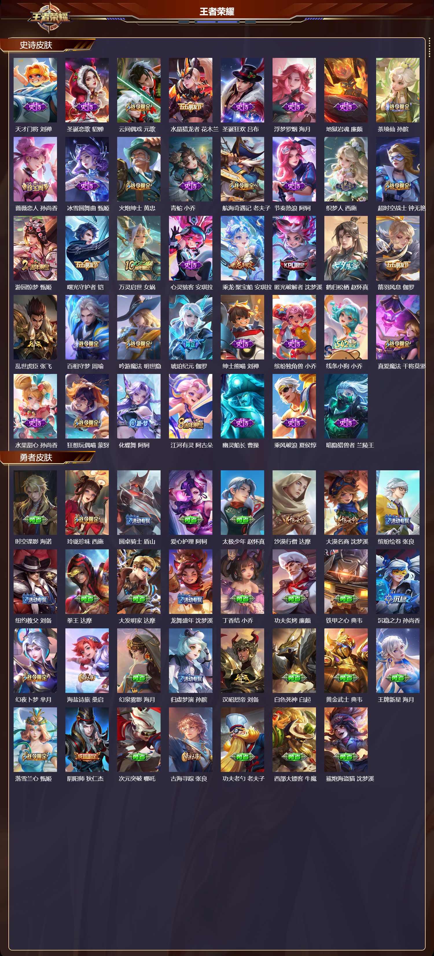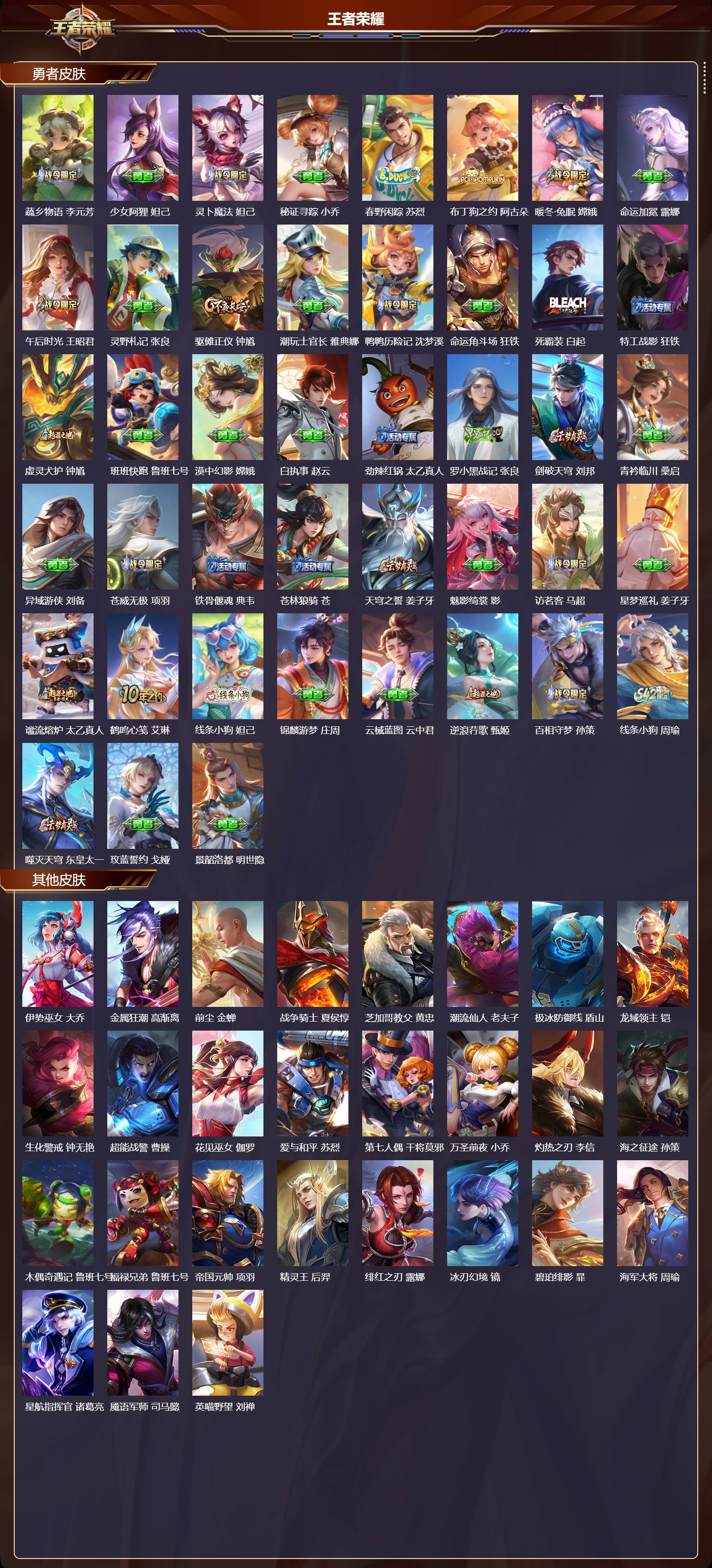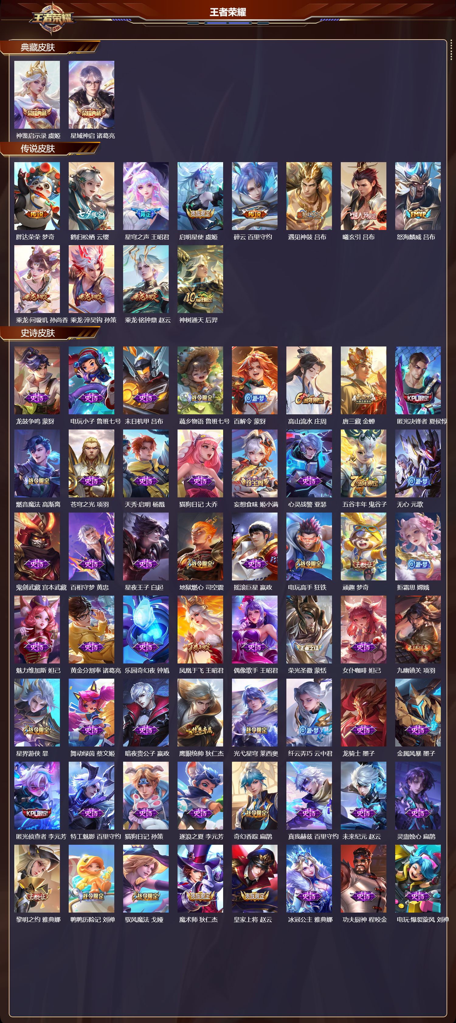 安卓微信/最强王者/317皮肤/127英雄/2典藏/0珍品无双/0无双/0珍品传说/12传说/95史诗/8稀有英雄【2 典藏皮肤】神鉴启示录 虞姬星域神启 诸葛亮【12 传说皮肤】胖达荣荣 梦奇鹤归松栖 云缨星穹之声 王昭君启明星使 虞姬碎云 百里守约遇见神鼓 吕布曦玄引 吕布怒海麟威 吕布乘龙·问璇玑 孙尚香乘龙·淬吴钩 孙策乘龙·铭钟鼎 赵云神树通天 后羿【95 史