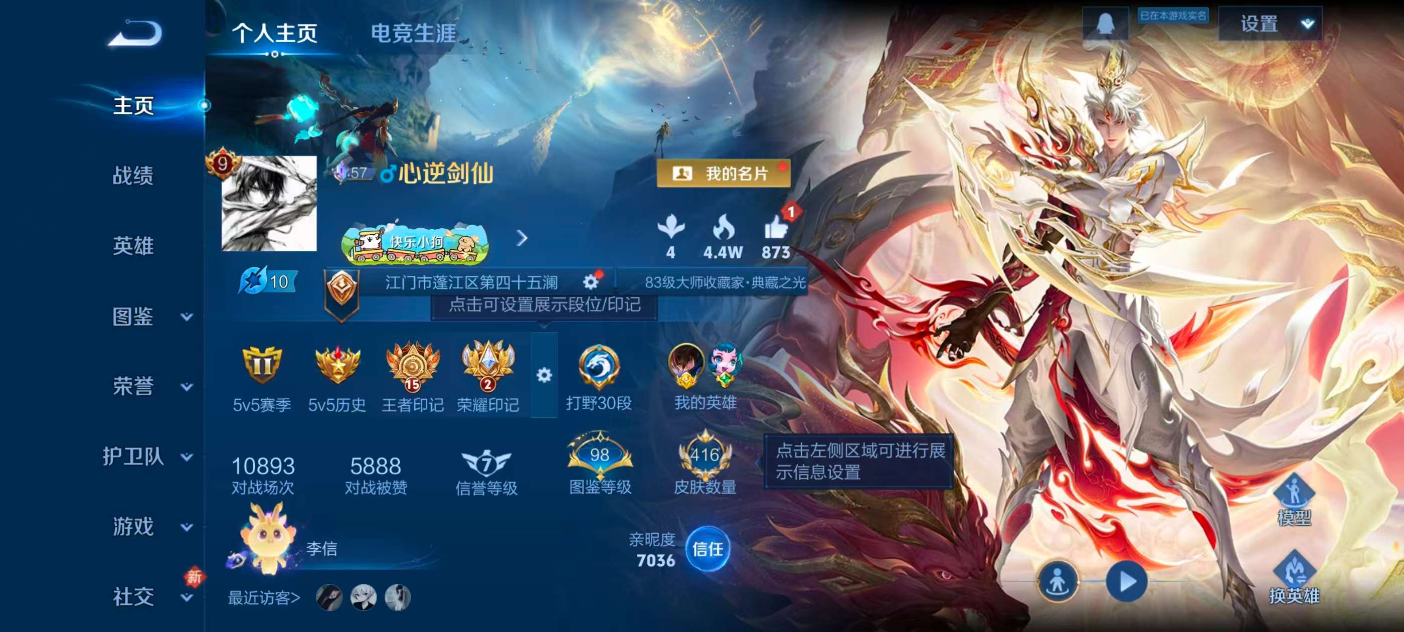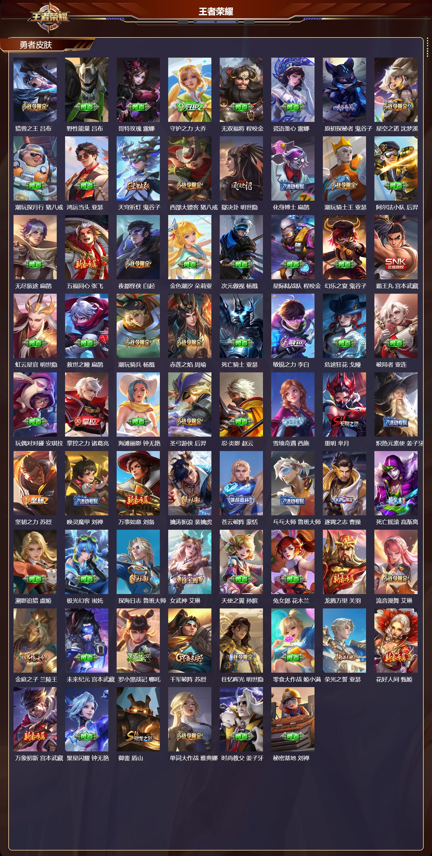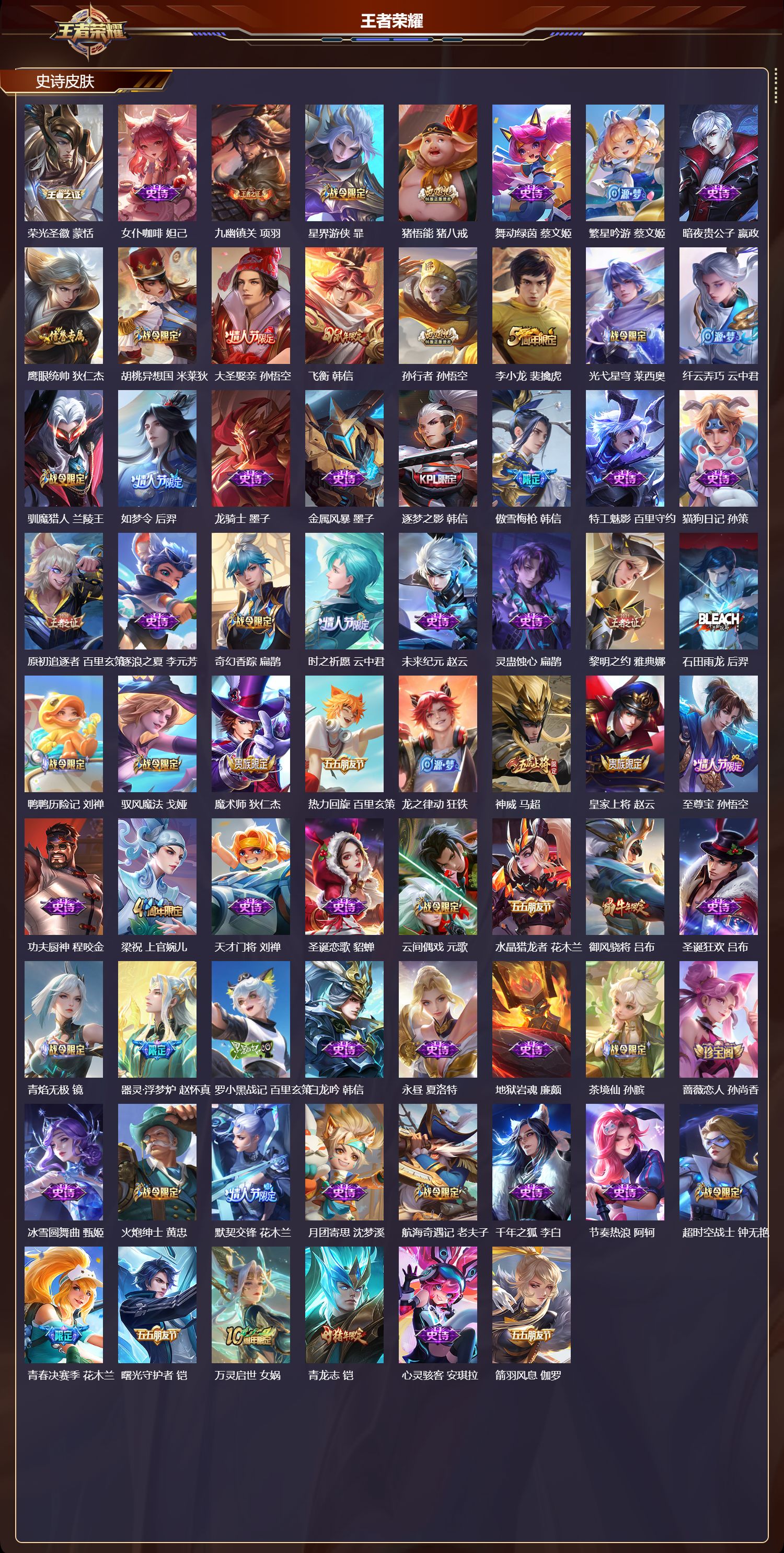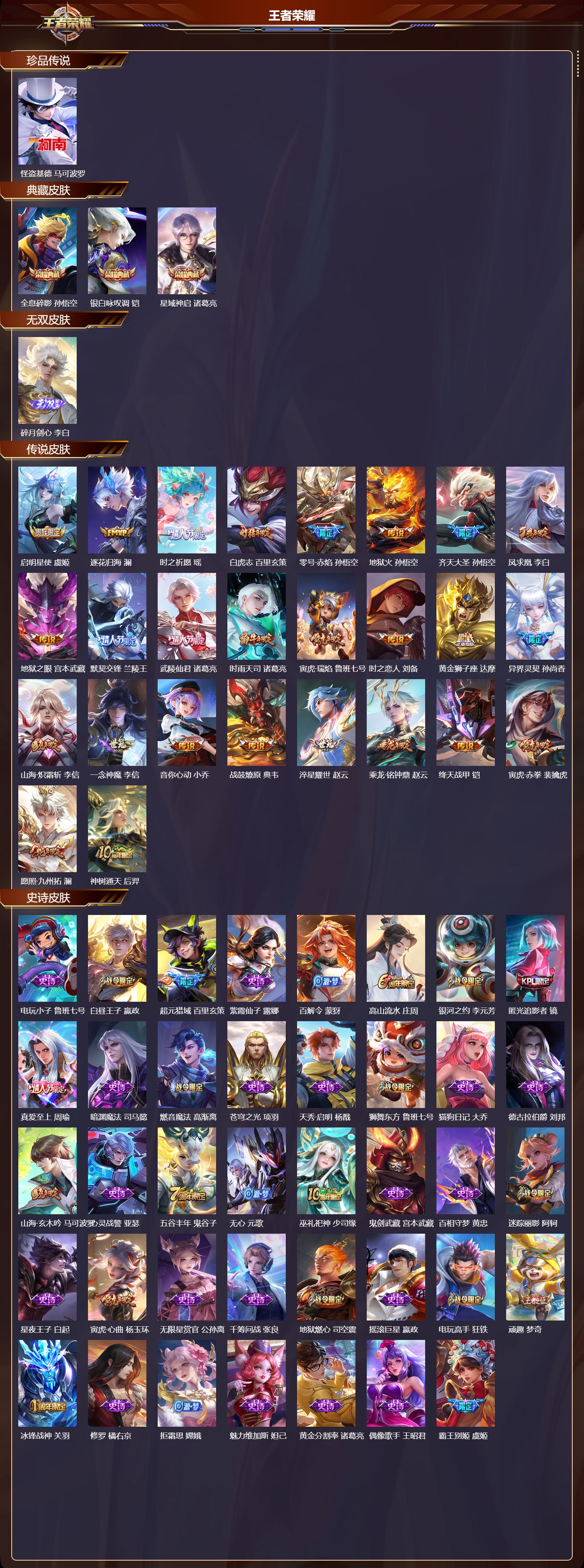 安卓qq/至尊星耀/416皮肤/128英雄/3典藏/0珍品无双/1无双/1珍品传说/26传说/124史诗/9稀有英雄【1 珍品传说】怪盗基德 马可波罗【3 典藏皮肤】全息碎影 孙悟空银白咏叹调 铠星域神启 诸葛亮【1 无双皮肤】碎月剑心 李白【26 传说皮肤】启明星使 虞姬逐花归海 澜时之祈愿 瑶白虎志 百里玄策零号·赤焰 孙悟空地狱火 孙悟空齐天大圣 孙悟空凤求凰 李白