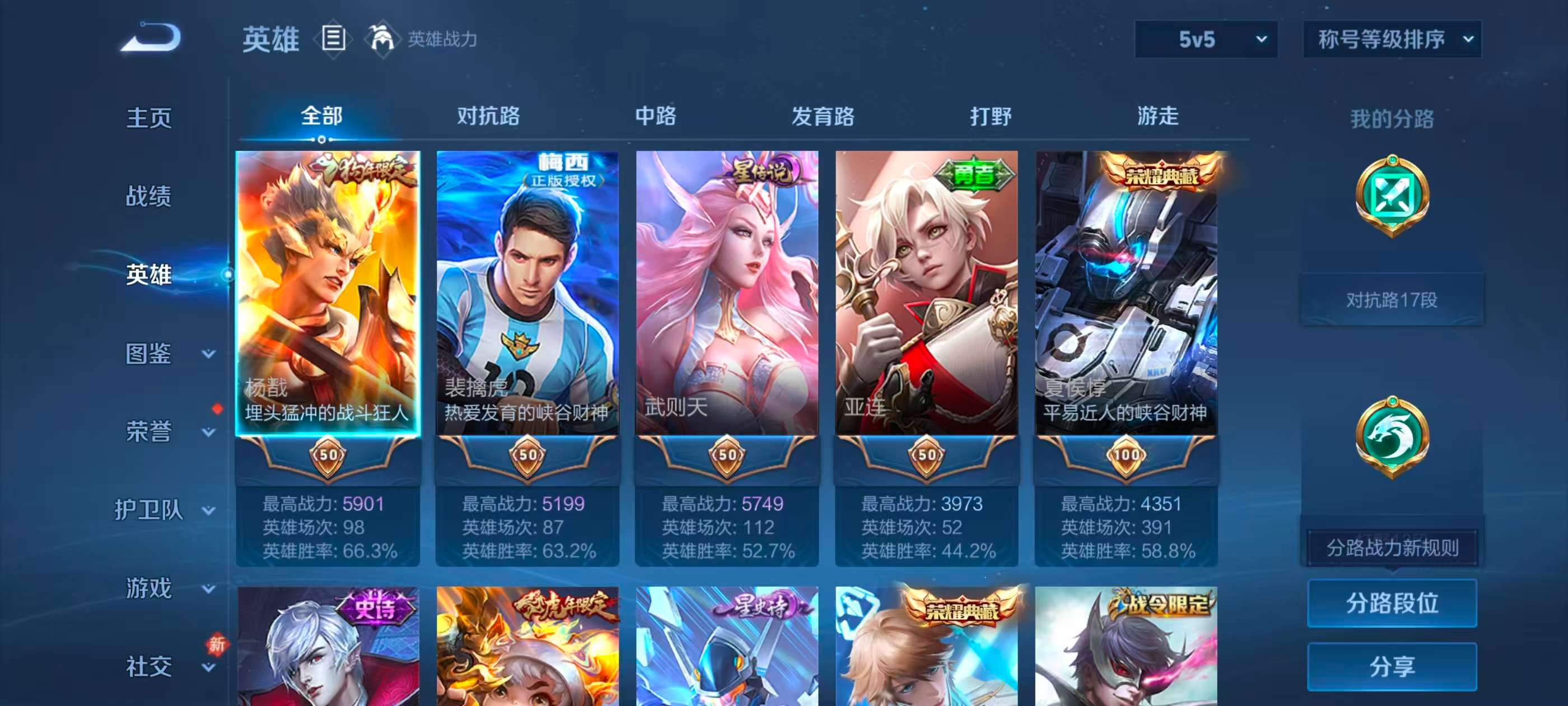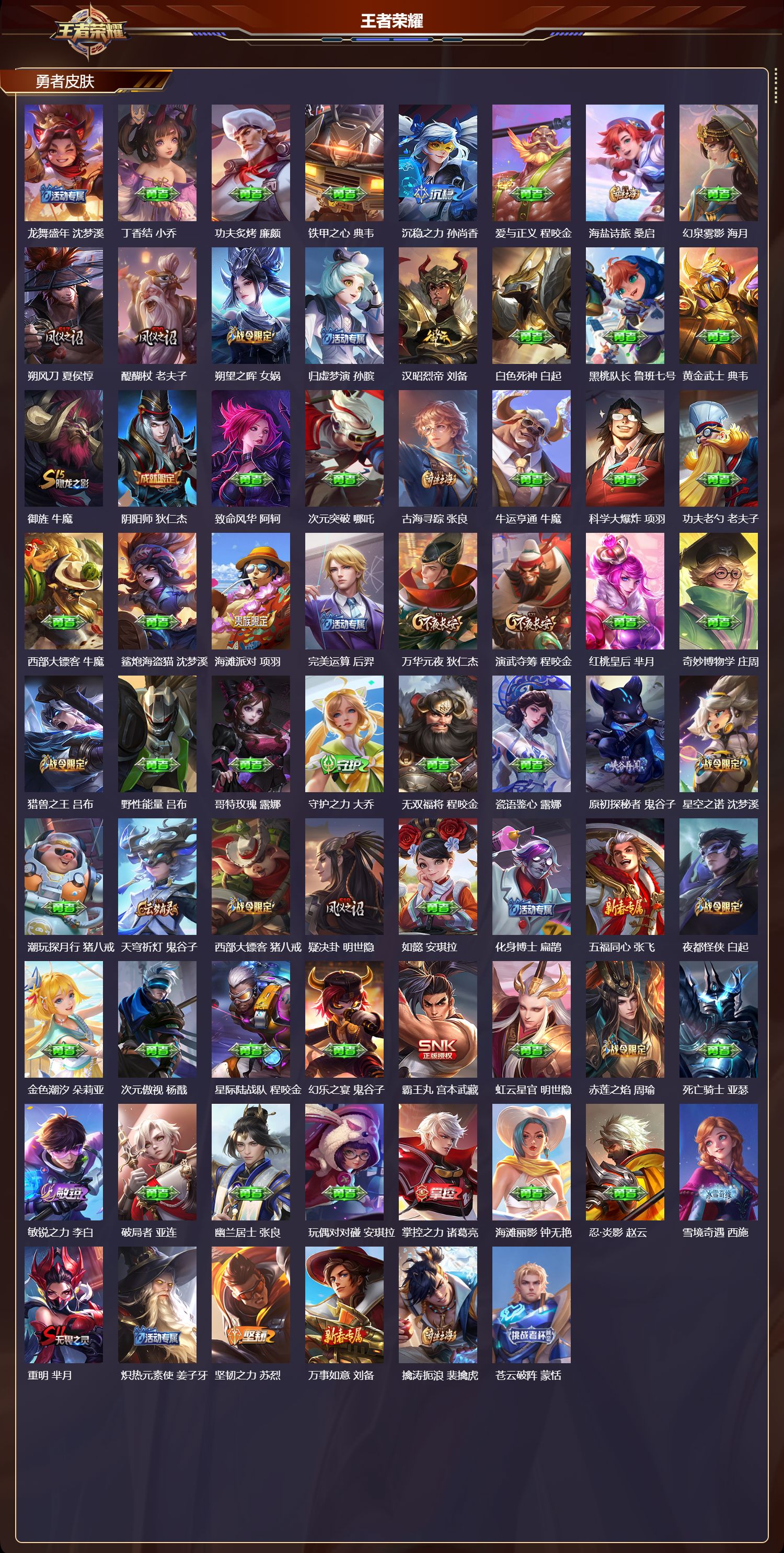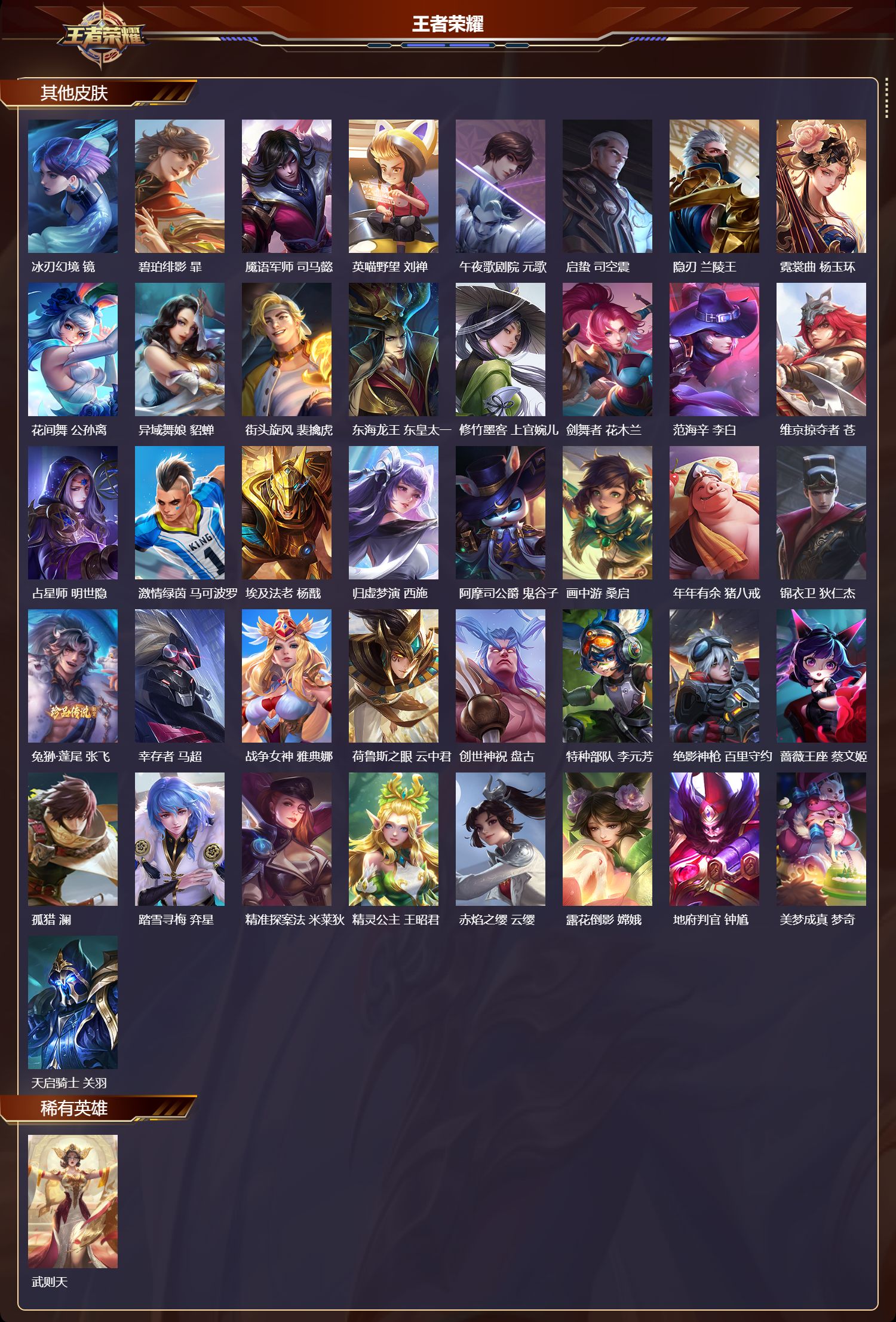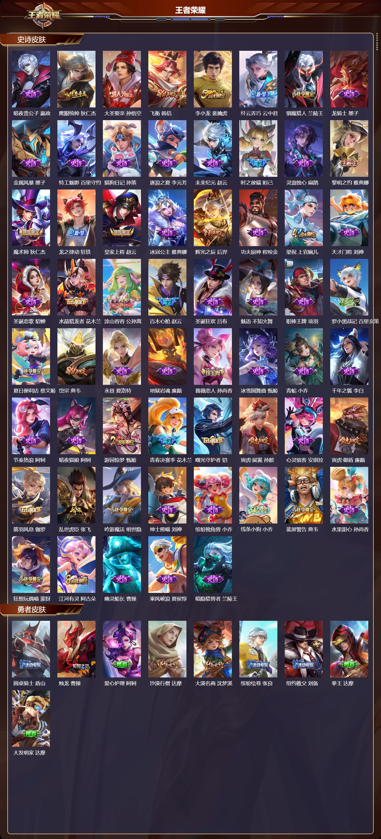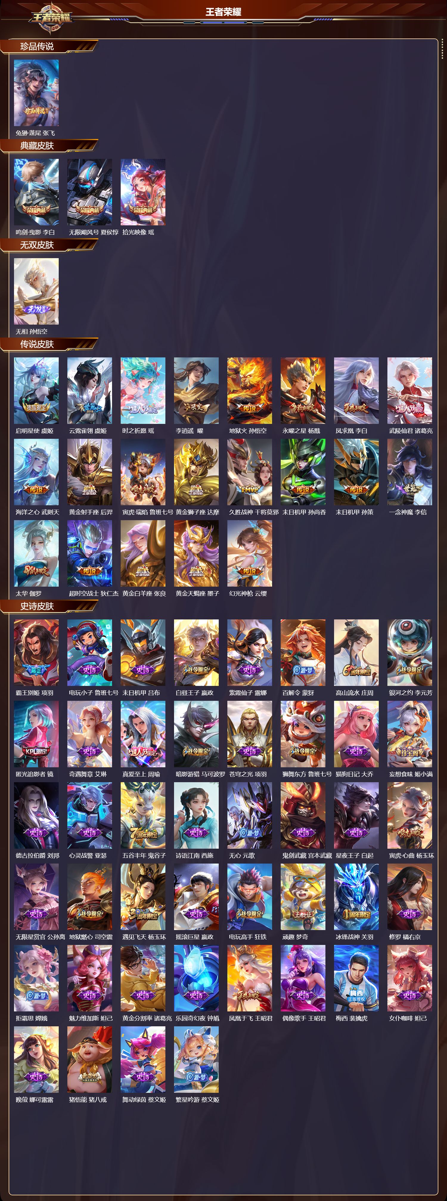 安卓qq/荣耀王者/320皮肤/128英雄/3典藏/0珍品无双/1无双/1珍品传说/21传说/105史诗/9稀有英雄【1 珍品传说】兔狲·蓬尾 张飞【3 典藏皮肤】鸣剑·曳影 李白无限飓风号 夏侯惇拾光映像 瑶【1 无双皮肤】无相 孙悟空【21 传说皮肤】启明星使 虞姬云霓雀翎 虞姬时之祈愿 瑶李 曜地狱火 孙悟空永曜之星 杨戬凤求凰 李白武陵仙君 诸葛亮海洋之心