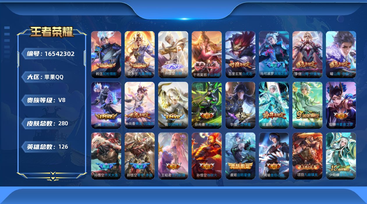 [16542302]v8 2典藏 1无双 20传说 126英雄 280皮肤 可修改实名 男号 【英雄全皮】李信全皮孙权全皮 【稀有英雄】大司命嬴政始皇帝韩信韩跳跳夏洛特夏师傅艾琳橘右京橘子娜可露露鸟人不知火舞赵云金蝉唐僧戈娅 【荣耀水晶】九霄神辉木兰典藏弑呛猎影韩信典藏 【无双皮】无相 【传说皮】乘龙·问璇玑孙尚香年限神树通天千山共赴山海·炽霜斩李信年限零号·赤焰地狱火仲夏夜之梦大飞蛾末日机甲-孙尚香绿蚂蚱一念神魔炽阳神光音你心动-周瑜乞巧织情山海·苍雷引电光曜子澜逐花归海 【珍宝阁皮】妄想食味优雅恋人玩趣恶龙 【赛季/战令皮】噬灭天穹s37古海寻踪s33星界游侠海盐诗旅s30擒涛扼浪s31探海日志s32顽趣-梦奇地狱燃心剑破天穹s35天穹祈灯s34天穹之誓s36暖冬·兔眠穷奇s12御狮s13御霄s14御旌s15御銮s16朔风刀s17混沌棋s18疑决卦s19醍醐杖s20原初探秘者s21万华元夜s22演武夺筹s23驱傩正仪s24千军破阵s25西部大镖客-猪八戒暗影游猎游乐娃子潮玩骑士王云间偶戏神迹守卫-墨子航海奇遇记火炮绅士沙漠行僧s26幻夜卜梦金庭之子s27大漠名商s28云中旅人s29 【史诗皮】化蝶舞龙之律动光弋星穹茶境仙星界战将傩神司九幽镇关万灵启世巫礼祀神紫霞仙子苍穹之光电玩小子小书包黄金分割率特工魅影千年之狐蒙恬荣光圣徽龙骑士小龙虾冰冠公主江河有灵暗夜猫娘电玩·爆裂旋风猫狗日记-孙策猫狗日记-大乔乱世虎臣修罗女仆咖啡摇滚巨星水果甜心绅士熊喵天才门将星夜王子心灵骇客德古拉伯爵暗隐猎兽者幽灵船长鬼剑武藏心灵战警天秀·启明舞动绿茵地狱岩魂纤云弄巧繁星吟游呼啦呼啦乘风破浪逐浪之夏水晶猎龙者金属风暴原初追逐者圣诞狂欢圣诞恋歌鹰眼统帅魅力维加斯黎明之约赏金猎手无心未来纪元-赵云 【限定皮】逐霄战戟鸣野蒿至尊宝白虎志电光耗子时雨天司水龙头遇见飞天高山流水齐天大圣五谷