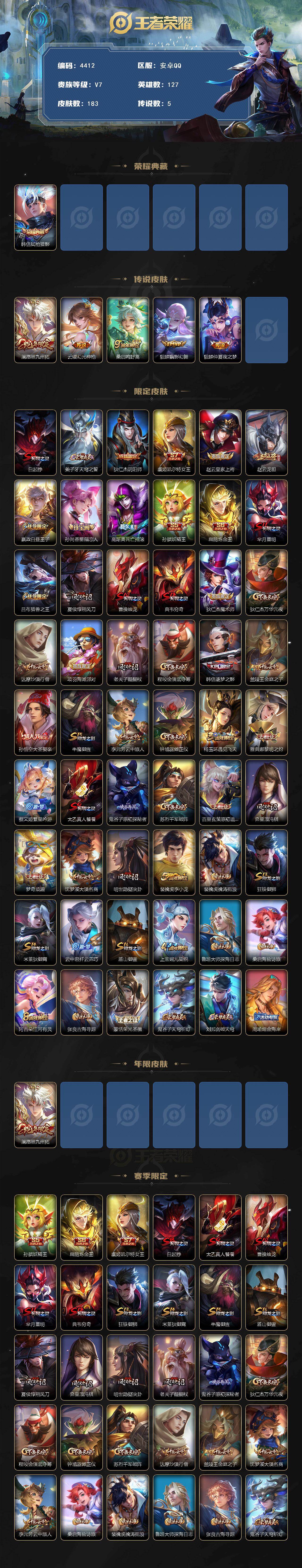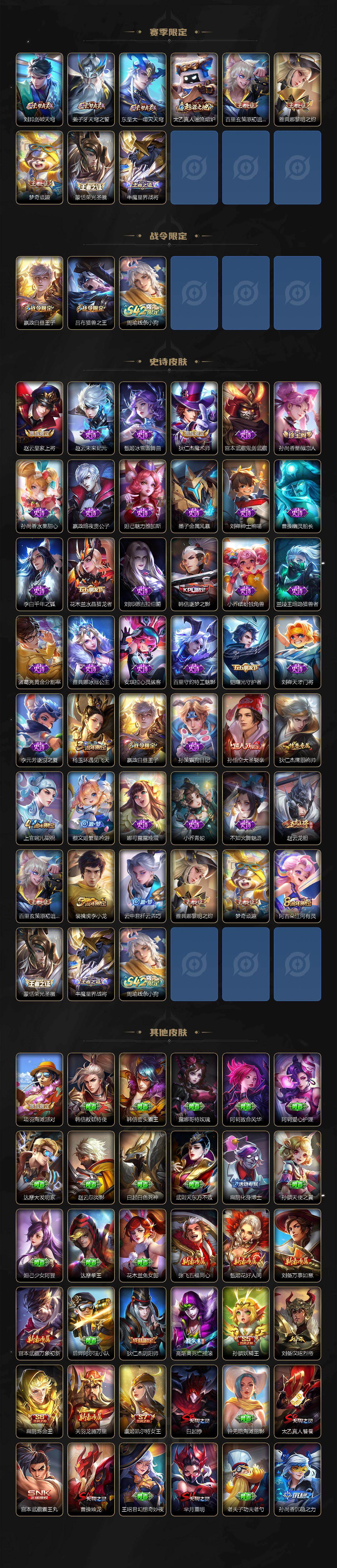 安卓q-v7-至尊星耀iii段位-127英雄-183皮肤-1典藏皮肤-5传说-44史诗 【英雄全皮】:影全皮 【荣耀典藏】:韩信弑呛猎影 【传说皮肤】:澜愿照九州拓,云缨幻光神呛,桑启鸣野蒿,貂蝉猫影幻舞,貂蝉仲夏夜之梦 【限定皮肤】:白起狰,姜子牙天穹之誓,狄仁杰阴阳师,虞姬凯尔特女王,赵云皇家上将,赵云龙胆,嬴政白昼王子,孙尚香蔷薇恋人,高渐离死亡摇滚,孙膑妖精王,扁鹊炼金王,芈月重明,吕布猎兽之王,夏侯惇朔风刀,曹操烛龙,典韦穷奇,狄仁杰魔术师,狄仁杰万华元夜,达摩沙漠行僧,项羽海滩派对,老夫子醍醐杖,程咬金演武夺筹,韩信逐梦之影,兰陵王金庭之子,孙悟空大圣娶亲,牛魔御旌,李元芳云中旅人,钟馗驱傩正仪,杨玉环遇见飞天,雅典娜黎明之约,蔡文姬繁星吟游,太乙真人饕餮,鬼谷子原初探秘者,苏烈千军破阵,百里玄策原初追逐者,弈星混沌棋,梦奇顽趣,沈梦溪大漠名商,明世隐疑决卦,裴擒虎李小龙,裴擒虎擒涛扼浪,狂铁御狮,米莱狄御霄,云中君纤云弄巧,盾山御銮,上官婉儿梁祝,鲁班大师探海日志,桑启海盐诗旅,阿古朵江河有灵,张良古海寻踪,蒙恬荣光圣徽,鬼谷子天穹祈灯,刘邦剑破天穹,周瑜熔金海岸 【年限皮肤】:澜愿照九州拓 【赛季限定】:孙膑妖精王,扁鹊炼金王,虞姬凯尔特女王,白起狰,太乙真人饕餮,曹操烛龙,芈月重明,典韦穷奇,狂铁御狮,米莱狄御霄,牛魔御旌,盾山御銮,夏侯惇朔风刀,弈星混沌棋,明世隐疑决卦,老夫子醍醐杖,鬼谷子原初探秘者,狄仁杰万华元夜,程咬金演武夺筹,钟馗驱傩正仪,苏烈千军破阵,达摩沙漠行僧,兰陵王金庭之子,沈梦溪大漠名商,李元芳云中旅人,桑启海盐诗旅,裴擒虎擒涛扼浪,鲁班大师探海日志,张良古海寻踪,鬼谷子天穹祈灯,刘邦剑破天穹,姜子牙天穹之誓,东皇太一噬灭天穹,太乙真人谧流熔炉,百里玄策原初追逐者,雅典娜黎明之约,梦奇顽趣,蒙恬荣光圣徽,牛魔星界战将 【战令限定】:嬴政白昼王子,吕布猎兽之王,周瑜线条小狗 【史诗皮肤】:赵云皇家上将,赵云未来纪元,甄姬冰雪圆舞曲,狄仁杰魔术师,宫本武藏鬼剑武藏,孙尚香蔷薇恋人,孙尚香水果甜心,嬴政暗夜贵公子,妲己魅力维加斯,墨子金属风暴,刘禅绅士熊喵,曹操幽灵船长,李白千年之狐,花木兰水晶猎龙者,刘邦德古拉伯爵,韩信逐梦之影,小乔缤纷独角兽,兰陵王暗隐猎兽者,诸葛亮黄金分割率,雅典娜冰冠公主,安琪拉心灵骇客,百里守约特工魅影,铠曙光守护者,刘禅天才门将,李元芳逐浪之夏,杨玉环遇见飞天,嬴政白昼王子,孙策猫狗日记,孙悟空大圣娶亲,狄仁杰鹰眼统帅,上官婉儿梁祝,蔡文姬繁星吟游,娜可露露晚萤,小乔青蛇,不知火舞魅语,赵云龙胆,百里玄策原初追逐者,裴擒虎李小龙,云中君纤云弄巧,雅典娜黎明之约,梦奇顽趣,阿古朵江河有灵,蒙恬荣光圣徽,牛魔星界战将,周瑜线条小狗 【其他皮肤】:项羽海滩派对,韩信教廷特使,韩信街头霸王,露娜哥特玫瑰,阿轲致命风华,阿轲爱心护理,达摩大发明家,赵云忍炎影,白起白色死神,武则天东方不败,扁鹊化身博士,孙膑天使之翼,妲己少女阿狸,达摩拳王,花木兰兔女郎,张飞五福同心,甄姬花好人间,刘备万事如意,宫本武藏万象初新,后羿阿尔法小队,狄仁杰阴阳师,高渐离死亡摇滚,孙膑妖精王,刘备汉昭烈帝,扁鹊炼金王,关羽龙腾万里,虞姬凯尔特女王,白起狰,钟无艳海滩丽影,太乙真人饕餮,宫本武藏霸王丸,曹操烛龙,王昭君幻想奇妙夜,芈月重明,老夫子功夫老勺,孙尚香沉稳之力,典韦穷奇,鬼谷子幻乐之宴,狂铁御狮,安琪拉如懿,苏烈坚韧之力,大乔守护之力,米莱狄御霄,吕布猎兽之王,明世隐虹云星官,牛魔御旌,小乔丁香结,吕布野性能量,盾山御銮,沈梦溪鲨炮海盗猫,夏侯惇朔风刀,弈星混沌棋,哪吒次元突破,鲁班七号黑桃队长,明世隐疑决卦,老夫子醍醐杖,狂铁特工战影,鬼谷子原初探秘者,狄仁杰万华元夜,刘禅秘密基地,程咬金演武夺筹,张良缤纷绘卷,钟馗驱傩正仪,鲁班大师乓乓大师,苏烈千军破阵,达摩沙漠行僧,程咬金无双福将,兰陵王金庭之子,沈梦溪大漠名商,李元芳云中旅人,桑启海盐诗旅,猪八戒潮玩探月行,裴擒虎擒涛扼浪,莱西奥西部游侠,鲁班大师探海日志,李元芳妄想特派,张良古海寻踪,亚连破局者,鬼谷子天穹祈灯,海诺时空谍影,廉颇功夫炙烤,刘邦剑破天穹,姜子牙天穹之誓,周瑜熔金海岸,盘古敬我三分,东皇太一噬灭天穹,苍苍林狼骑,太乙真人谧流熔炉,典韦铁骨偃魂,影魅影绮裳,姜子牙星梦巡礼,少司缘灵卦秘语,云中君云械蓝图,莱西奥踏浪烽翎,艾琳鹤鸣心笺,虞姬溯影追猎,貂蝉异域舞娘,老夫子潮流仙人,小乔万圣前夜,孙悟空西部大镖客,后羿精灵王,兰陵王隐刃,李白范海辛,李元芳特种部队,关羽天启骑士,夏侯惇战争骑士,马可波罗激情绿茵,苍维京掠夺者,哪吒三太子,黄忠芝加哥教父,干将莫邪第七人偶,女娲尼罗河女神,明世隐占星师,公孙离花间舞,裴擒虎街头旋风,元歌午夜歌剧院,孙策海之征途,司马懿魇语军师,伽罗花见巫女,李信灼热之刃,上官婉儿修竹墨客,猪八戒年年有余,曜归虚梦演,马超幸存者,蒙犽归虚梦演,镜冰刃幻境,阿古朵熊喵少女,澜孤猎,司空震启蛰,云缨赤焰之缨,暃碧珀绯影,桑启画中游 【内测皮肤】:孙尚香蔷薇恋人,狂铁特工战影 【营地id】:406994639