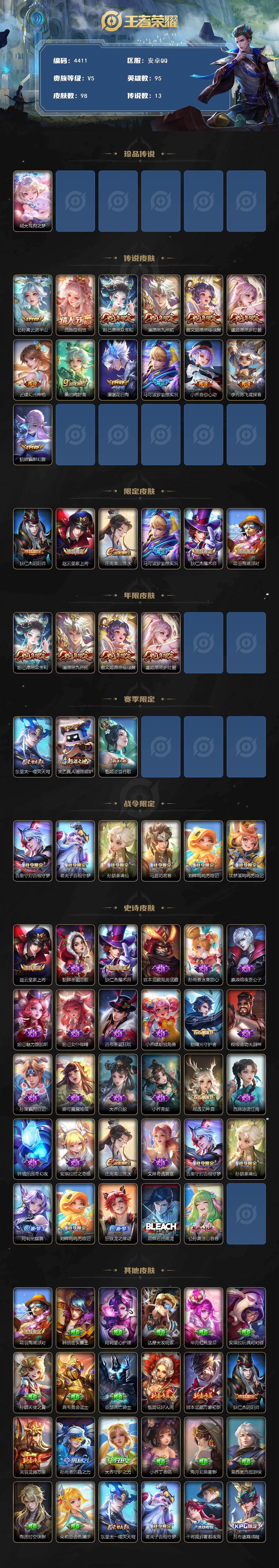 安卓q-v5-尊贵铂金iv段位-95英雄-98皮肤-1珍品传说-13传说-29史诗 【珍品传说】:瑶大耳狗之梦 【传说皮肤】:公孙离云诺千山,西施续相思,妲己愿照众生和,澜愿照九州拓,蔡文姬愿照福禄聚,虞姬愿照岁时盈,云缨幻光神呛,桑启鸣野蒿,澜逐花归海,马可波罗妄想实况,小乔音你心动,李元芳飞鸢探春,貂蝉猫影幻舞 【限定皮肤】:狄仁杰阴阳师,赵云皇家上将,庄周高山流水,马可波罗妄想实况,狄仁杰魔术师,项羽海滩派对 【年限皮肤】:妲己愿照众生和,澜愿照九州拓,蔡文姬愿照福禄聚,虞姬愿照岁时盈 【赛季限定】:东皇太一噬灭天穹,太乙真人谧流熔炉,甄姬逆浪荇歌 【战令限定】:百里守约百相守梦,老夫子百相守梦,孙膑茶境仙,马超访茗客,刘禅鸭鸭历险记,沈梦溪鸭鸭历险记 【史诗皮肤】:赵云皇家上将,貂蝉圣诞恋歌,狄仁杰魔术师,宫本武藏鬼剑武藏,孙尚香水果甜心,嬴政暗夜贵公子,妲己魅力维加斯,妲己女仆咖啡,吕布圣诞狂欢,小乔缤纷独角兽,铠曙光守护者,程咬金功夫厨神,孙策猫狗日记,娜可露露晚萤,大乔白蛇,小乔青蛇,瑶遇见神鹿,西施诗语江南,钟馗乐园奇幻夜,安琪拉时之奇旅,庄周高山流水,艾琳奇遇舞章,百里守约百相守梦,孙膑茶境仙,阿轲化蝶舞,刘禅鸭鸭历险记,狂铁龙之律动,后羿石田雨龙,公孙离涂山容容 【其他皮肤】:项羽海滩派对,韩信街头霸王,阿轲爱心护理,达摩大发明家,芈月红桃皇后,安琪拉玩偶对对碰,孙膑天使之翼,典韦黄金武士,亚瑟死亡骑士,甄姬花好人间,宫本武藏万象初新,狄仁杰阴阳师,关羽龙腾万里,孙尚香沉稳之力,大乔守护之力,小乔丁香结,海月幻泉雾影,莱西奥西部游侠,海诺时空谍影,朵莉亚金色潮汐,东皇太一噬灭天穹,老夫子百相守梦,干将莫邪雾都夜雨,吕布逐霄战戟,苍苍林狼骑,太乙真人谧流熔炉,典韦铁骨偃魂,马超访茗客,西施雪境奇遇,姜子牙星梦巡礼,明世隐景韶洛都,戈娅玫蓝誓约,刘备浪漫序章,沈梦溪鸭鸭历险记,苏烈春野闲踪,小乔秘证寻踪,张良灵野札记,阿古朵布丁狗之约,露娜命运加冕,雅典娜潮玩士官长,白起死霸装,甄姬逆浪荇歌,莱西奥踏浪烽翎,鬼谷子克喵,艾琳鹤鸣心笺,狄仁杰锦衣卫,后羿精灵王,李元芳特种部队,蔡文姬蔷薇王座,杨玉环霓裳曲,弈星踏雪寻梅,司马懿魇语军师,瑶森,云中君荷鲁斯之眼,澜孤猎 【营地id】:1631773684