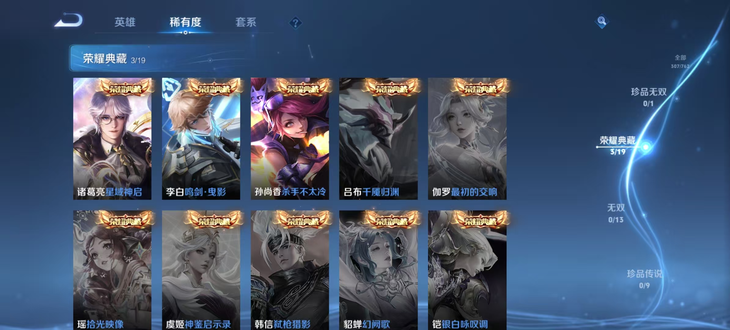 txwz30327 v8 308皮 典藏3(星域神启,鸣剑·曳影,杀手不太冷)传说15(深海之息,挚爱之约,炽阳神光,淬星耀世,启明星使,冠军飞将,仲夏夜之梦,李 ,久胜战神,零号·赤焰,云鹰飞将,一念神魔,胖达荣荣,黄金狮子座,地狱火)史诗93(至尊宝)