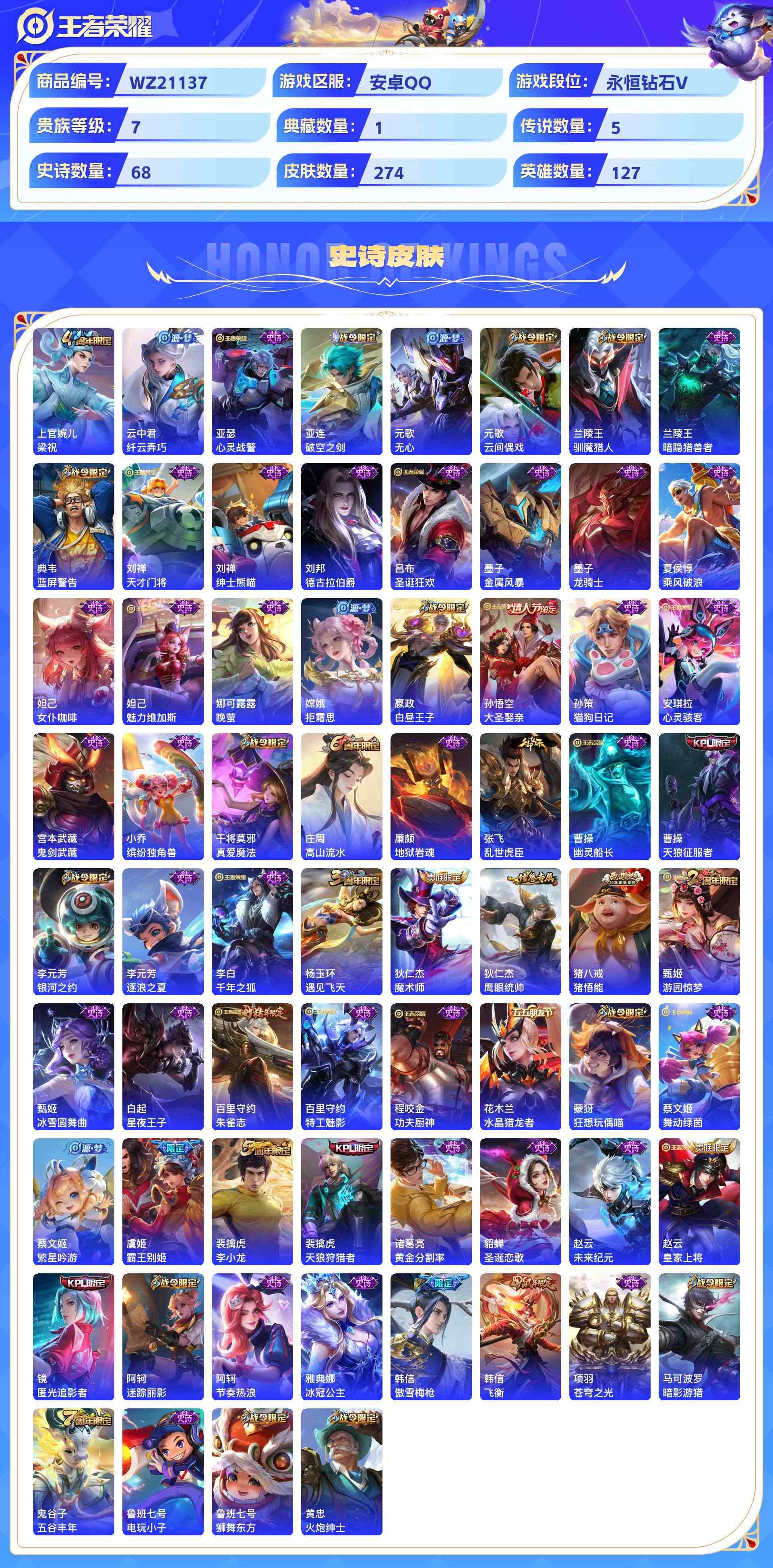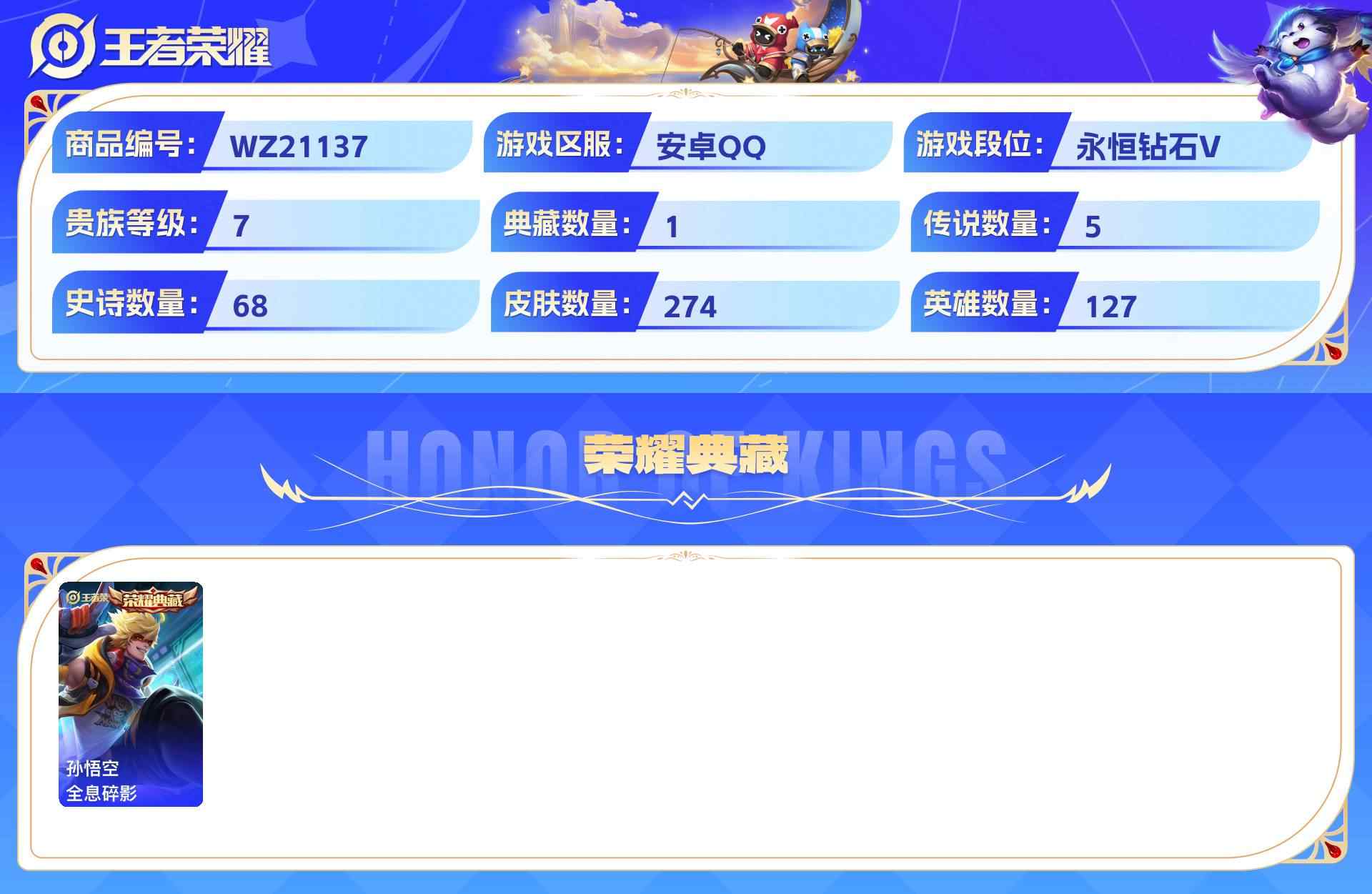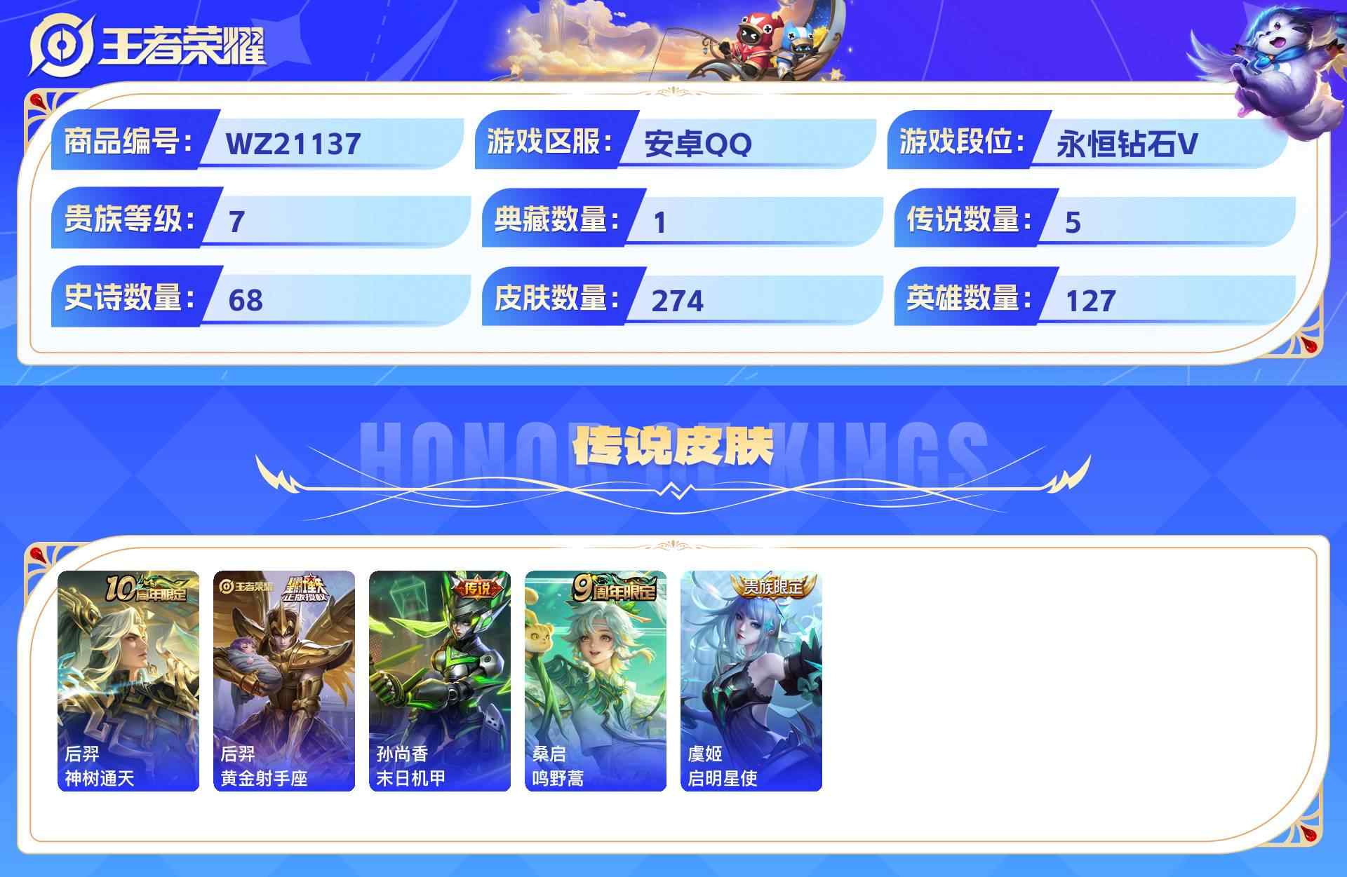 wz21137|入坑精品小号安卓qq274皮贵族7级1典藏5传说68史诗【荣耀典藏】全息碎影【传说皮肤】神树通天黄金射手座末日机甲鸣野蒿启明星使【史诗皮肤】梁祝纤云弄巧心灵战警破空之剑无心云间偶戏驯