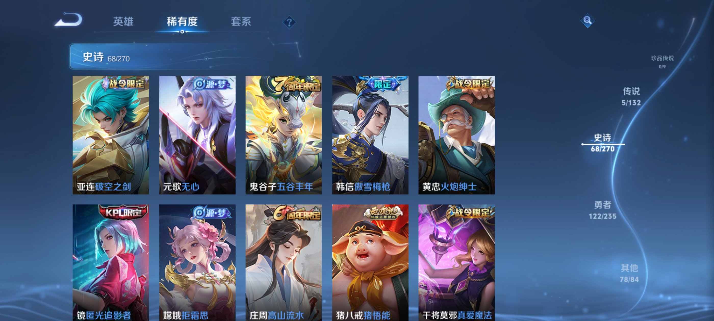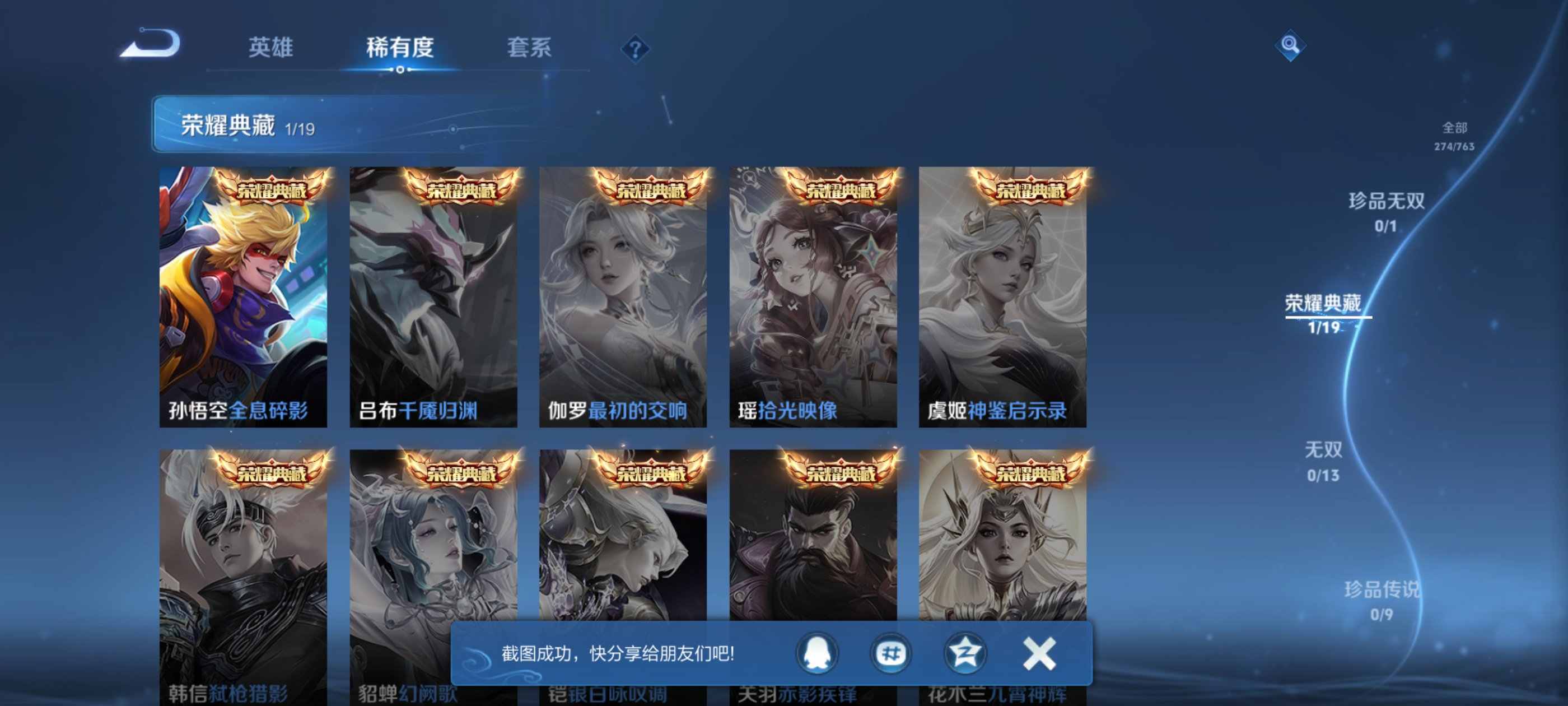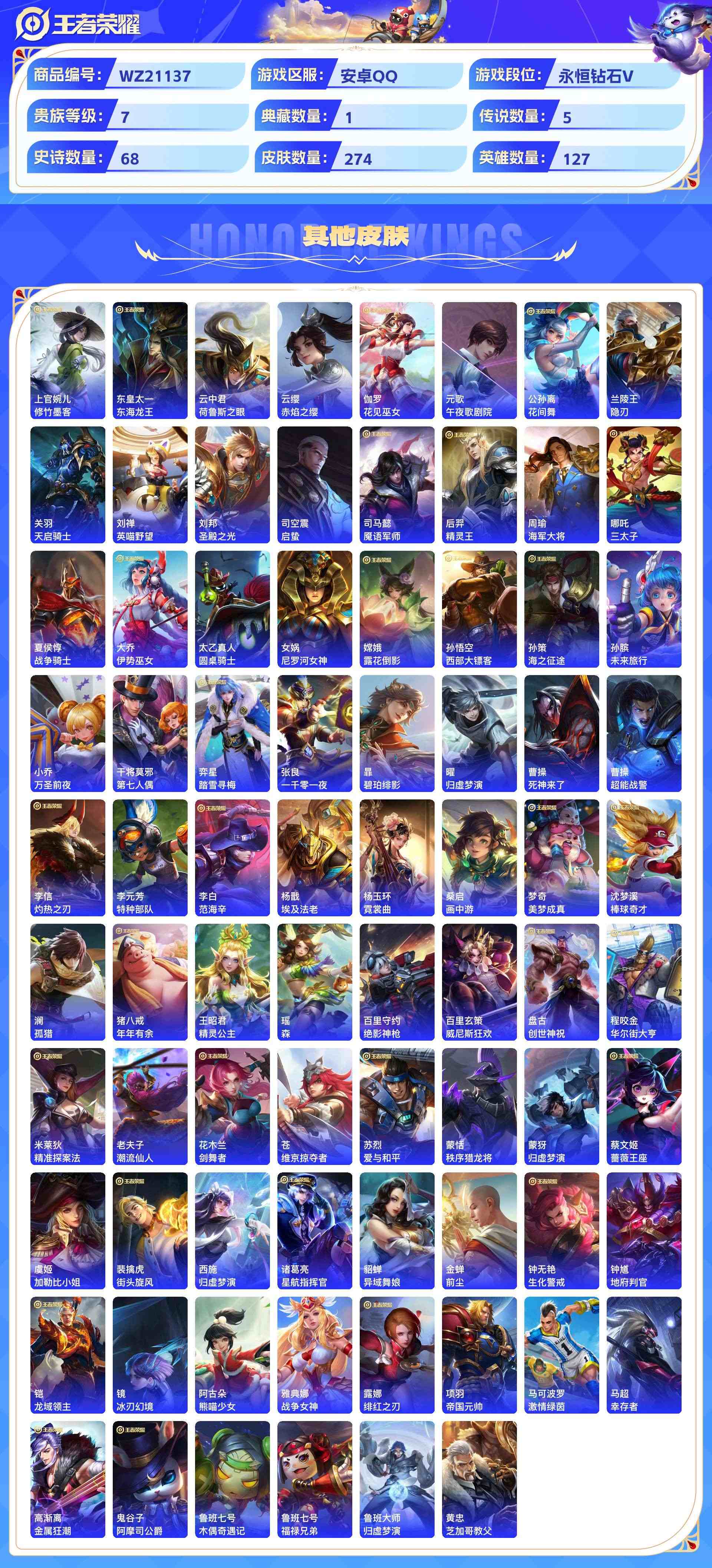 wz21137|入坑精品小号安卓qq274皮贵族7级1典藏5传说68史诗【荣耀典藏】全息碎影【传说皮肤】神树通天黄金射手座末日机甲鸣野蒿启明星使【史诗皮肤】梁祝纤云弄巧心灵战警破空之剑无心云间偶戏驯