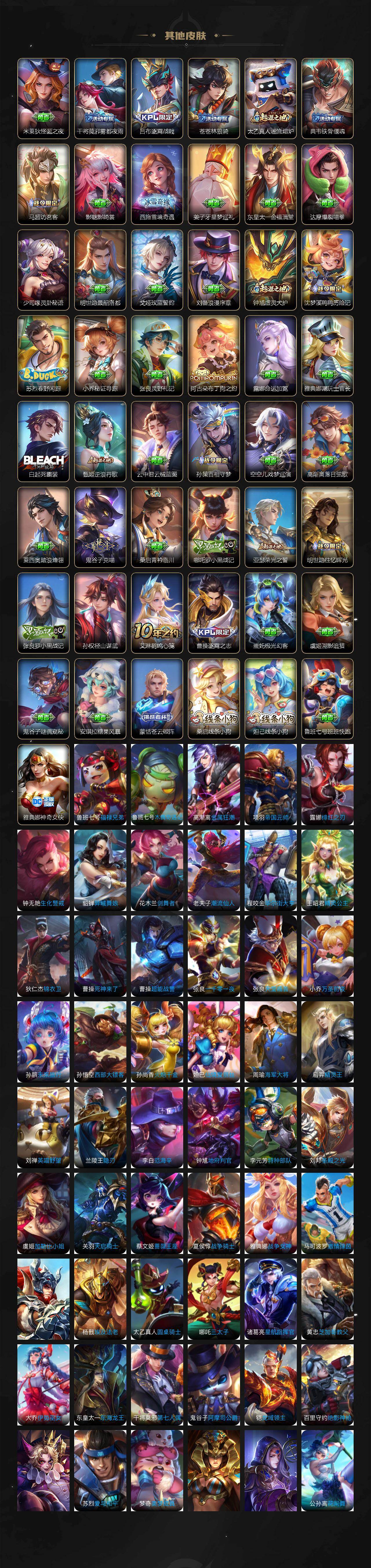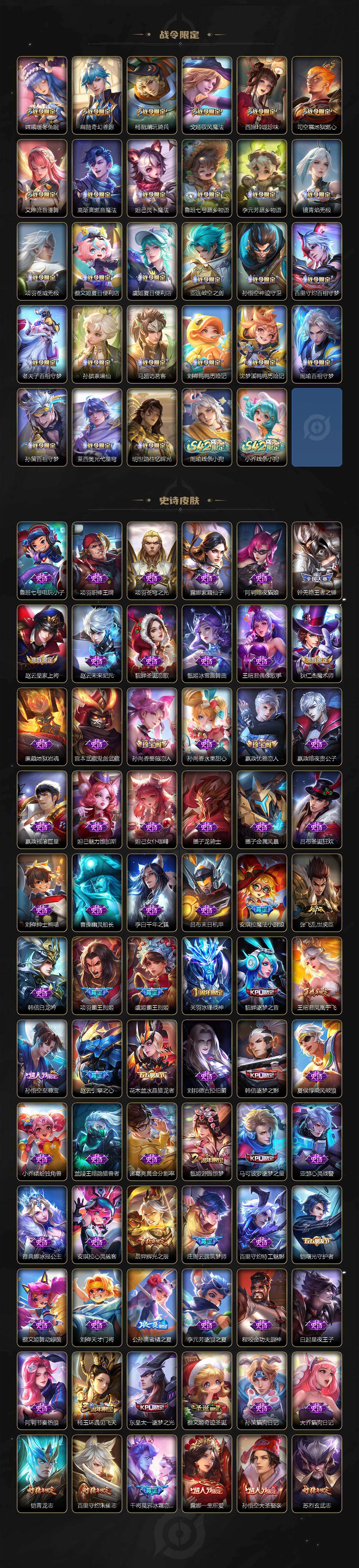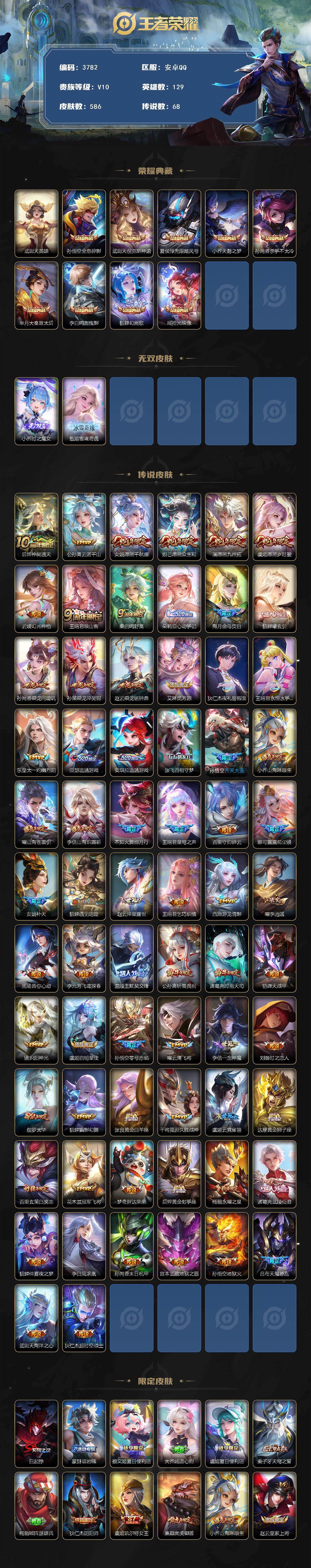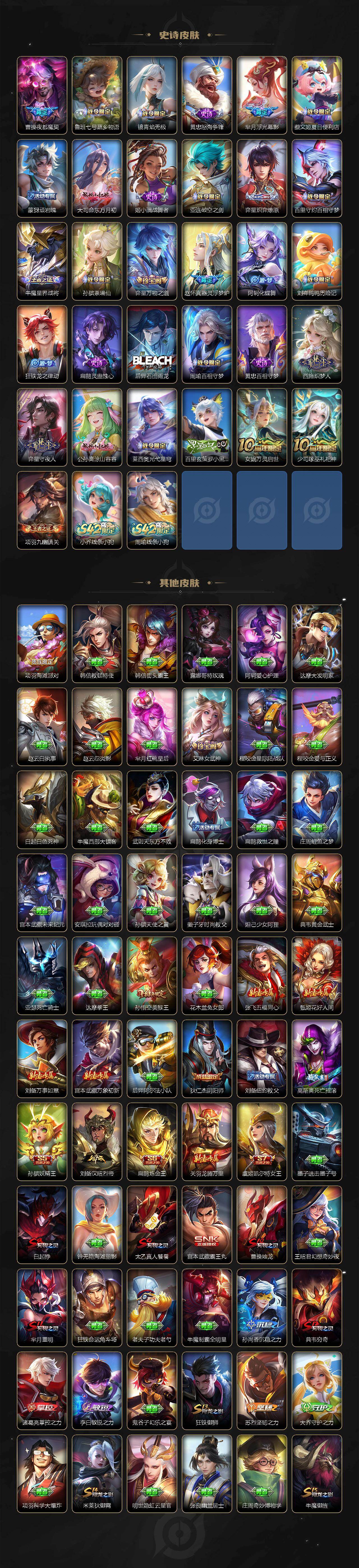 129英雄-586皮肤-贵族10/皮肤586/典藏9/传说68/史诗205/英雄129/刘禅全皮/扁鹊全皮/达摩全皮/孙权全皮/张良全皮/娜可露露全皮/刘备全皮/钟馗全皮/雅典娜全皮/东皇太一全皮/鬼谷子全皮/苏烈全皮/百里玄策全皮/弈星全皮/梦奇全皮/沈梦溪全皮/狂铁全皮/李信全皮/猪八戒全皮/海月全皮/蒙犽全皮/蒙恬全皮/阿古朵全皮/戈娅全皮/空空儿全皮/影全皮/武则天/全息碎影 孙悟空/倪克斯神谕 武则天/无限