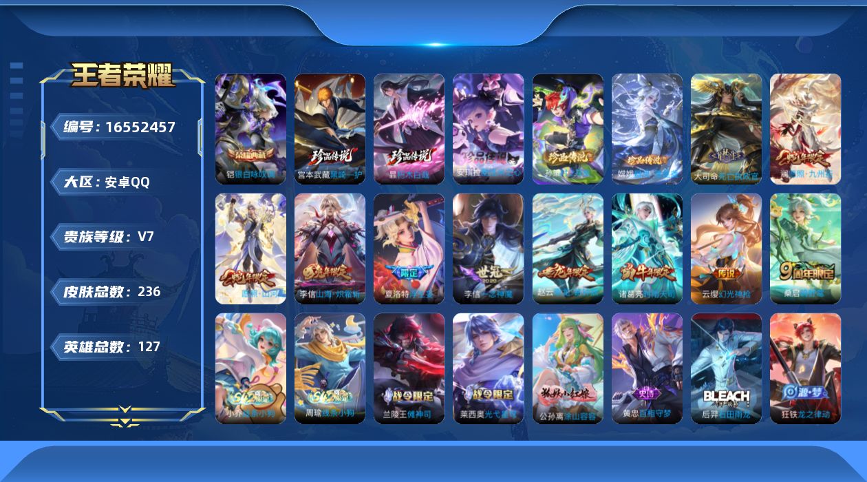 [16552457]安卓q-v7-永恒钻石ii段位-127英雄-236皮肤-1典藏皮肤-5珍品传说-10传说-78史诗 【英雄全皮】:孙权全皮,李信全皮,大司命全皮,夏洛特全皮,司空震全皮,影全皮 【荣耀典藏】:铠银白咏叹调 【珍品传说】:孙策时之奇旅,嫦娥器灵落星盏,安琪拉酷洛米之心,暃朽木白哉,宫本武藏黑崎一护 【传说皮肤】:大司命死亡执政官,司空震愿照山河定,澜愿照九州拓,云缨幻光神呛,桑启鸣野蒿,赵云乘龙铭钟鼎,夏洛特浮生妄,李信山海炽霜斩,诸葛亮时雨天司,李信一念神魔 【限定皮肤】:暃埋骨钱,蒙犽顽岩魄,蔡文姬夏日便利店,大乔绒语心约,虞姬夏日便利店,姜子牙天穹之誓,杨戬破阵退雄兵,狄仁杰阴阳师,赵云皇家上将,赵云百木心呛,元歌无心,马可波罗山海玄木吟,狄仁杰魔术师,达摩沙漠行僧,项羽海滩派对,兰陵王金庭之子,李元芳银河之约,李元芳匿光侦查者,李元芳云中旅人,女娲朔望之晖,鬼谷子五谷丰年,诸葛亮时雨天司,沈梦溪大漠名商,裴擒虎李小龙,米莱狄胡桃异想国,云中君纤云弄巧,李信山海炽霜斩,嫦娥拒霜思,蒙犽狂想玩偶喵,鲁班大师探海日志,桑启海盐诗旅,夏洛特浮生妄,艾琳流音漫舞,司空震地狱燃心,阿古朵江河有灵,张良古海寻踪,蒙犽百解令,高渐离燃音魔法,妲己灵卜魔法,鬼谷子天穹祈灯,姬小满妄想食味,赵云乘龙铭钟鼎,沈梦溪龙舞盛年,鲁班七号蔬乡物语,李元芳蔬乡物语,刘邦剑破天穹,上官婉儿群星魔术团,程咬金群星魔术团,镜青焰无极,项羽苍威无极,芈月浮光幕影,周瑜熔金海岸 【年限皮肤】:诸葛亮时雨天司,李信山海炽霜斩,马可波罗山海玄木吟,赵云乘龙铭钟鼎,司空震愿照山河定,澜愿照九州拓 【赛季限定】:达摩沙漠行僧,兰陵王金庭之子,沈梦溪大漠名商,李元芳云中旅人,桑启海盐诗旅,鲁班大师探海日志,张良古海寻踪,鬼谷子天穹祈灯,刘邦剑破天穹,姜子牙天穹之誓,东皇太一噬灭天穹,太乙真人谧流熔炉,钟馗虚灵犬护,甄姬逆浪荇歌,亚瑟荣光之誓,牛魔星界战将 【战令限定】:女娲朔望之晖,李元芳银河之约,蒙犽狂想玩偶喵,米莱狄胡桃异想国,司空震地狱燃心,艾琳流音漫舞,高渐离燃音魔法,妲己灵卜魔法,鲁班七号蔬乡物语,李元芳蔬乡物语,镜青焰无极,项羽苍威无极,蔡文姬夏日便利店,虞姬夏日便利店,亚连破空之剑,廉颇撼地雄心,孙悟空神迹守卫,百里守约百相守梦,老夫子百相守梦,孙膑茶境仙,马超访茗客,刘禅鸭鸭历险记,沈梦溪鸭