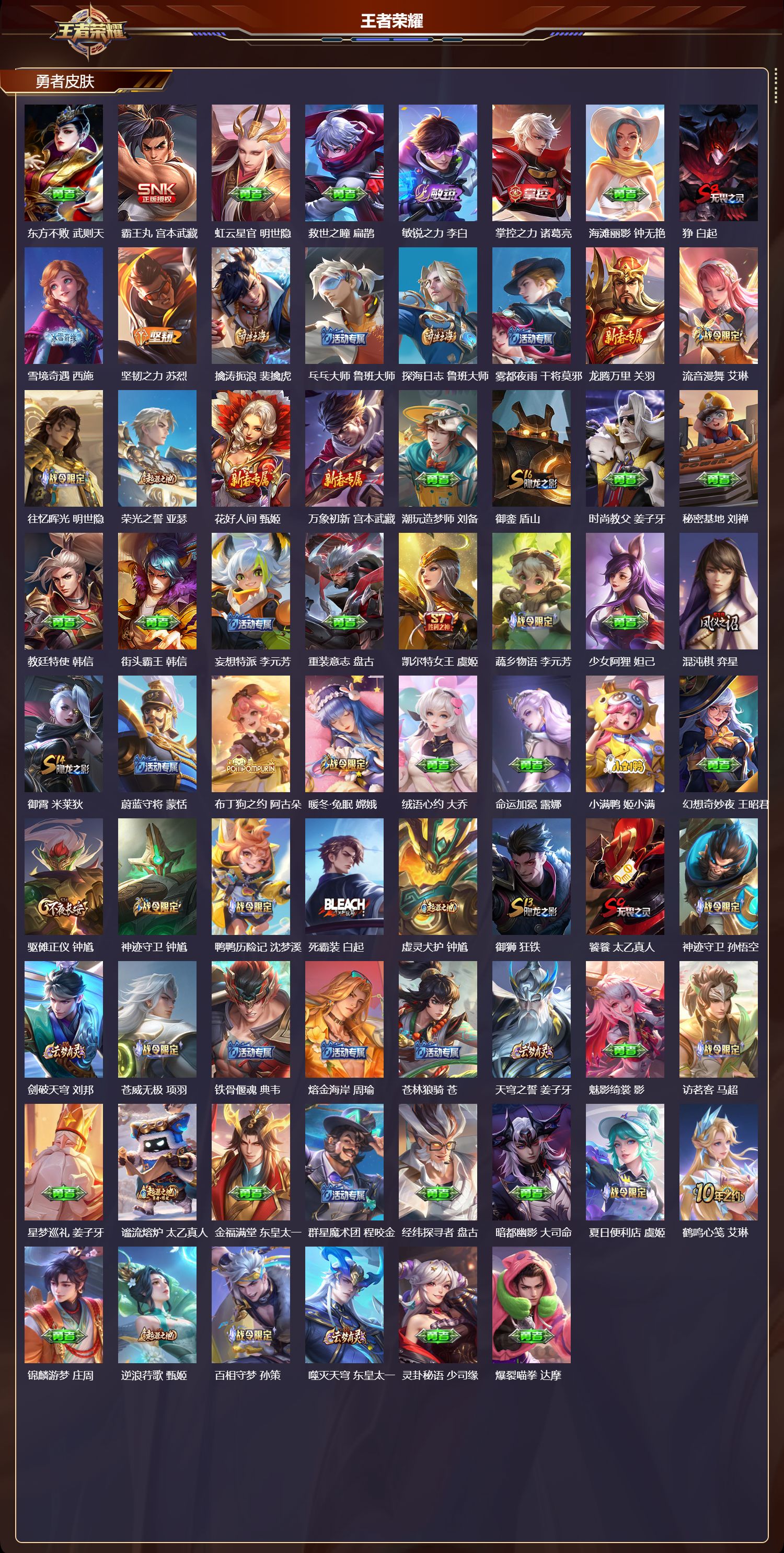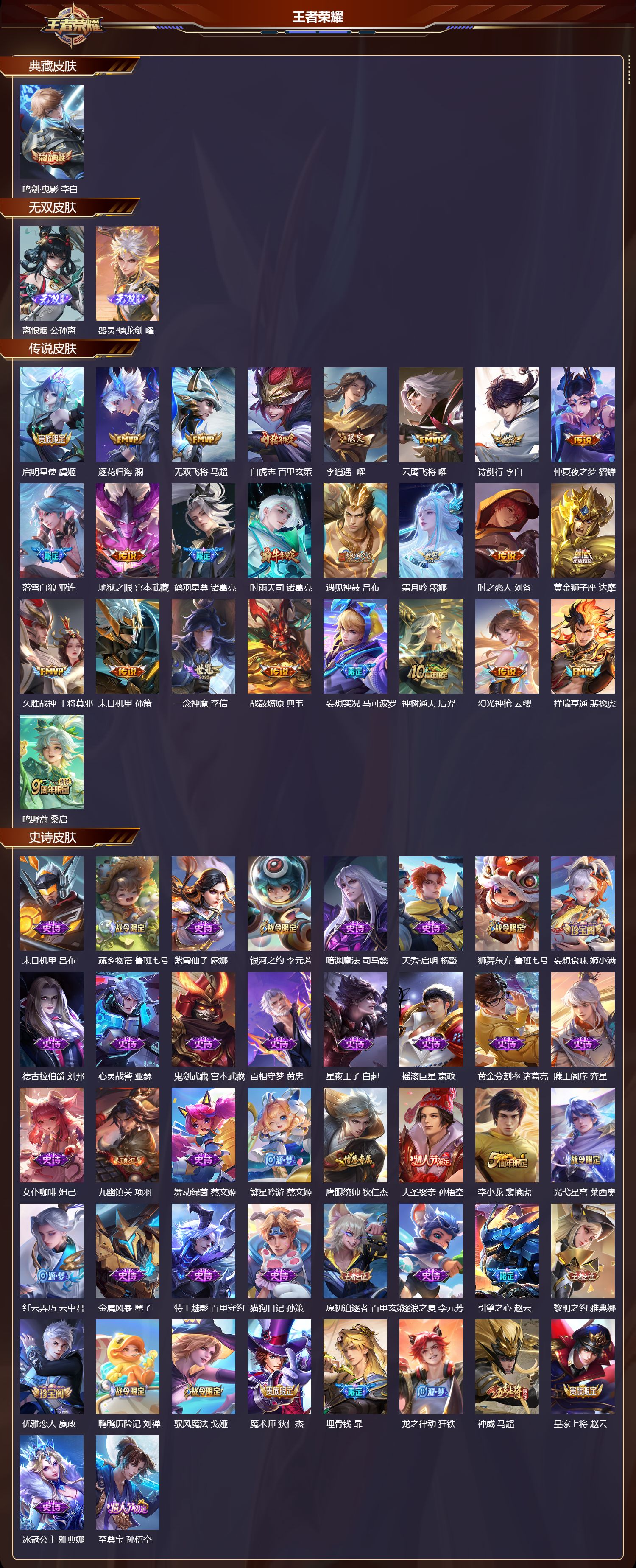 127英雄-250皮肤-苹果qq/永恒钻石/250皮肤/127英雄/1典藏/0珍品无双/2无双/0珍品传说/25传说/72史诗/9稀有英雄【1 典藏皮肤】鸣剑·曳影 李白【2 无双皮肤】离恨烟 公孙离器灵·螭龙剑 曜【25 传说皮肤】启明星使 虞姬逐花归海 澜无双飞将 马超白虎志 百里玄策李 曜云鹰飞将 曜诗剑行 李白仲夏夜之梦 貂蝉落雪白狼 亚连地狱之眼 宫本武藏鹤羽星尊 诸葛亮时雨天