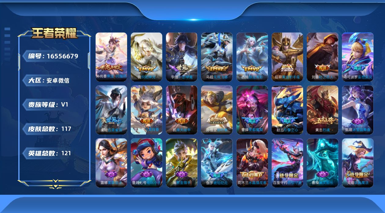 [16556679]安卓wx-v0-永恒钻石ii段位-118英雄-115皮肤-11传说-27史诗 【英雄全皮】:影全皮 【传说皮肤】:孙尚香乘龙问璇玑,马可波罗妄想实况,马超无双飞将,西施游龙清影,李元芳飞鸢探春,铠绛天战甲,镜炽阳神光,李信一念神魔,刘备时之恋人,虞姬云霓雀翎,后羿黄金射手座 【限定皮肤】:姜子牙天穹之誓,狄仁杰阴阳师,赵云皇家上将,赵云引擎之心,马可波罗妄想实况,狄仁杰魔术师,项羽海滩派对,老夫子航海奇遇记,孙悟空孙行者,黄忠烈魂,百里玄策原初追逐者,裴擒虎擒涛扼浪,西施玲珑珍味,鲁班大师探海日志,戈娅驭风魔法,张良古海寻踪,高渐离燃音魔法,妲己灵卜魔法,鬼谷子天穹祈灯,伽罗琥珀纪元,孙尚香乘龙问璇玑,曹操夜都魔契,刘邦剑破天穹 【年限皮肤】:黄忠烈魂,孙尚香乘龙问璇玑 【赛季限定】:张良古海寻踪,百里玄策原初追逐者,裴擒虎擒涛扼浪,鲁班大师探海日志,鬼谷子天穹祈灯,刘邦剑破天穹,姜子牙天穹之誓 【战令限定】:老夫子航海奇遇记,西施玲珑珍味,戈娅驭风魔法,高渐离燃音魔法,妲己灵卜魔法 【史诗皮肤】:鲁班七号电玩小子,露娜紫霞仙子,赵云皇家上将,甄姬冰雪圆舞曲,狄仁杰魔术师,廉颇地狱岩魂,孙尚香水果甜心,妲己魅力维加斯,墨子金属风暴,刘禅绅士熊喵,曹操幽灵船长,李白千年之狐,赵云引擎之心,花木兰水晶猎龙者,诸葛亮黄金分割率,程咬金功夫厨神,阿轲节奏热浪,黄忠烈魂,百里玄策原初追逐者,老夫子航海奇遇记,孙悟空孙行者,澜赏金猎手,戈娅驭风魔法,妲己灵卜魔法,高渐离燃音魔法,伽罗琥珀纪元,曹操夜都魔契,百里守约百相守梦 【其他皮肤】:项羽海滩派对,韩信教廷特使,露娜哥特玫瑰,达摩大发明家,赵云白执事,芈月红桃皇后,程咬金星际陆战队,白起白色死神,牛魔西部大镖客,扁鹊救世之瞳,宫本武藏未来纪元,安琪拉玩偶对对碰,亚瑟死亡骑士,张飞五福同心,狄仁杰阴阳师,刘备汉昭烈帝,诸葛亮掌控之力,小乔丁香结,沈梦溪鲨炮海盗猫,姜子牙炽热元素使,盾山圆桌骑士,狂铁特工战影,鲁班大师乓乓大师,刘禅唤灵魔甲,蒙恬蔚蓝守将,裴擒虎擒涛扼浪,太乙真人劲辣红锅,鲁班大师探海日志,西施玲珑珍味,姬小满零食大作战,李元芳妄想特派,哪吒热血海滩,张良古海寻踪,钟无艳聚星闪耀,亚连破局者,后羿完美运算,鬼谷子天穹祈灯,妲己灵卜魔法,嫦娥漠中幻影,廉颇功夫炙烤,刘邦剑破天穹,姜子牙天穹之誓,东皇太一噬灭天穹,