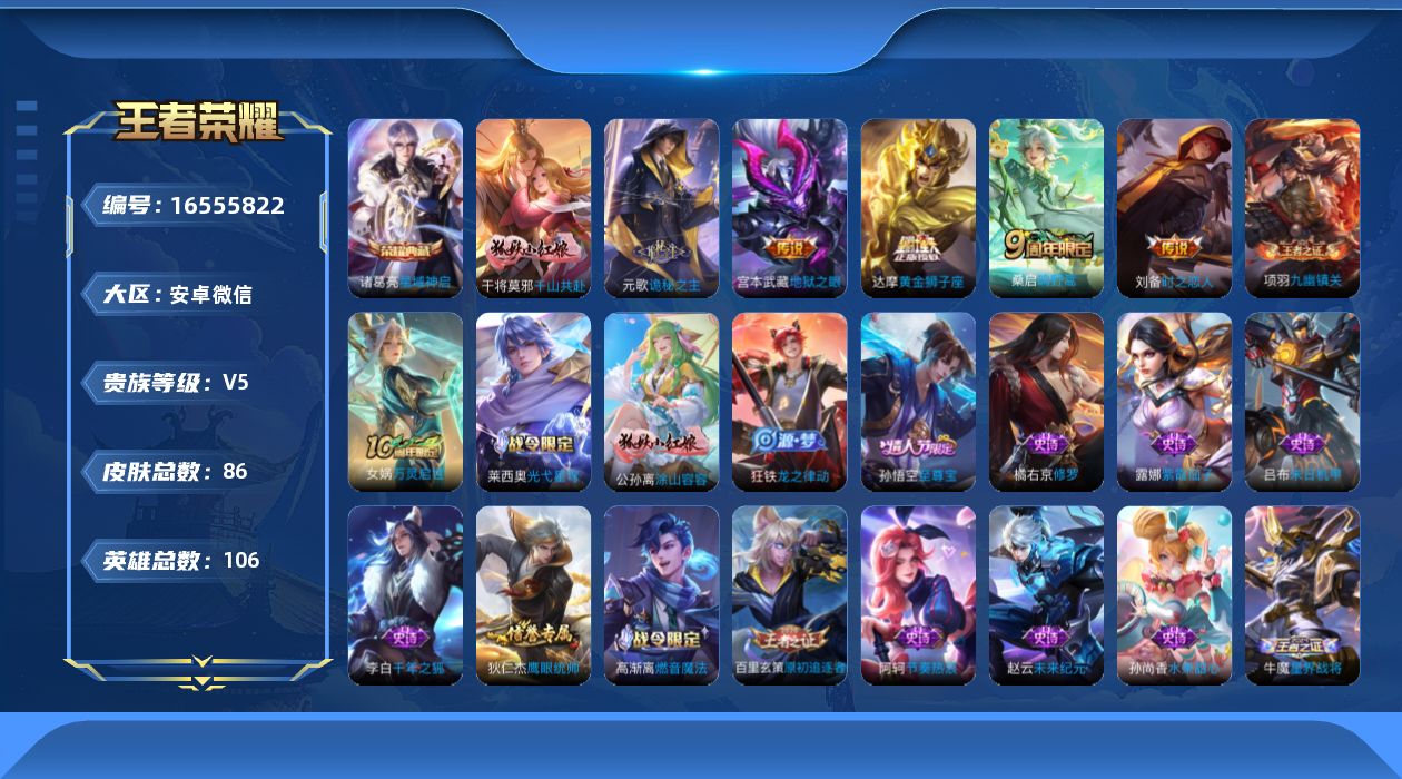 [16555822]v5 1典藏 6传说 106英雄 86皮肤 可修改实名 女号 【英雄全皮】孙权全皮蚩奼全皮大禹全皮 【稀有英雄】大司命韩信韩跳跳夏洛特夏师傅艾琳橘右京橘子娜可露露鸟人不知火舞赵云戈娅 【荣耀水晶】星域神启倪克斯贼亮 【传说皮】千山共赴诡秘之主黄金狮子座地狱之眼时之恋人-刘备电焊工 【赛季/战令皮】噬灭天穹s37古海寻踪s33天穹祈灯s34 【史诗皮】龙之律动光弋星穹星界战将涂山容容九幽镇关万灵启世紫霞仙子千年之狐高渐离燃音魔法偶像歌手末日机甲-吕布乱世虎臣节奏热浪修罗水果甜心绅士熊喵天才门将鬼剑武藏原初追逐者鹰眼统帅魅力维加斯未来纪元-赵云 【限定皮】鸣野蒿至尊宝 【普通皮】雾都夜雨苍林狼骑景韶洛都街头霸王龙舞盛年玫蓝誓约鹤鸣心笺荣光之誓往忆晖光径山谋武极光幻客溯影追猎命运加冕逆浪荇歌妄想特派鬼谷子天穹祈灯s34威尼斯狂欢完美运算妲己灵卜魔法龙腾万里花好人间海滩派对皇家上将乓乓大师黄金武士哥特玫瑰阴阳师汉昭烈帝死亡骑士忍·炎影白执事白色死神未来纪元-宫本武藏拳王东方不败阿尔法小队孤猎露花倒影修竹墨客幸存者龙域领主第七人偶埃及法老激情绿茵美梦成真启蛰创世神祝魇语军师午夜歌剧院命运角斗场街头旋风绝影神呛绯红之刃碧珀绯影