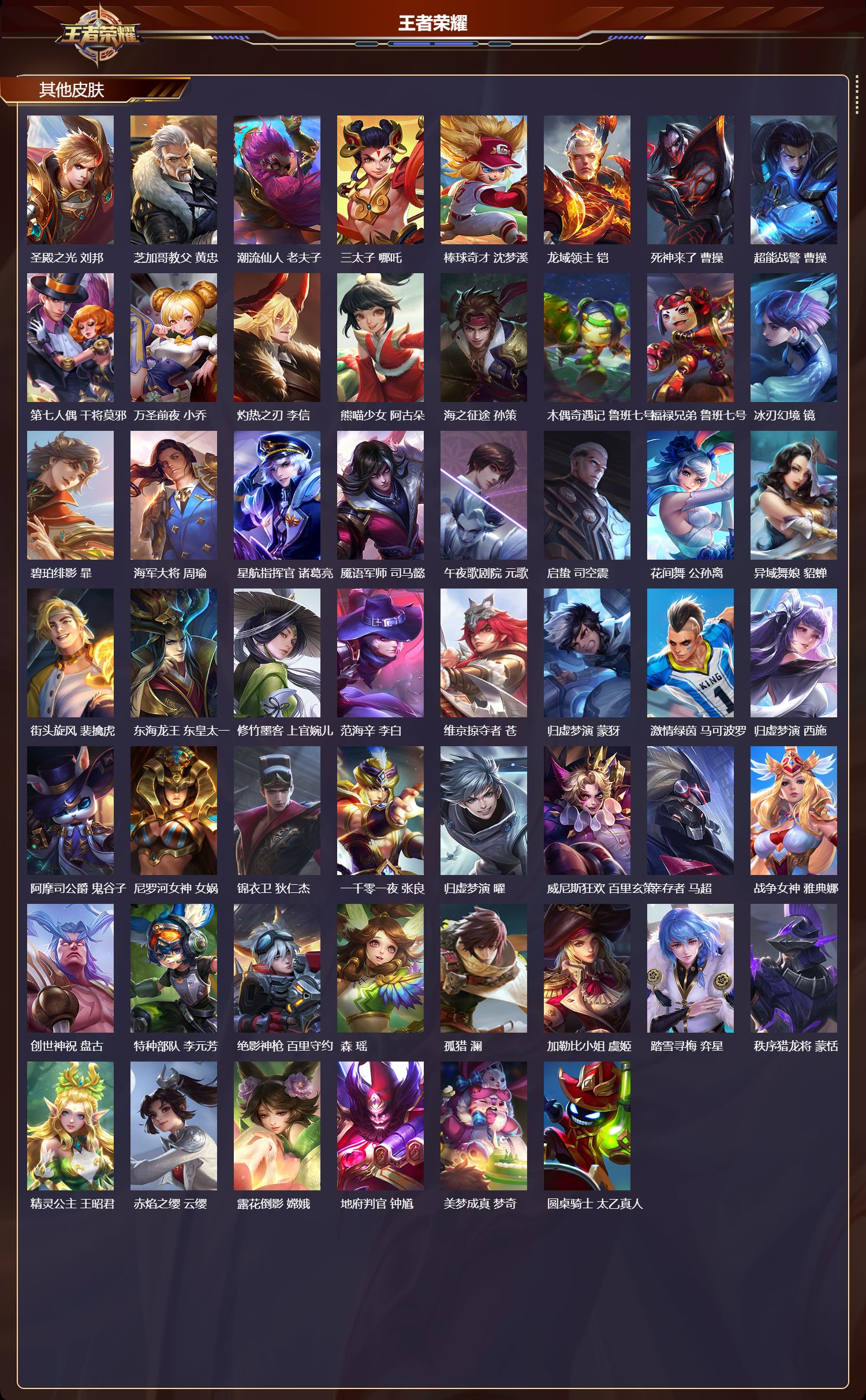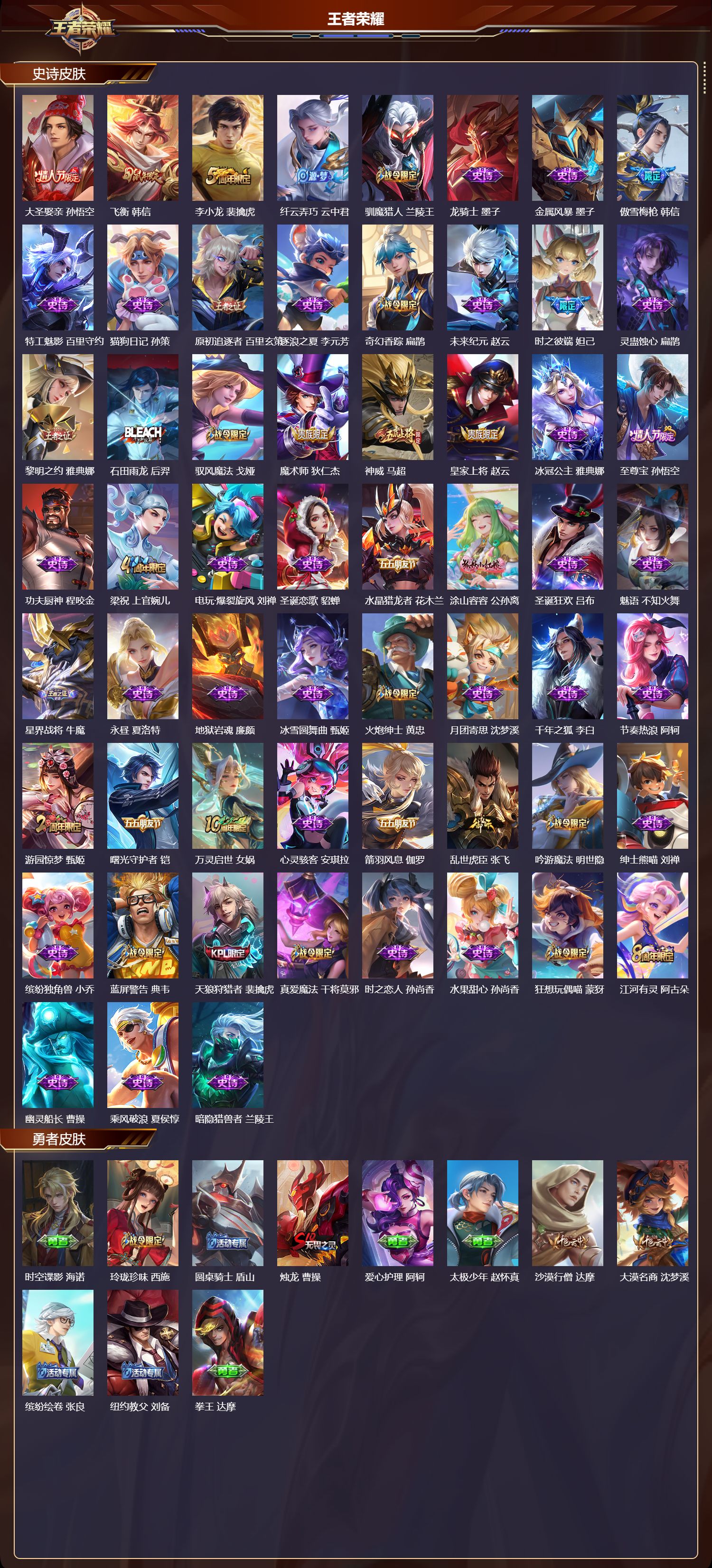 安卓qq/至圣王者/334皮肤/128英雄/2典藏/0珍品无双/0无双/0珍品传说/23传说/104史诗/9稀有英雄【2 典藏皮肤】杀手不太冷 孙尚香银白咏叹调 铠【23 传说皮肤】胖达荣荣 梦奇启明星使 虞姬白虎志 百里玄策李 曜永曜之星 杨戬凤求凰 李白诗剑行 李白遇见胡旋 貂蝉仲夏夜之梦 貂蝉祈雪灵祝 公孙离武陵仙君 诸葛亮鹤羽星尊 诸葛亮启示之音 露娜黄