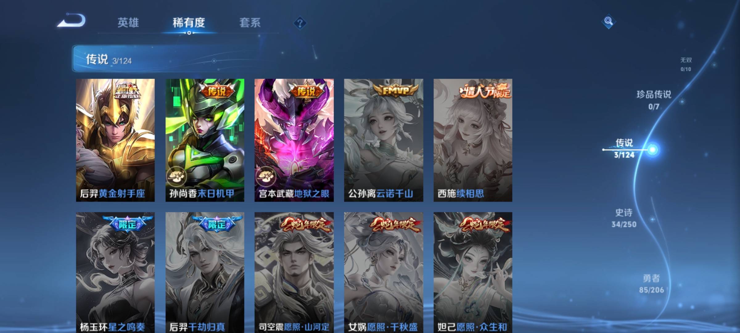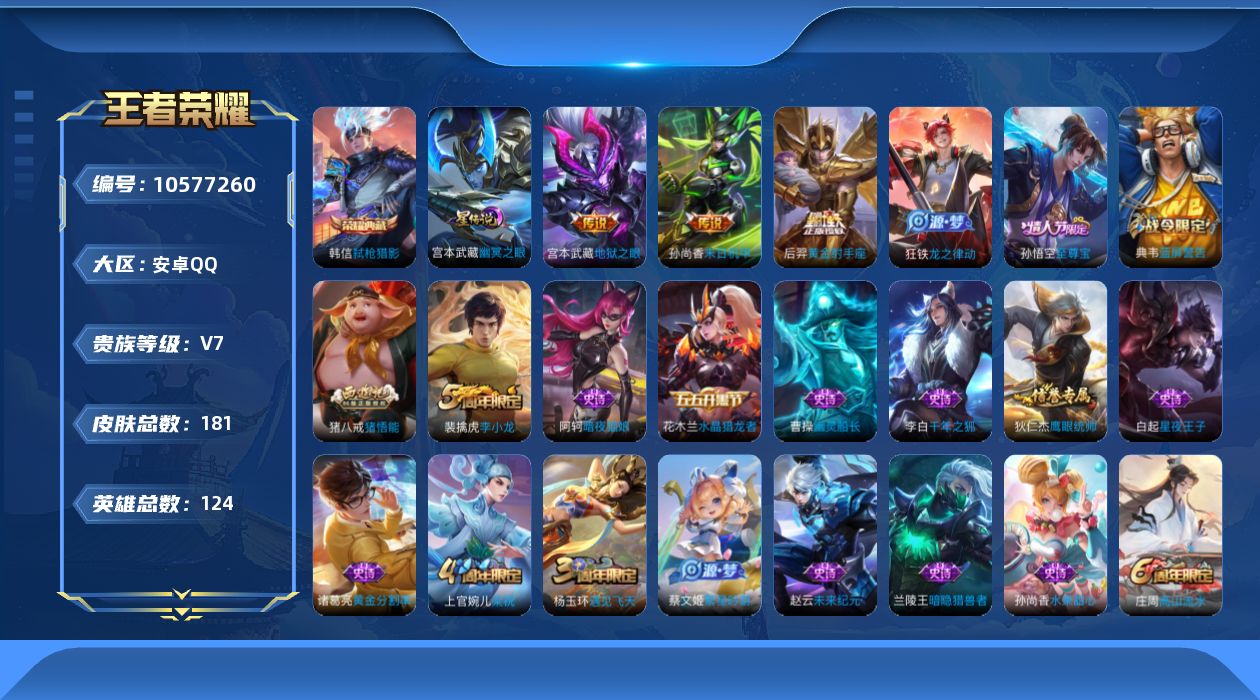 124英雄-181皮肤-【v7 1典藏 1星传说 3传说 181皮肤 124英雄】打野/对抗路15段韩信典藏弑呛猎影/星传说幽冥之眼/黄金射手座/末日机甲孙尚香/地狱之眼/至尊宝/蓝屏警告/李小龙/猪悟能/高山流水/燃音魔法/遇见飞天/梁祝/繁星吟游/狮舞东方/暗隐游猎者/水晶猎龙者/暗夜猫娘可改实名kc520-6