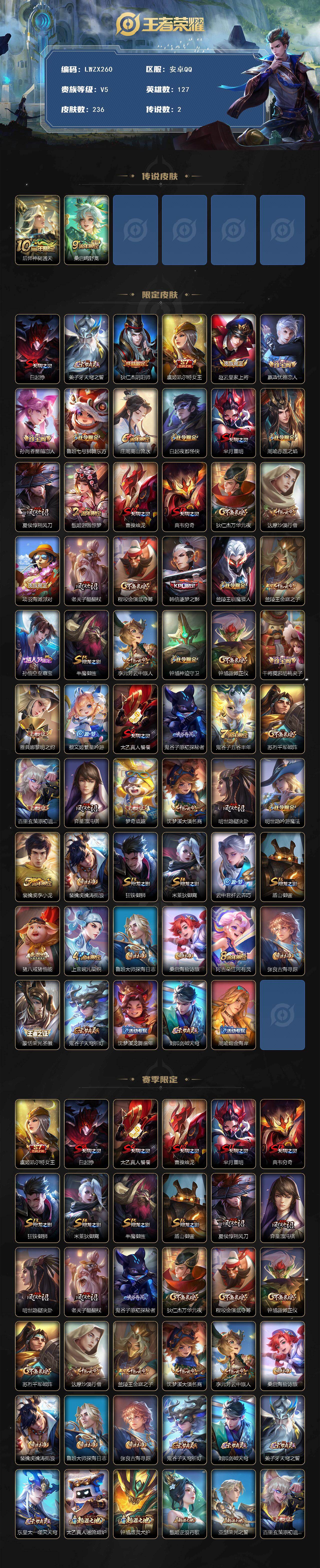 【特价出售/店主推荐】安卓q-v5-至尊星耀iii段位-127英雄-236皮肤-2传说-64史诗 【英雄全皮】:孙权全皮 【传说皮肤】:后羿神树通天,桑启鸣野蒿 【限定皮肤】:白起狰,姜子牙天穹之誓,狄仁杰阴阳师,虞姬凯尔特女王,赵云皇家上将,嬴政优雅恋人,孙尚香蔷薇恋人,鲁班七号狮舞东方,庄周高山