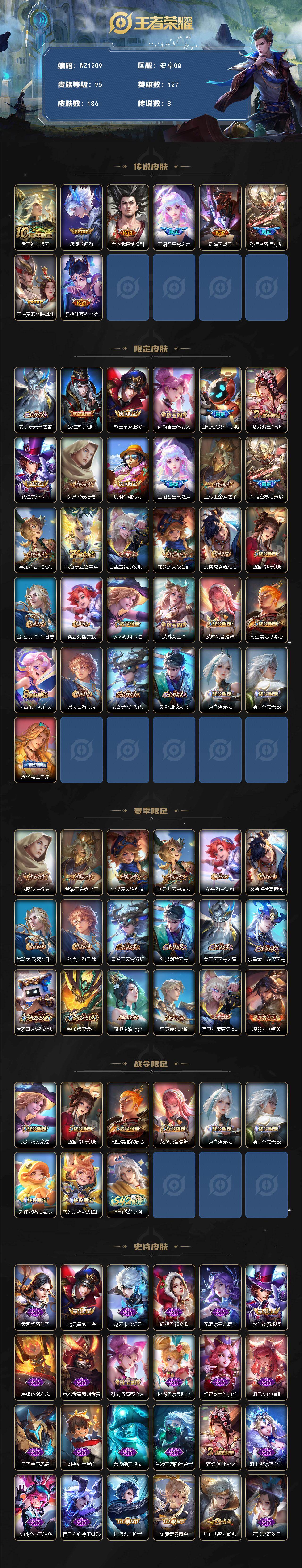 [16568353]安卓q-v5-永恒钻石i段位-127英雄-186皮肤-8传说-42史诗 【英雄全皮】:孙权全皮,戈娅全皮 【传说皮肤】:后羿神树通天,澜逐花归海,宫本武藏惊梅引,王昭君星穹之声,铠绛天战甲,孙悟空零号赤焰,干将莫邪久胜战神,貂蝉仲夏夜之梦 【限定皮肤】:姜子牙天穹之誓,狄仁杰阴阳师,赵云皇家上将,孙尚香蔷薇恋人,鲁班七号乒乒小将,甄姬游园惊梦,狄仁杰魔术师,达摩沙漠行僧,项羽海滩派对,王昭君星穹之声,兰陵王金庭之子,孙悟空零号赤焰,李元芳云中旅人,鬼谷子五谷丰年,百里玄策原初追逐者,沈梦溪大漠名商,裴擒虎擒涛扼浪,西施玲珑珍味,鲁班大师探海日志,桑启海盐诗旅,戈娅驭风魔法,艾琳女武神,艾琳流音漫舞,司空震地狱燃心,阿古朵江河有灵,张良古海寻踪,鬼谷子天穹祈灯,刘邦剑破天穹,镜青焰无极,项羽苍威无极,周瑜熔金海岸 【赛季限定】:达摩沙漠行僧,兰陵王金庭之子,沈梦溪大漠名商,李元芳云中旅人,桑启海盐诗旅,裴擒虎擒涛扼浪,鲁班大师探海日志,张良古海寻踪,鬼谷子天穹祈灯,刘邦剑破天穹,姜子牙天穹之誓,东皇太一噬灭天穹,太乙真人谧流熔炉,钟馗虚灵犬护,甄姬逆浪荇歌,亚瑟荣光之誓,百里玄策原初追逐者,项羽九幽镇关 【战令限定】:戈娅驭风魔法,西施玲珑珍味,司空震地狱燃心,艾琳流音漫舞,镜青焰无极,项羽苍威无极,刘禅鸭鸭历险记,沈梦溪鸭鸭历险记,周瑜线条小狗 【史诗皮肤】:露娜紫霞仙子,赵云皇家上将,赵云未来纪元,貂蝉圣诞恋歌,甄姬冰雪圆舞曲,狄仁杰魔术师,廉颇地狱岩魂,宫本武藏鬼剑武藏,孙尚香蔷薇恋人,孙尚香水果甜心,妲己魅力维加斯,妲己女仆咖啡,墨子金属风暴,刘禅绅士熊喵,曹操幽灵船长,兰陵王暗隐猎兽者,甄姬游园惊梦,雅典娜冰冠公主,安琪拉心灵骇客,百里守约特工魅影,铠曙光守护者,伽罗箭羽风息,狄仁杰鹰眼统帅,不知火舞魅语,百里玄策原初追逐者,鲁班七号乒乒小将,貂蝉唤灵魅影,鬼谷子五谷丰年,戈娅驭风魔法,司空震地狱燃心,阿古朵江河有灵,镜青焰无极,马可波罗星界特工,狄仁杰绮世丹青,阿轲化蝶舞,刘禅鸭鸭历险记,狂铁龙之律动,后羿石田雨龙,黄忠百相守梦,公孙离涂山容容,女娲万灵启世,项羽九幽镇关,周瑜线条小狗 【其他皮肤】:项羽海滩派对,韩信教廷特使,韩信街头霸王,露娜哥特玫瑰,赵云忍炎影,芈月红桃皇后,艾琳女武神,白起白色死神,扁鹊化身博士,扁鹊救世之瞳,宫本武藏未来纪元,安