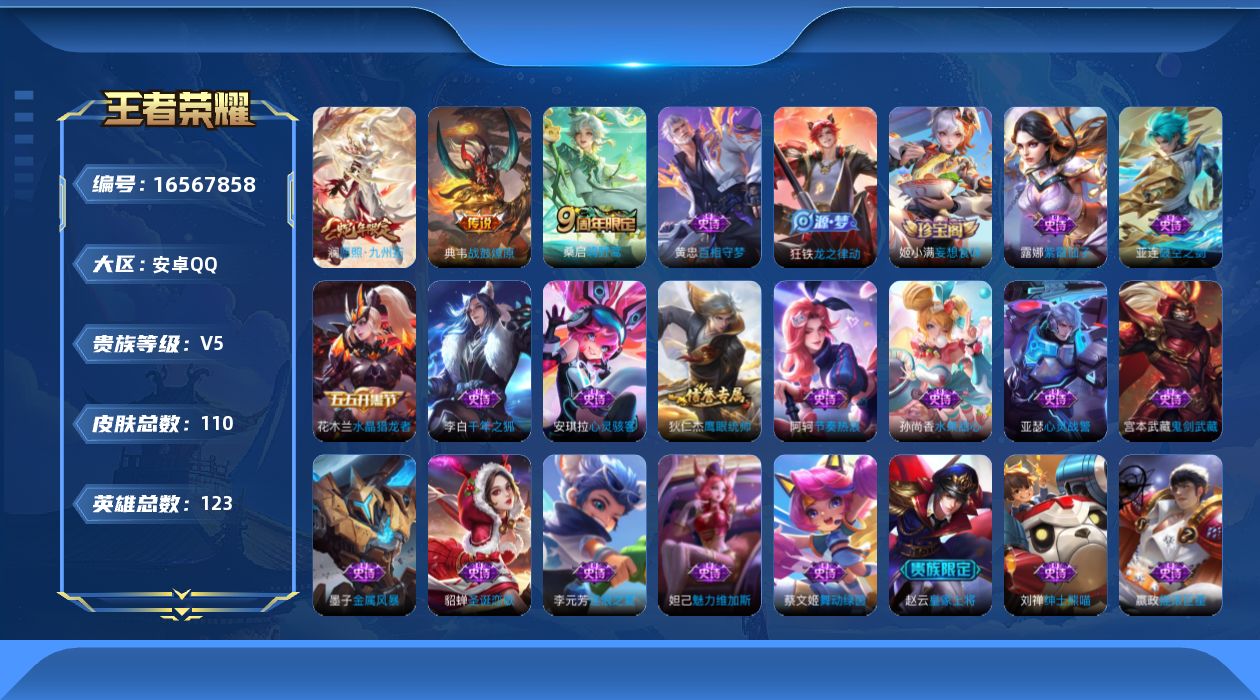 [16567858]安卓q-v5-永恒钻石iv段位-123英雄-109皮肤-3传说-20史诗 【传说皮肤】:澜愿照九州拓,桑启鸣野蒿,典韦战鼓燎原 【限定皮肤】:姜子牙天穹之誓,杨戬破阵退雄兵,狄仁杰阴阳师,赵云皇家上将,项羽海滩派对,裴擒虎擒涛扼浪,鲁班大师探海日志,桑启海盐诗旅,艾琳流音漫舞,张良古海寻踪,鬼谷子天穹祈灯,姬小满妄想食味,沈梦溪龙舞盛年,刘邦剑破天穹,程咬金群星魔术团,周瑜熔金海岸 【赛季限定】:张良古海寻踪,裴擒虎擒涛扼浪,鲁班大师探海日志,桑启海盐诗旅,鬼谷子天穹祈灯,刘邦剑破天穹,姜子牙天穹之誓 【战令限定】:艾琳流音漫舞 【史诗皮肤】:露娜紫霞仙子,赵云皇家上将,貂蝉圣诞恋歌,宫本武藏鬼剑武藏,孙尚香水果甜心,嬴政摇滚巨星,妲己魅力维加斯,墨子金属风暴,刘禅绅士熊喵,李白千年之狐,花木兰水晶猎龙者,亚瑟心灵战警,安琪拉心灵骇客,蔡文姬舞动绿茵,李元芳逐浪之夏,狄仁杰鹰眼统帅,姬小满妄想食味,亚连破空之剑,狂铁龙之律动,黄忠百相守梦 【其他皮肤】:项羽海滩派对,韩信教廷特使,韩信街头霸王,露娜哥特玫瑰,赵云白执事,白起白色死神,牛魔西部大镖客,宫本武藏未来纪元,安琪拉玩偶对对碰,妲己少女阿狸,典韦黄金武士,亚瑟死亡骑士,达摩拳王,张飞五福同心,刘备万事如意,狄仁杰阴阳师,刘备纽约教父,钟无艳海滩丽影,老夫子功夫老勺,李白敏锐之力,大乔守护之力,小乔丁香结,哪吒次元突破,鲁班大师乓乓大师,典韦铁甲之心,程咬金无双福将,蒙恬蔚蓝守将,桑启海盐诗旅,猪八戒潮玩探月行,裴擒虎擒涛扼浪,鲁班大师探海日志,李元芳妄想特派,艾琳流音漫舞,张良古海寻踪,鬼谷子天穹祈灯,沈梦溪龙舞盛年,钟无艳春野之旅,刘邦剑破天穹,程咬金群星魔术团,大司命暗都幽影,杨戬破阵退雄兵,姜子牙天穹之誓,周瑜熔金海岸,孙悟空神迹守卫,盘古敬我三分,东皇太一噬灭天穹,干将莫邪雾都夜雨,吕布逐霄战戟,苍苍林狼骑,太乙真人谧流熔炉,典韦铁骨偃魂,西施雪境奇遇,少司缘灵卦秘语,明世隐景韶洛都,钟馗虚灵犬护,张良灵野札记,阿古朵布丁狗之约,露娜命运加冕,甄姬逆浪荇歌,高渐离落日弦歌,莱西奥踏浪烽翎,鬼谷子克喵,亚瑟荣光之誓,艾琳鹤鸣心笺,鲁班七号福禄兄弟,鲁班七号木偶奇遇记,露娜绯红之刃,王昭君精灵公主,狄仁杰锦衣卫,曹操超能战警,孙悟空西部大镖客,蔡文姬蔷薇王座,夏侯惇战争骑士,马可波罗激情绿茵,太乙真人圆