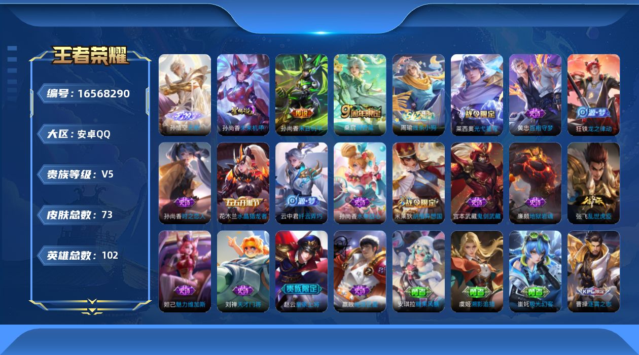 [16568290]安卓q-v5-永恒钻石v段位-102英雄-73皮肤-1无双-2传说-15史诗 【无双皮肤】:孙悟空无相 【传说皮肤】:桑启鸣野蒿,孙尚香末日机甲 【限定皮肤】:狄仁杰阴阳师,赵云皇家上将,达摩沙漠行僧,项羽海滩派对,沈梦溪大漠名商,米莱狄胡桃异想国,云中君纤云弄巧,鲁班大师探海日志,张良古海寻踪,鬼谷子天穹祈灯,刘邦剑破天穹 【赛季限定】:达摩沙漠行僧,沈梦溪大漠名商,鲁班大师探海日志,张良古海寻踪,鬼谷子天穹祈灯,刘邦剑破天穹 【战令限定】:米莱狄胡桃异想国,莱西奥光弋星穹,明世隐往忆晖光,周瑜线条小狗 【史诗皮肤】:赵云皇家上将,廉颇地狱岩魂,宫本武藏鬼剑武藏,孙尚香水果甜心,嬴政摇滚巨星,妲己魅力维加斯,张飞乱世虎臣,花木兰水晶猎龙者,刘禅天才门将,孙尚香时之恋人,云中君纤云弄巧,米莱狄胡桃异想国,狂铁龙之律动,黄忠百相守梦,莱西奥光弋星穹,周瑜线条小狗 【其他皮肤】:项羽海滩派对,露娜哥特玫瑰,阿轲爱心护理,宫本武藏未来纪元,妲己少女阿狸,亚瑟死亡骑士,张飞五福同心,甄姬花好人间,宫本武藏万象初新,后羿阿尔法小队,狄仁杰阴阳师,刘备纽约教父,孙尚香沉稳之力,刘禅秘密基地,典韦铁甲之心,达摩沙漠行僧,沈梦溪大漠名商,海月幻泉雾影,鲁班大师探海日志,李元芳妄想特派,张良古海寻踪,后羿完美运算,鬼谷子天穹祈灯,刘邦剑破天穹,姜子牙星梦巡礼,莱西奥踏浪烽翎,鬼谷子克喵,明世隐往忆晖光,曹操逐霄之志,蚩奼极光幻客,虞姬溯影追猎,安琪拉糖果风暴,鲁班七号木偶奇遇记,项羽帝国元帅,貂蝉异域舞娘,老夫子潮流仙人,王昭君精灵公主,孙悟空西部大镖客,兰陵王隐刃,钟馗地府判官,李元芳特种部队,虞姬加勒比小姐,夏侯惇战争骑士,诸葛亮星航指挥官,黄忠芝加哥教父,铠龙域领主,杨玉环霓裳曲,米莱狄精准探案法,元歌午夜歌剧院,李信灼热之刃,上官婉儿修竹墨客,曜归虚梦演,澜孤猎,云缨赤焰之缨 【营地id】:1676858780 【由于赛季三个月更新一次,段位皆有上号为准,对段位有要求这谨慎下单!!!】 【星元皮肤】:孙尚香未来机甲