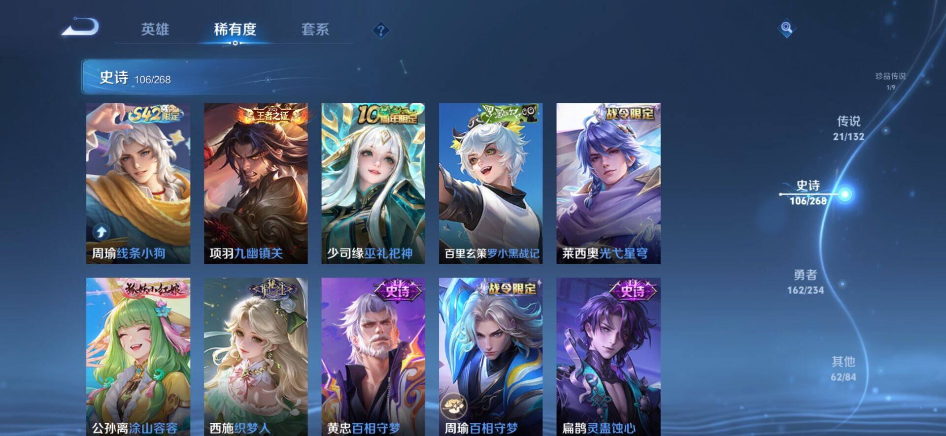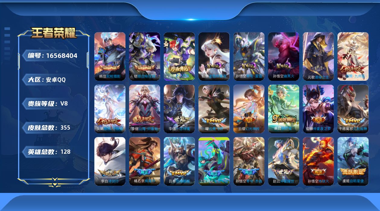 [16568404]安卓q-v8-最强王者段位-128英雄-354皮肤-2典藏皮肤-1珍品传说-21传说-105史诗 【英雄全皮】:元歌全皮,孙权全皮,橘右京全皮,李信全皮,猪八戒全皮,空空儿全皮,影全皮 【荣耀典藏】:铠银白咏叹调,韩信弑呛猎影 【珍品传说】:孙策时之奇旅 【传说皮肤】:后羿神树通天,元歌诡秘之主,女娲愿照千秋盛,澜愿照九州拓,云缨幻光神呛,桑启鸣野蒿,上官婉儿妄想奇谈,李信山海炽霜斩,吕布怒海麟威,李白诗剑行,橘右京枫霜尽,赵云淬星耀世,周瑜音你心动,虞姬启明星使,孙悟空零号赤焰,曜云鹰飞将,李信一念神魔,张良黄金白羊座,干将莫邪久胜战神,貂蝉仲夏夜之梦,孙悟空地狱火 【限定皮肤】:蔡文姬夏日便利店,虞姬夏日便利店,姜子牙天穹之誓,李白谪仙醉月,狄仁杰阴阳师,赵云皇家上将,阿轲迷踪丽影,钟无艳超时空战士,扁鹊奇幻香踪,白起夜都怪侠,元歌云间偶戏,元歌无心,甄姬落雪兰心,狄仁杰魔术师,达摩沙漠行僧,项羽海滩派对,关羽冰锋战神,程咬金演武夺筹,韩信傲雪梅呛,兰陵王金庭之子,橘右京枫霜尽,孙悟空至尊宝,孙悟空零号赤焰,李元芳银河之约,李元芳云中旅人,虞姬启明星使,钟馗驱傩正仪,杨戬潮玩骑兵,女娲朔望之晖,干将莫邪胡桃夹子,雅典娜黎明之约,鬼谷子五谷丰年,苏烈千军破阵,百里玄策原初追逐者,梦奇顽趣,沈梦溪大漠名商,明世隐吟游魔法,裴擒虎李小龙,裴擒虎擒涛扼浪,云中君纤云弄巧,李信山海炽霜斩,猪八戒西部大镖客,猪八戒猪悟能,上官婉儿梁祝,上官婉儿妄想奇谈,嫦娥拒霜思,嫦娥暖冬兔眠,西施玲珑珍味,鲁班大师探海日志,桑启海盐诗旅,暃星界游侠,戈娅驭风魔法,艾琳流音漫舞,司空震地狱燃心,阿古朵江河有灵,张良古海寻踪,蒙犽百解令,蒙恬荣光圣徽,高渐离燃音魔法,妲己灵卜魔法,鬼谷子天穹祈灯,沈梦溪龙舞盛年,鲁班七号蔬乡物语,李元芳蔬乡物语,刘邦剑破天穹,上官婉儿群星魔术团,程咬金群星魔术团,关羽决胜骁骑,镜青焰无极,项羽苍威无极,刘备异域游侠,芈月浮光幕影,周瑜熔金海岸 【年限皮肤】:李信山海炽霜斩,女娲愿照千秋盛,澜愿照九州拓 【赛季限定】:程咬金演武夺筹,钟馗驱傩正仪,苏烈千军破阵,达摩沙漠行僧,兰陵王金庭之子,沈梦溪大漠名商,李元芳云中旅人,桑启海盐诗旅,裴擒虎擒涛扼浪,鲁班大师探海日志,张良古海寻踪,鬼谷子天穹祈灯,刘邦剑破天穹,姜子牙天穹之誓,东皇太一噬灭天穹,太乙真人谧流