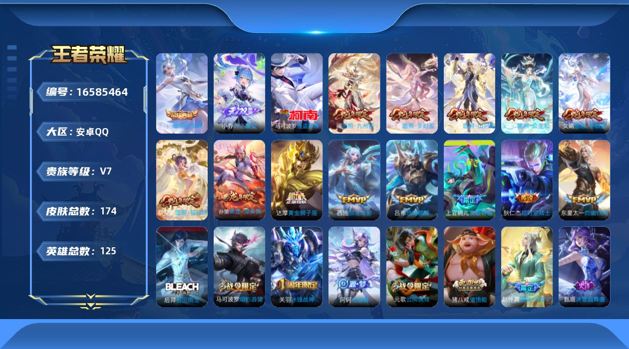 [16585464]v7 1典藏 1无双 1珍品传说 13传说 125英雄 174皮肤 可修改实名 男号 【英雄全皮】敖隐全皮猪八戒全皮 【稀有英雄】敖隐小龙人大司命嬴政始皇帝韩信韩跳跳夏洛特夏师傅艾琳橘右京橘子娜可露露鸟人不知火舞赵云金蝉唐僧戈娅 【荣耀水晶】最初的交响伽罗典藏 【无双皮】小乔时之魔女小乔无双 【珍品传说】怪盗基德 【传说皮】乘龙·淬吴钩孙策年限游龙清影小青龙黄金狮子座超时空战士-狄仁杰灼幽烈阳妄想奇谈 【珍宝阁皮】万物之道 【赛季/战令皮】噬灭天穹s37古海寻踪s33擒涛扼浪s31探海日志s32顽趣-梦奇剑破天穹s35天穹祈灯s34天穹之誓s36蔡文姬夏日便利店虞姬夏日便利店御霄s14御旌s15朔风刀s17混沌棋s18疑决卦s19醍醐杖s20原初探秘者s21万华元夜s22演武夺筹s23驱傩正仪s24千军破阵s25西部大镖客-猪八戒暗影游猎游乐娃子潮玩骑士王云间偶戏大漠名商s28 【史诗皮】器灵·浮梦炉星界战将百相守梦-百里守约茶境仙化蝶舞石田雨龙特工魅影千年之狐百解令蒙犽蒙恬荣光圣徽偶像歌手末日机甲-吕布猫狗日记-大乔乱世虎臣女仆咖啡水果甜心天才门将星夜王子心灵骇客德古拉伯爵幽灵船长鬼剑武藏乐园奇幻夜舞动绿茵地狱岩魂纤云弄巧缤纷独角兽乘风破浪逐浪之夏水晶猎龙者曙光守护者箭羽风息金属风暴原初追逐者圣诞狂欢鹰眼统帅黎明之约寅虎·御盾 【限定皮】愿照·九州拓澜年限愿照·福禄聚蔡文姬年限愿照·岁时盈虞姬年限愿照·山河定司空震年限愿照·众生和妲己年限愿照·千秋盛女娲年限逐霄战戟怒海麟威冰锋战神梁祝李小龙猪悟能寅虎·御盾廉颇年限 【普通皮】谧流熔炉敬我三分百相守梦-老夫子雾都夜雨访茗客苍林狼骑雪境奇遇-西施星梦巡礼灵卦秘语景韶洛都街头霸王功夫炙烤亚瑟鸿运当头熔金海岸经纬探寻者铁骨偃魂玫蓝誓约浪漫序章班班快跑虚灵犬护春野闲踪危途狂花零食大作战鬼谷子天穹祈灯s34完美运算时空谍影五福同心龙腾