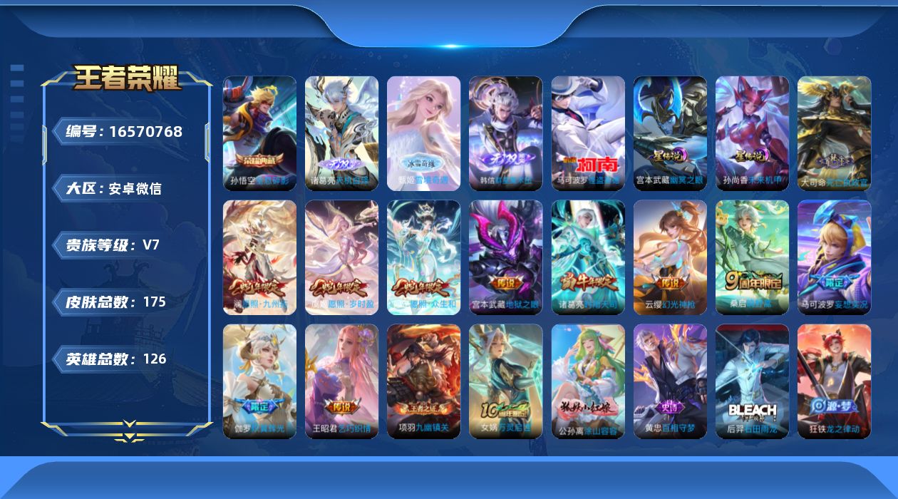 [16570768]安卓wx-v7-最强王者段位-126英雄-174皮肤-1典藏皮肤-3无双-1珍品传说-12传说-47史诗-星传说:孙尚香未来机甲,宫本武藏-幽冥之眼 【英雄全皮】:孙权全皮,影全皮 【荣耀典藏】:孙悟空全息碎影 【无双皮肤】:韩信群星魔术团,甄姬雪境奇遇,诸葛亮天机白泽 【珍品传说】:马可波罗怪盗基德 【传说皮肤】:后羿神树通天,大司命死亡执政官,妲己愿照众生和,澜愿照九州拓,虞姬愿照岁时盈,云缨幻光神呛,桑启鸣野蒿,马可波罗妄想实况,伽罗炽翼辉光,王昭君乞巧织情,诸葛亮时雨天司,宫本武藏地狱之眼 【限定皮肤】:蒙犽顽岩魄,姜子牙天穹之誓,李白谪仙醉月,狄仁杰阴阳师,赵云皇家上将,孙尚香蔷薇恋人,曹操烛龙,马可波罗妄想实况,狄仁杰魔术师,项羽海滩派对,孙悟空至尊宝,诸葛亮时雨天司,梦奇顽趣,狂铁御狮,伽罗炽翼辉光,鲁班大师探海日志,艾琳流音漫舞,司空震地狱燃心,阿古朵江河有灵,张良古海寻踪,蒙恬荣光圣徽,高渐离燃音魔法,妲己灵卜魔法,鬼谷子天穹祈灯,沈梦溪龙舞盛年,刘邦剑破天穹,程咬金群星魔术团,韩信群星魔术团 【年限皮肤】:诸葛亮时雨天司,伽罗炽翼辉光 【赛季限定】:曹操烛龙,张良古海寻踪,梦奇顽趣,狂铁御狮,鲁班大师探海日志,鬼谷子天穹祈灯,蒙恬荣光圣徽,刘邦剑破天穹,姜子牙天穹之誓 【战令限定】:艾琳流音漫舞,司空震地狱燃心,高渐离燃音魔法,妲己灵卜魔法 【史诗皮肤】:赵云皇家上将,赵云未来纪元,甄姬冰雪圆舞曲,狄仁杰魔术师,宫本武藏鬼剑武藏,孙尚香蔷薇恋人,孙尚香水果甜心,嬴政暗夜贵公子,妲己魅力维加斯,墨子龙骑士,刘禅绅士熊喵,李白千年之狐,吕布末日机甲,张飞乱世虎臣,孙悟空至尊宝,刘邦德古拉伯爵,夏侯惇乘风破浪,兰陵王暗隐猎兽者,诸葛亮黄金分割率,雅典娜冰冠公主,铠曙光守护者,李元芳逐浪之夏,程咬金功夫厨神,阿轲节奏热浪,大乔猫狗日记,狄仁杰鹰眼统帅,杨戬天秀启明,沈梦溪月团寄思,钟馗乐园奇幻夜,梦奇顽趣,司空震地狱燃心,阿古朵江河有灵,妲己灵卜魔法,高渐离燃音魔法,蒙恬荣光圣徽,蒙犽顽岩魄,李白谪仙醉月,百里守约百相守梦,牛魔星界战将,白起苍鳞隐世,赵怀真器灵浮梦炉,阿轲化蝶舞,刘禅鸭鸭历险记,狂铁龙之律动,后羿石田雨龙,黄忠百相守梦,公孙离涂山容容,女娲万灵启世 【其他皮肤】:项羽海滩派对,韩信教廷特使,韩信街头霸王,达摩大发明家,赵云白执事,赵云