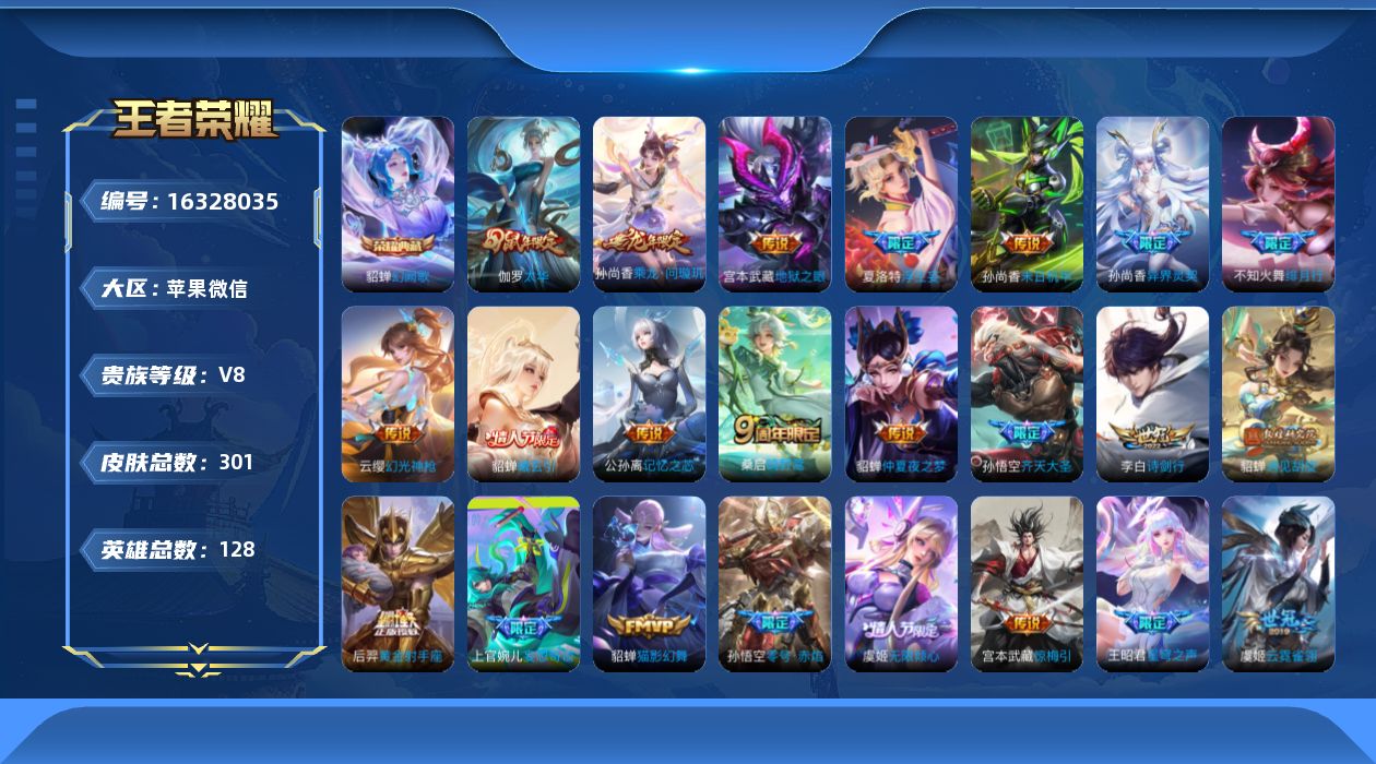 [16328035]苹果wx-v8-至尊星耀iii段位-127英雄-296皮肤-1典藏皮肤-26传说-99史诗-3星传 【英雄全皮】:姜子牙全皮 【荣耀典藏】:貂蝉幻阙歌 【传说皮肤】:后羿神树通天,云缨幻光神呛,桑启鸣野蒿,貂蝉曦玄引,孙尚香乘龙问璇玑,宫本武藏惊梅引,上官婉儿妄想奇谈,公孙离记忆之芯,夏洛特浮生妄,虞姬无限倾心,孙悟空齐天大圣,李白诗剑行,不知火舞绯月行,王昭君星穹之声,孙尚香音你闪耀,孙尚香异界灵契,貂蝉遇见胡旋,虞姬启明星使,孙悟空零号赤焰,伽罗太华,貂蝉猫影幻舞,虞姬云霓雀翎,后羿黄金射手座,貂蝉仲夏夜之梦,孙尚香末日机甲,宫本武藏地狱之眼 【限定皮肤】:蔡文姬夏日便利店,大乔绒语心约,虞姬夏日便利店,姜子牙天穹之誓,狄仁杰阴阳师,赵云皇家上将,墨子神迹守卫,妲己热情桑巴,妲己时之彼端,嬴政优雅恋人,孙尚香蔷薇恋人,孙尚香异界灵契,鲁班七号乒乒小将,庄周高山流水,钟无艳超时空战士,扁鹊奇幻香踪,白起夜都怪侠,芈月白晶晶,芈月幻夜卜梦,元歌无心,甄姬落雪兰心,狄仁杰魔术师,狄仁杰万华元夜,达摩星际陆战队,达摩沙漠行僧,项羽海滩派对,老夫子醍醐杖,老夫子航海奇遇记,貂蝉逐梦之音,貂蝉遇见胡旋,程咬金演武夺筹,韩信逐梦之影,王昭君午后时光,王昭君星穹之声,兰陵王金庭之子,不知火舞绯月行,孙悟空美猴王,孙悟空至尊宝,孙悟空零号赤焰,孙悟空孙行者,孙悟空齐天大圣,后羿圣弓游侠,李元芳云中旅人,虞姬启明星使,虞姬无限倾心,钟馗驱傩正仪,杨玉环遇见飞天,杨戬潮玩骑兵,干将莫邪真爱魔法,雅典娜单词大作战,雅典娜黎明之约,鬼谷子原初探秘者,鬼谷子五谷丰年,黄忠火炮绅士,苏烈千军破阵,梦奇顽趣,公孙离蜜橘之夏,公孙离玉兔公主,沈梦溪大漠名商,明世隐吟游魔法,裴擒虎擒涛扼浪,狂铁电玩高手,米莱狄胡桃异想国,云中君纤云弄巧,伽罗太华,伽罗天狼溯光者,上官婉儿梁祝,上官婉儿天狼绘梦者,上官婉儿神器万象笔,上官婉儿妄想奇谈,嫦娥拒霜思,嫦娥暖冬兔眠,西施玲珑珍味,蒙犽狂想玩偶喵,鲁班大师探海日志,桑启海盐诗旅,夏洛特浮生妄,金蝉唐三藏,暃星界游侠,戈娅驭风魔法,艾琳流音漫舞,司空震地狱燃心,阿古朵江河有灵,张良古海寻踪,蒙犽百解令,蒙恬荣光圣徽,高渐离燃音魔法,妲己灵卜魔法,鬼谷子天穹祈灯,姬小满妄想食味,孙尚香乘龙问璇玑,貂蝉曦玄引,沈梦溪龙舞盛年,鲁班七号蔬乡物语,李元芳蔬乡物语,