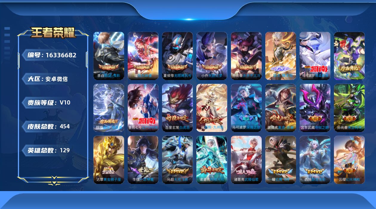 [16336682]安卓wx-v10-至尊星耀iv段位-128英雄-450皮肤-5典藏皮肤-1典藏英雄-1无双-4珍品传说-35传说-135史诗-5星传 【英雄全皮】:刘禅全皮,阿轲全皮,达摩全皮,孙权全皮,钟馗全皮,苍全皮,太乙真人全皮,狂铁全皮,鲁班大师全皮,金蝉全皮,戈娅全皮,空空儿全皮,影全皮 【荣耀典藏】:武则天英雄,夏侯惇无限飓风号,小乔天鹅之梦,孙尚香杀手不太冷,李白鸣剑曳影,瑶拾光映像 【无双皮肤】:曜器灵螭龙剑,韩信群星魔术团 【珍品传说】:马可波罗怪盗基德,鲁班七号江户川柯南,孙策时之奇旅,嫦娥器灵落星盏 【传说皮肤】:后羿神树通天,澜愿照九州拓,云缨幻光神呛,桑启鸣野蒿,艾琳觅芳踪,孙尚香音你闪耀,马可波罗深海之息,后羿无尽星芒,马超无双飞将,大乔挚爱花嫁,孙策挚爱之约,露娜启示之音,裴擒虎寅虎赤拳,赵云淬星耀世,西施游龙清影,李元芳飞鸢探春,诸葛亮时雨天司,虞姬启明星使,曜云鹰飞将,李信一念神魔,刘备时之恋人,貂蝉猫影幻舞,干将莫邪久胜战神,虞姬云霓雀翎,达摩黄金狮子座,百里玄策白虎志,花木兰冠军飞将,梦奇胖达荣荣,诸葛亮武陵仙君,貂蝉仲夏夜之梦,孙尚香末日机甲,宫本武藏地狱之眼,孙悟空地狱火,武则天海洋之心,狄仁杰超时空战士 【限定皮肤】:白起狰,姜子牙天穹之誓,狄仁杰阴阳师,虞姬凯尔特女王,赵云皇家上将,赵云百木心呛,墨子神迹守卫,嬴政优雅恋人,嬴政白昼王子,鲁班七号狮舞东方,庄周高山流水,高渐离死亡摇滚,阿轲迷踪丽影,钟无艳超时空战士,孙膑妖精王,扁鹊炼金王,白起夜都怪侠,芈月重明,芈月幻夜卜梦,吕布猎兽之王,周瑜赤莲之焰,元歌云间偶戏,元歌无心,夏侯惇朔风刀,夏侯惇匿光决锋者,甄姬游园惊梦,甄姬落雪兰心,曹操烛龙,典韦蓝屏警告,马可波罗暗影游猎,马可波罗深海之息,狄仁杰魔术师,狄仁杰万华元夜,达摩星际陆战队,达摩沙漠行僧,项羽海滩派对,项羽霸王别姬,老夫子醍醐杖,老夫子航海奇遇记,关羽冰锋战神,程咬金演武夺筹,露娜启示之音,刘邦夺宝奇兵,王昭君凤凰于飞,王昭君午后时光,兰陵王驯魔猎人,兰陵王金庭之子,亚瑟潮玩骑士王,牛魔御旌,后羿圣弓游侠,后羿无尽星芒,李元芳银河之约,李元芳云中旅人,虞姬霸王别姬,虞姬启明星使,钟馗神迹守卫,钟馗驱傩正仪,杨玉环遇见飞天,女娲朔望之晖,干将莫邪真爱魔法,雅典娜单词大作战,雅典娜黎明之约,蔡文姬繁星吟游,太乙真人饕餮,太