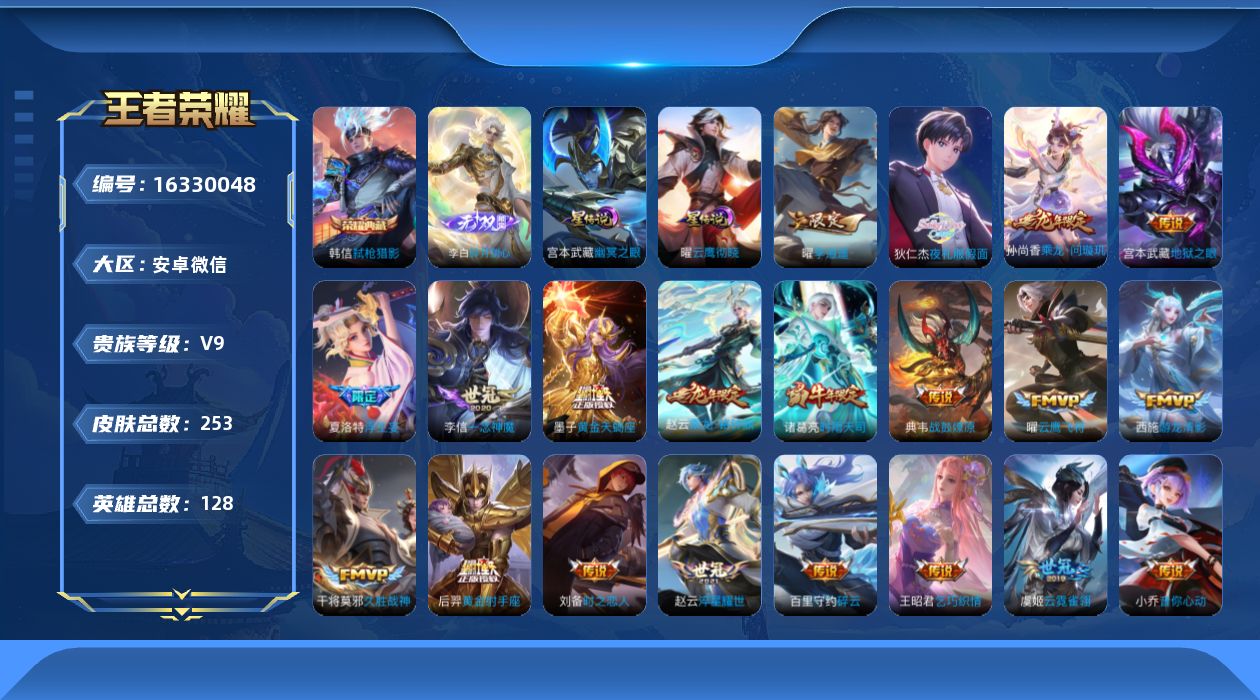 [16330048]安卓wx-v9-最强王者段位-128英雄-253皮肤-1典藏皮肤-2星元-1无双-28传说-75史诗 【英雄全皮】:孙权全皮,夏洛特全皮,影全皮,海诺全皮 【荣耀典藏】:韩信弑呛猎影 【无双皮肤】:李白碎月剑心 【传说皮肤】:后羿神树通天,墨子黄金天蝎座,典韦战鼓燎原,孙尚香乘龙问璇玑,赵云乘龙铭钟鼎,孙膑小动物乐团,狄仁杰夜礼服假面,东皇太一灼幽烈阳,夏洛特浮生妄,百里守约碎云,孙尚香音你闪耀,赵云淬星耀世,王昭君乞巧织情,西施游龙清影,曜李 ,周瑜音你心动,小乔音你心动,李元芳飞鸢探春,诸葛亮时雨天司,铠绛天战甲,虞姬启明星使,曜云鹰飞将,李信一念神魔,刘备时之恋人,干将莫邪久胜战神,虞姬云霓雀翎,后羿黄金射手座,宫本武藏地狱之眼 【限定皮肤】:蔡文姬夏日便利店,虞姬夏日便利店,赵云皇家上将,高渐离玩趣恶龙,芈月白晶晶,典韦蓝屏警告,马可波罗暗影游猎,狄仁杰魔术师,项羽海滩派对,孙悟空大圣娶亲,孙悟空孙行者,虞姬启明星使,杨戬潮玩骑兵,蔡文姬奇迹圣诞,诸葛亮时雨天司,黄忠烈魂,百里玄策原初追逐者,曜李 ,鲁班大师探海日志,夏洛特浮生妄,艾琳流音漫舞,司空震地狱燃心,张良古海寻踪,狄仁杰夜礼服假面,高渐离燃音魔法,妲己灵卜魔法,鬼谷子天穹祈灯,李白碎月剑心,伽罗琥珀纪元,安琪拉乘龙聚宝船,孙尚香乘龙问璇玑,赵云乘龙铭钟鼎,沈梦溪龙舞盛年,鲁班七号蔬乡物语,李元芳蔬乡物语,刘邦剑破天穹,程咬金群星魔术团,海诺心动手记,刘备异域游侠 【年限皮肤】:诸葛亮时雨天司,黄忠烈魂,安琪拉乘龙聚宝船,孙尚香乘龙问璇玑,赵云乘龙铭钟鼎 【赛季限定】:张良古海寻踪,百里玄策原初追逐者,鲁班大师探海日志,鬼谷子天穹祈灯,刘邦剑破天穹 【战令限定】:蔡文姬夏日便利店,虞姬夏日便利店,典韦蓝屏警告,马可波罗暗影游猎,艾琳流音漫舞,杨戬潮玩骑兵,司空震地狱燃心,高渐离燃音魔法,妲己灵卜魔法,鲁班七号蔬乡物语,李元芳蔬乡物语 【史诗皮肤】:鲁班七号电玩小子,项羽苍穹之光,露娜紫霞仙子,赵云皇家上将,赵云未来纪元,貂蝉圣诞恋歌,甄姬冰雪圆舞曲,狄仁杰魔术师,廉颇地狱岩魂,宫本武藏鬼剑武藏,孙尚香水果甜心,嬴政暗夜贵公子,嬴政摇滚巨星,妲己魅力维加斯,妲己女仆咖啡,墨子龙骑士,吕布圣诞狂欢,吕布末日机甲,花木兰水晶猎龙者,刘邦德古拉伯爵,夏侯惇乘风破浪,兰陵王暗隐猎兽者,诸葛亮黄金分割
