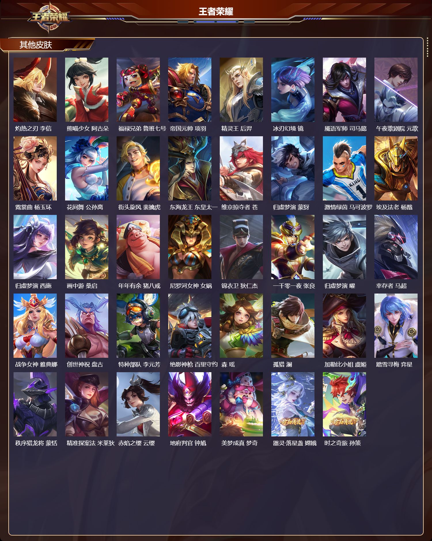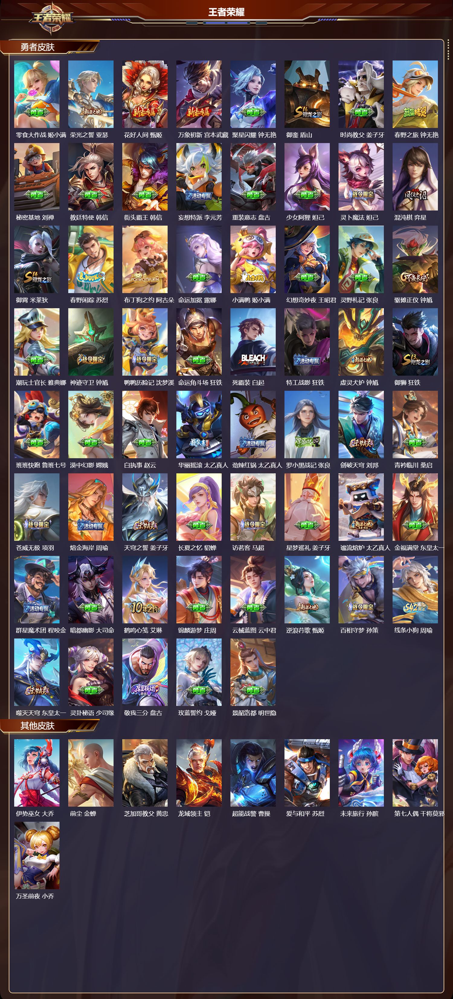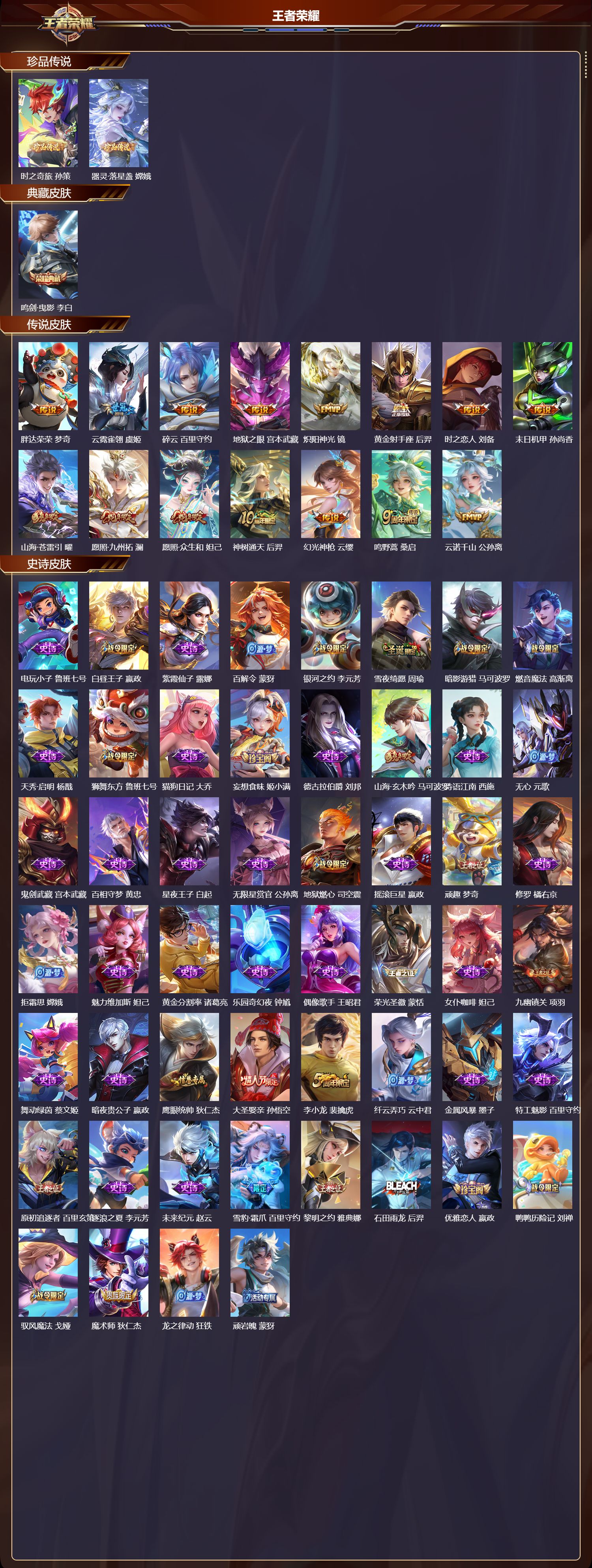 苹果qq/最强王者/317皮肤/124英雄/1典藏/0珍品无双/0无双/2珍品传说/15传说/96史诗/7稀有英雄【2 珍品传说】时之奇旅 孙策器灵·落星盏 嫦娥【1 典藏皮肤】鸣剑·曳影 李白【15 传说皮肤】胖达荣荣 梦奇云霓雀翎 虞姬碎云 百里守约地狱之眼 宫本武藏炽阳神光 镜黄金射手座 后羿时之恋人 刘备末日机甲 孙尚香山海·苍雷引 曜愿照·九州拓 澜愿照·众生和