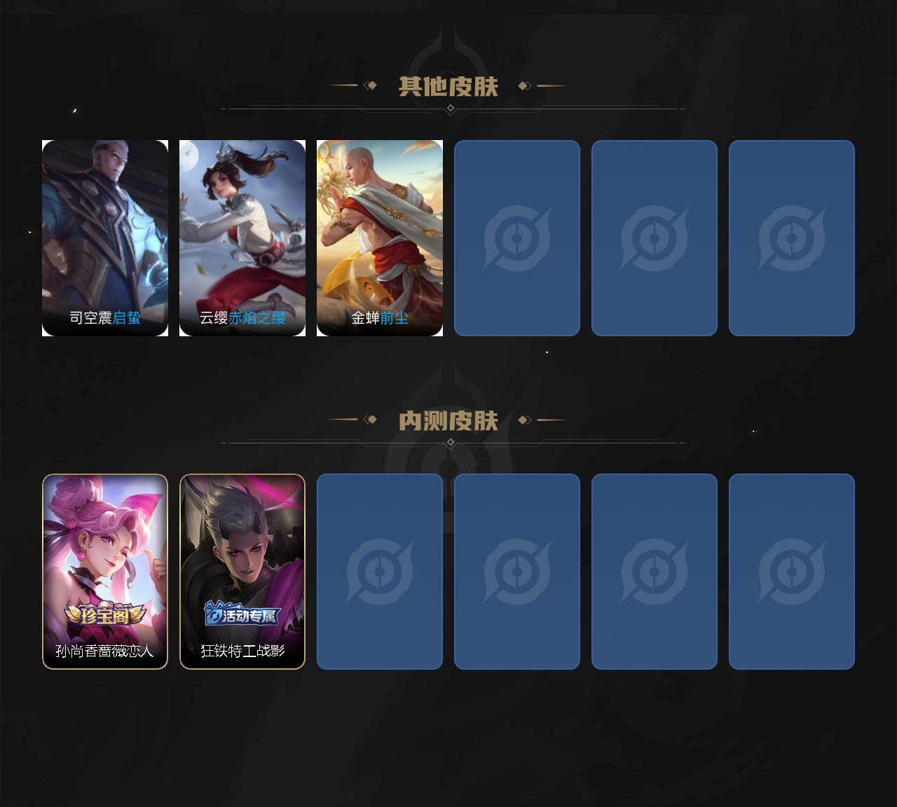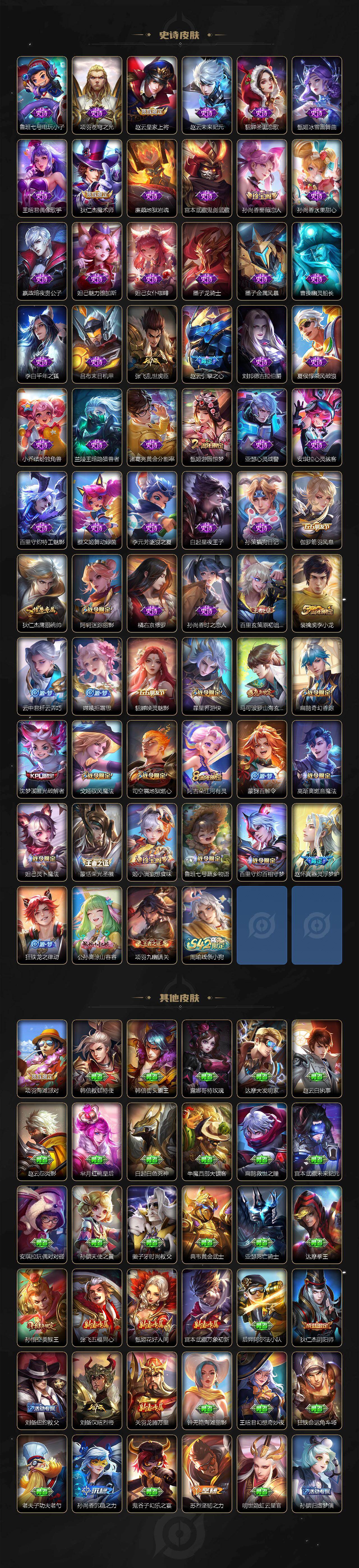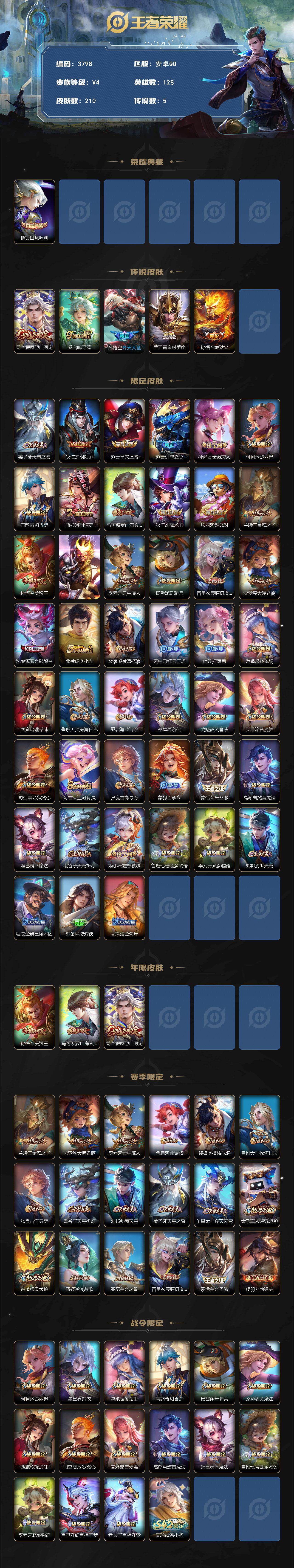 128英雄-210皮肤-贵族4/皮肤210/典藏1/传说5/史诗62/英雄128/司空震全皮/戈娅全皮/银白咏叹调 铠/愿照·山河定 司空震/鸣野蒿 桑启/齐天大圣 孙悟空/黄金射手座 后羿/地狱火 孙悟空/天穹之誓 姜子牙/阴阳师 狄仁杰/皇家上将 赵云/引擎之心 赵云/蔷薇恋人 孙尚香/迷踪丽影 阿轲/奇幻香踪 扁鹊/游园惊梦 甄姬/山海·玄木吟 马可波罗/魔术师 狄仁杰/海滩派对 项羽/金庭之子 兰陵王/美猴王