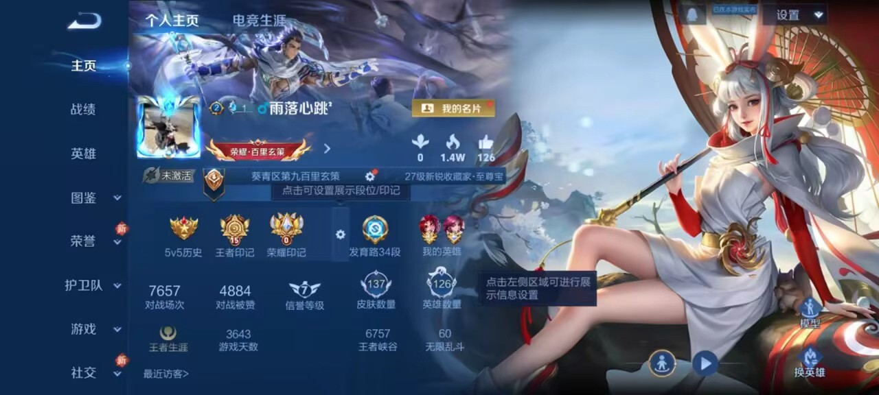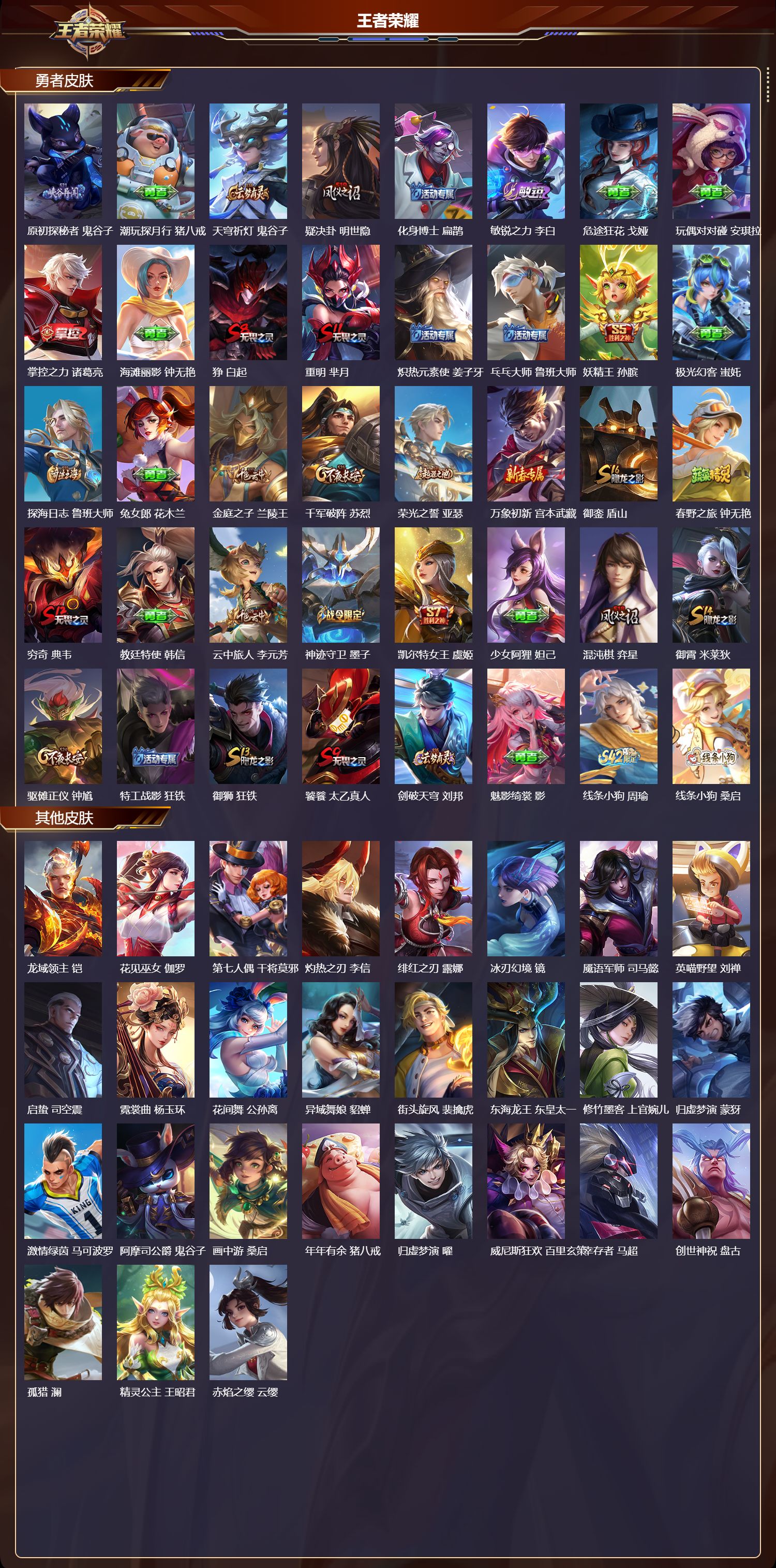 安卓qq/至尊星耀/137皮肤/126英雄/0典藏/0珍品无双/0无双/0珍品传说/10传说/31史诗/7稀有英雄【10 传说皮肤】白虎志 百里玄策地狱火 孙悟空诗剑行 李白遇见胡旋 貂蝉祈雪灵祝 公孙离炽阳神光 镜久胜战神 干将莫邪画中仙 干将莫邪太华 伽罗万灵伏威 曹操【31 史诗皮肤】玉兔公主 公孙离摇滚巨星 嬴政顽趣 梦奇修罗 橘右京拒霜思 嫦娥黄金分割率 诸