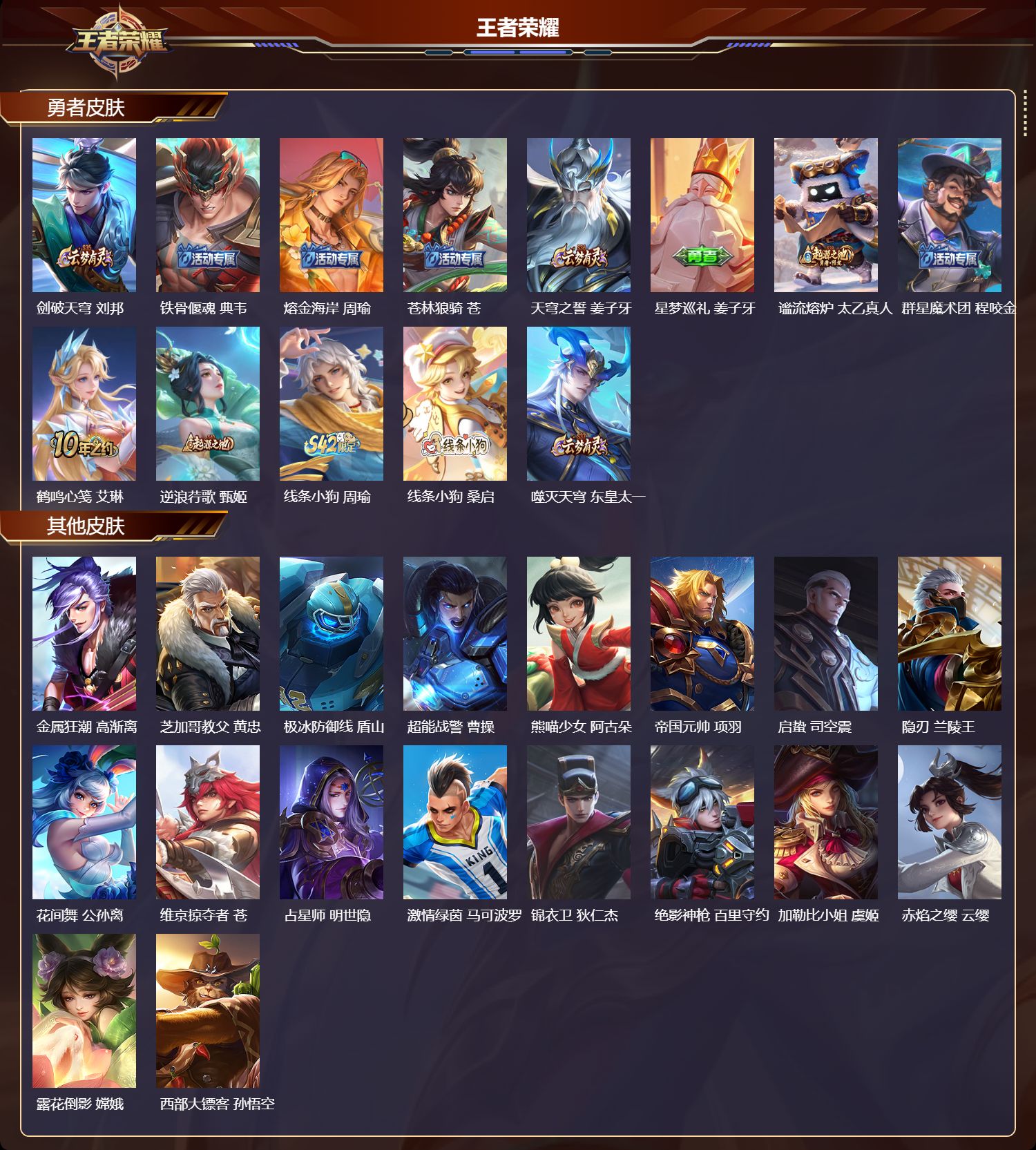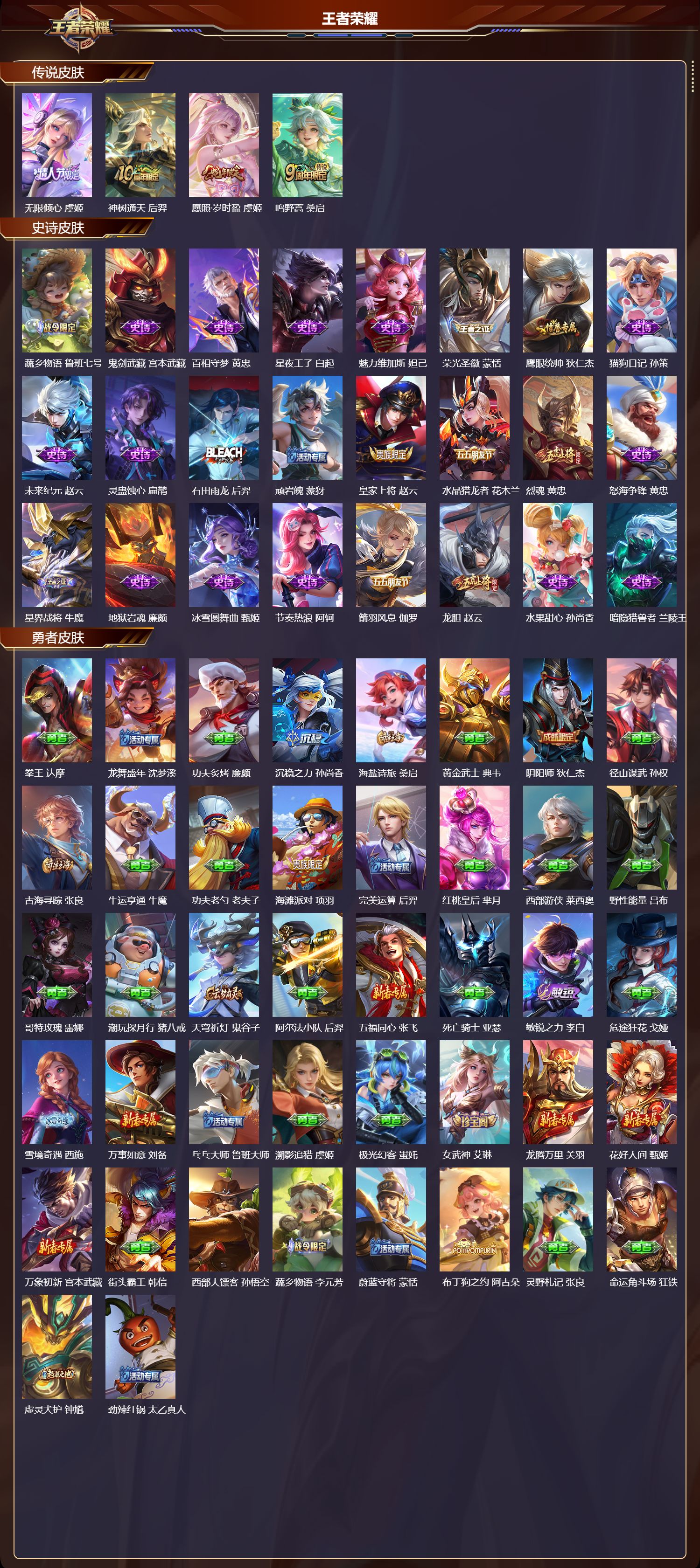 安卓qq/至尊星耀/100皮肤/114英雄/0典藏/0珍品无双/0无双/0珍品传说/4传说/24史诗/5稀有英雄【4 传说皮肤】无限倾心 虞姬神树通天 后羿愿照·岁时盈 虞姬鸣野蒿 桑启【24 史诗皮肤】蔬乡物语 鲁班七号鬼剑武藏 宫本武藏百相守梦 黄忠星夜王子 白起魅力维加斯 妲己荣光圣徽 蒙恬鹰眼统帅 狄仁杰猫狗日记 孙策未来纪元 赵云灵蛊蚀心 扁鹊石田雨龙 后羿