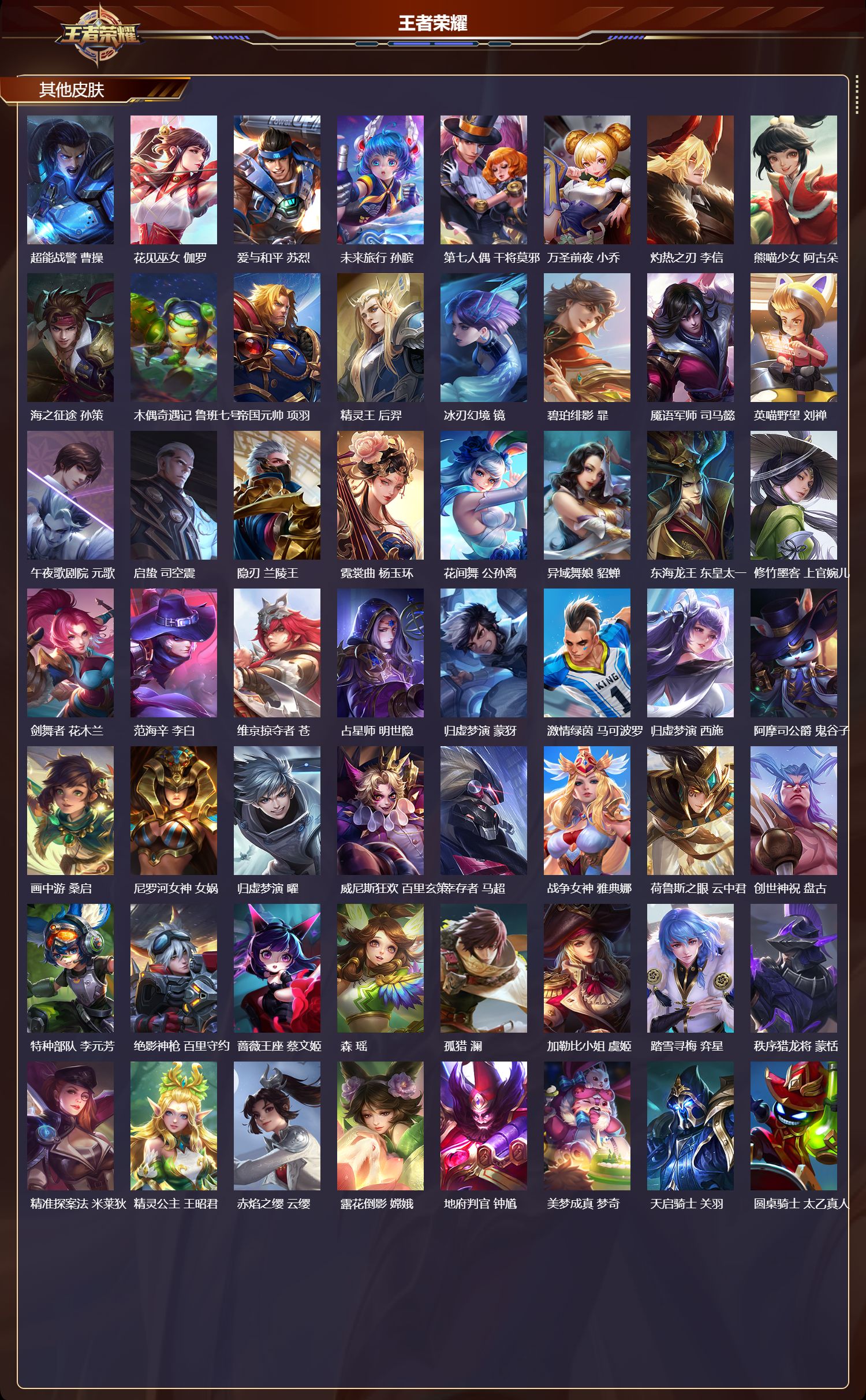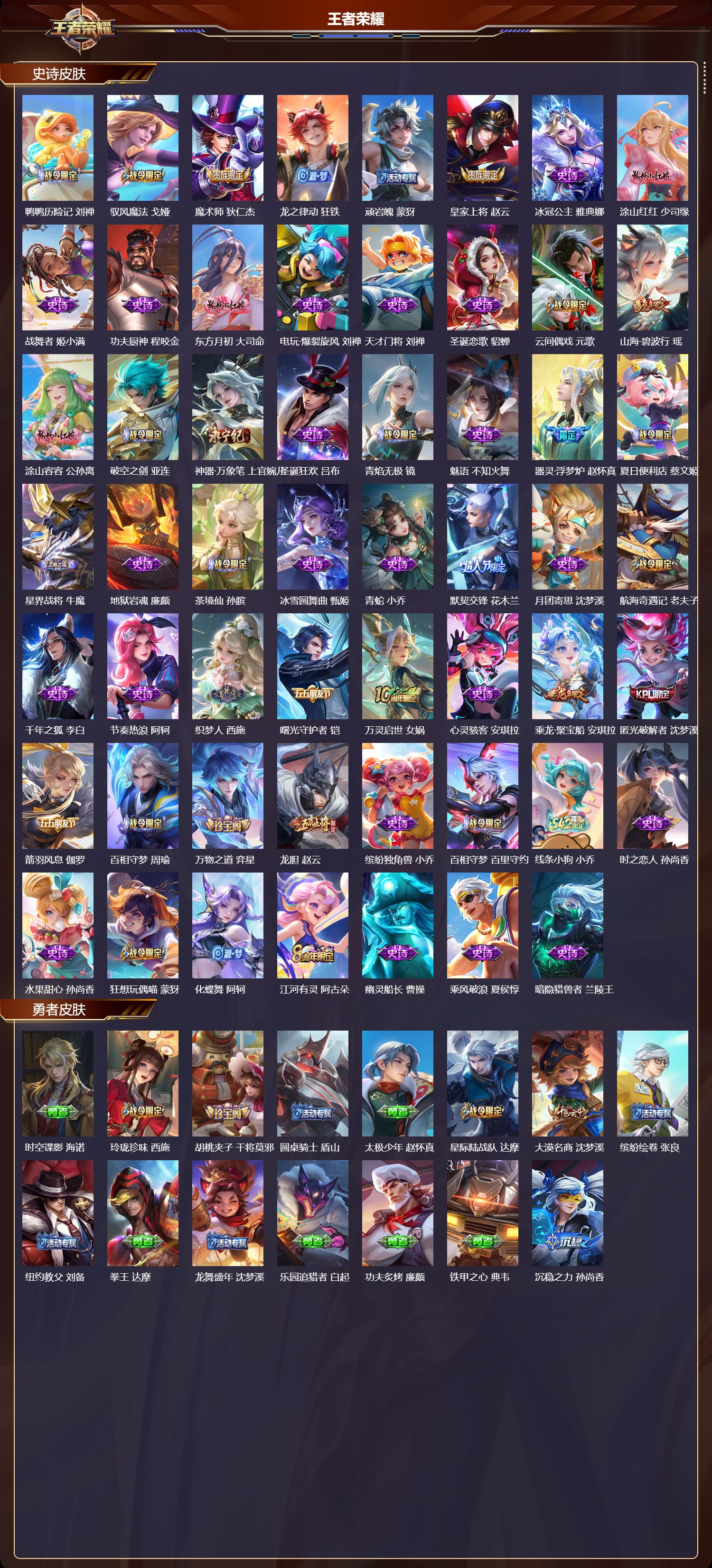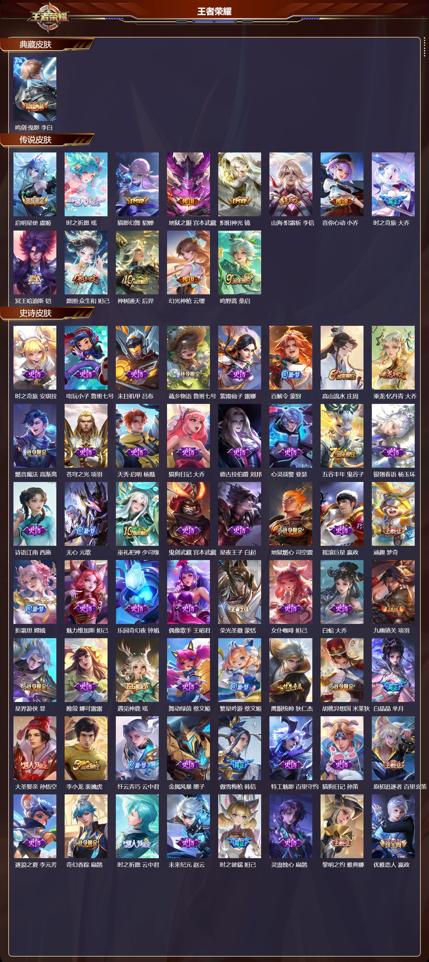 126英雄-336皮肤-安卓qq/至尊星耀/336皮肤/126英雄/1典藏/0珍品无双/0无双/0珍品传说/13传说/111史诗/9稀有英雄【1 典藏皮肤】鸣剑·曳影 李白【13 传说皮肤】启明星使 虞姬时之祈愿 瑶猫影幻舞 貂蝉地狱之眼 宫本武藏炽阳神光 镜山海·炽霜斩 李信音你心动 小乔时之奇旅 大乔冥王哈迪斯 铠愿照·众生和 妲己神树通天 后羿幻光神呛 云缨鸣野蒿 桑启【111 史诗皮肤