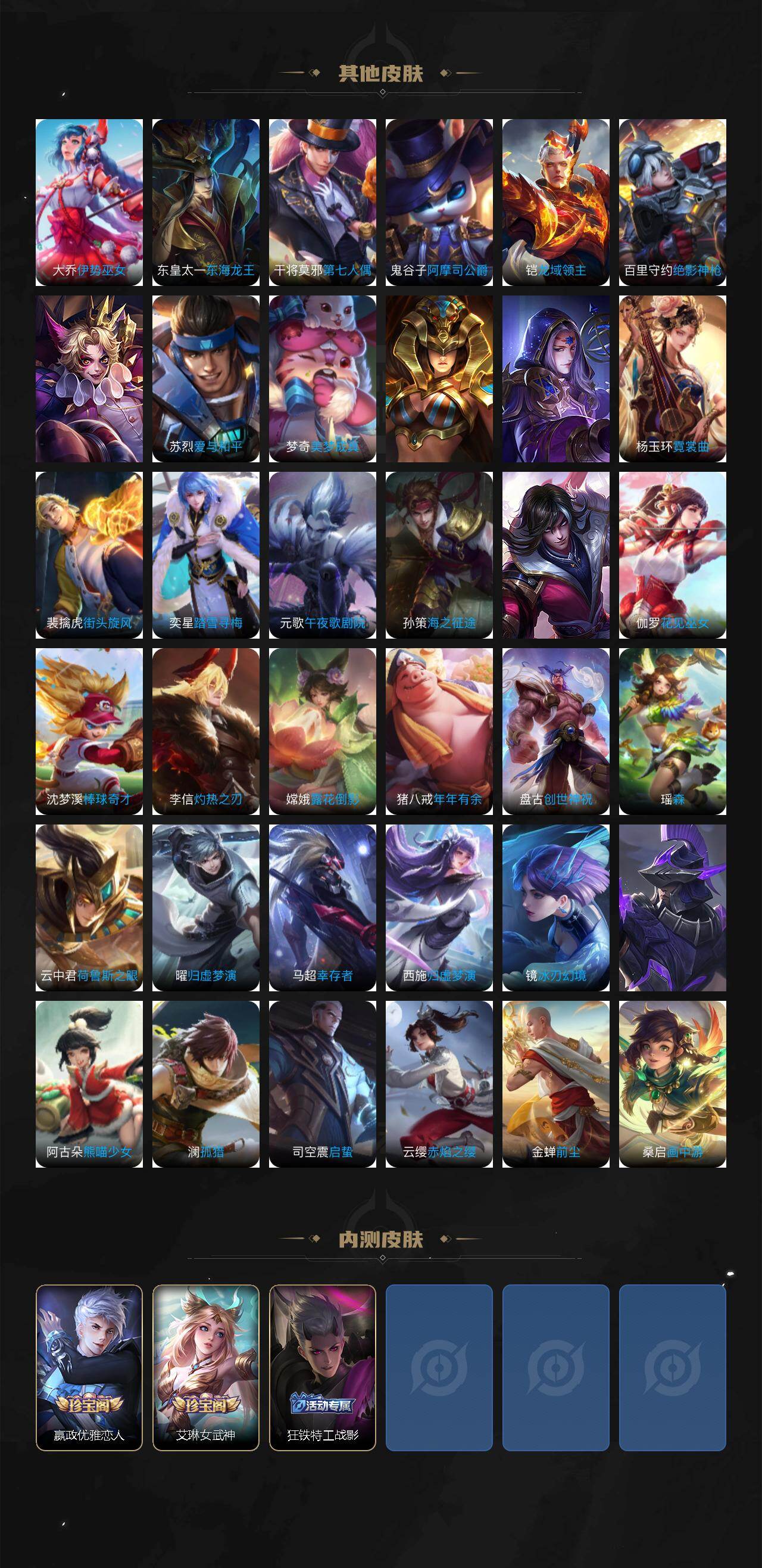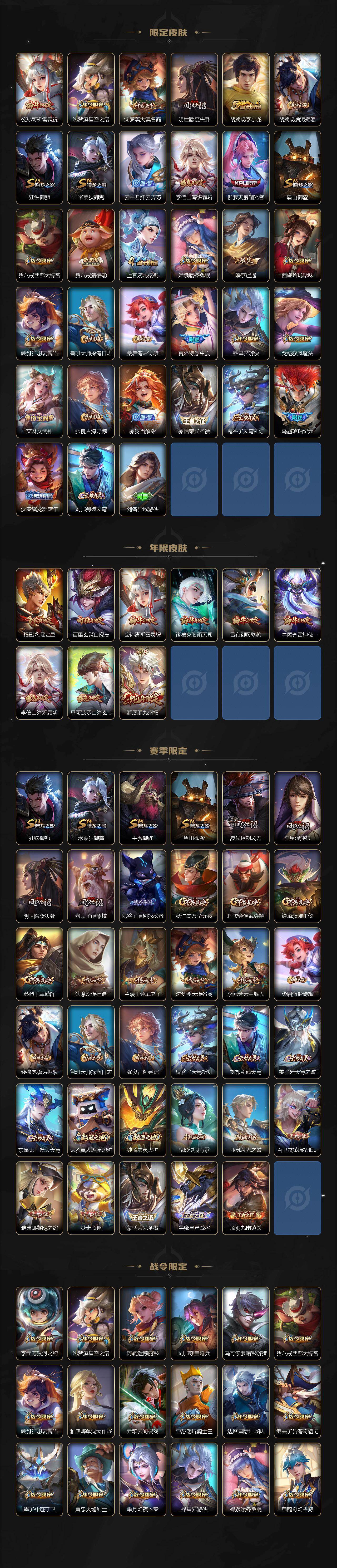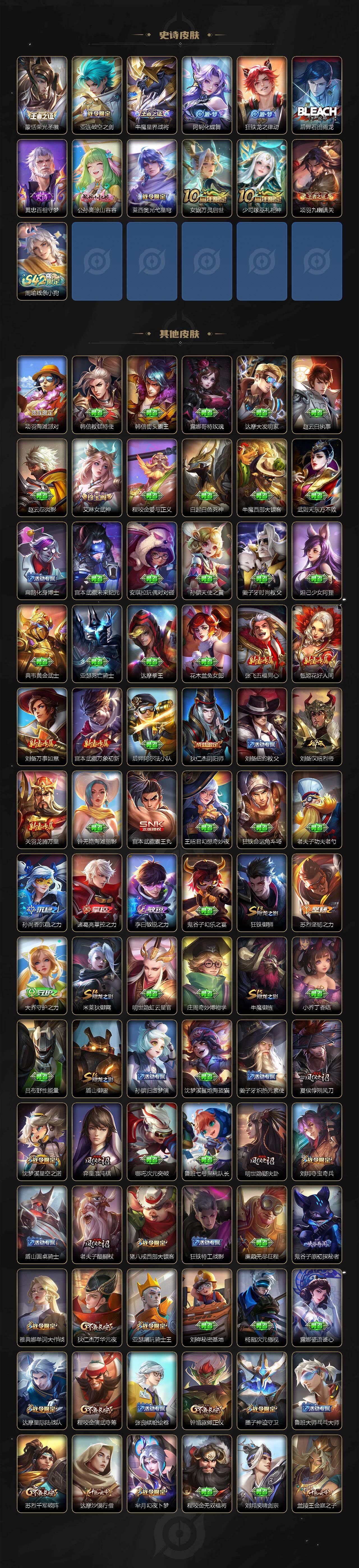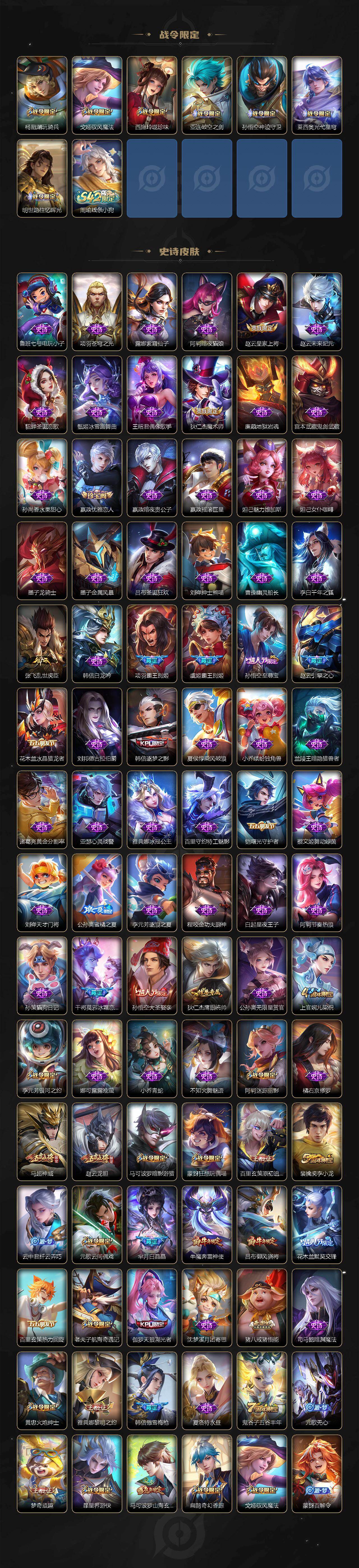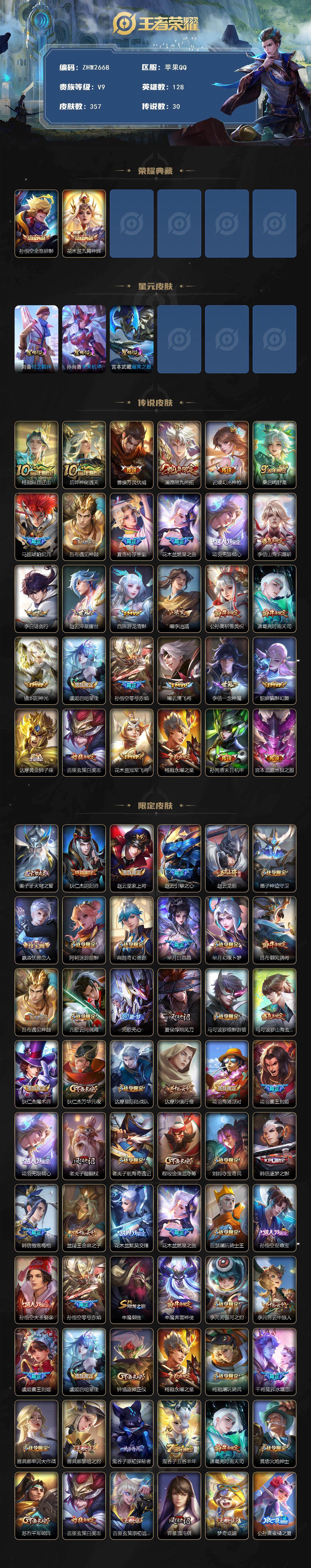 苹果q-v9-最强王者段位-128英雄-357皮肤-2典藏皮肤-30传说-102史诗 【英雄全皮】:达摩全皮,刘邦全皮,孙权全皮,李信全皮,猪八戒全皮,蒙恬全皮,夏洛特全皮,空空儿全皮,影全皮 【荣耀典藏】:孙悟空全息碎影,花木兰九霄神辉 【传说皮肤】:杨戬纵目迁山,后羿神树通天,曹操万灵伏威,澜愿照九州拓,云缨幻光神呛,桑启鸣野蒿,马超琥珀纪元,吕布遇见神鼓,夏洛特浮生妄,花木兰燃星之曲,项羽无限倾心,李信山海炽霜斩,李白诗剑行,赵云淬星耀世,西施游龙清影,曜李 ,公孙离祈雪灵祝,诸葛亮时雨天司,镜炽阳神光,虞姬启明星使,孙悟空零号赤焰,曜云鹰飞将,李信一念神魔,貂蝉猫影幻舞,达摩黄金狮子座,百里玄策白虎志,花木兰冠军飞将,杨戬永曜之星,孙尚香末日机甲,宫本武藏地狱之眼 【限定皮肤】:姜子牙天穹之誓,狄仁杰阴阳师,赵云皇家上将,赵云引擎之心,赵云龙胆,墨子神迹守卫,嬴政优雅恋人,阿轲迷踪丽影,扁鹊奇幻香踪,芈月白晶晶,芈月幻夜卜梦,吕布御风骁将,吕布遇见神鼓,元歌云间偶戏,元歌无心,夏侯惇朔风刀,马可波罗暗影游猎,马可波罗山海玄木吟,狄仁杰魔术师,狄仁杰万华元夜,达摩星际陆战队,达摩沙漠行僧,项羽海滩派对,项羽霸王别姬,项羽无限倾心,老夫子醍醐杖,老夫子航海奇遇记,程咬金演武夺筹,刘邦夺宝奇兵,韩信逐梦之影,韩信傲雪梅呛,兰陵王金庭之子,花木兰默契交锋,花木兰燃星之曲,亚瑟潮玩骑士王,孙悟空至尊宝,孙悟空大圣娶亲,孙悟空零号赤焰,牛魔御旌,牛魔奔雷神使,李元芳银河之约,李元芳云中旅人,虞姬霸王别姬,虞姬启明星使,钟馗驱傩正仪,杨戬永曜之星,杨戬潮玩骑兵,干将莫邪冰霜恋舞曲,雅典娜单词大作战,雅典娜黎明之约,鬼谷子原初探秘者,鬼谷子五谷丰年,诸葛亮时雨天司,黄忠火炮绅士,苏烈千军破阵,百里玄策白虎志,百里玄策原初追逐者,弈星混沌棋,梦奇顽趣,公孙离蜜橘之夏,公孙离祈雪灵祝,沈梦溪星空之诺,沈梦溪大漠名商,明世隐疑决卦,裴擒虎李小龙,裴擒虎擒涛扼浪,狂铁御狮,米莱狄御霄,云中君纤云弄巧,李信山海炽霜斩,伽罗天狼溯光者,盾山御銮,猪八戒西部大镖客,猪八戒猪悟能,上官婉儿梁祝,嫦娥暖冬兔眠,曜李 ,西施玲珑珍味,蒙犽狂想玩偶喵,鲁班大师探海日志,桑启海盐诗旅,夏洛特浮生妄,暃星界游侠,戈娅驭风魔法,艾琳女武神,张良古海寻踪,蒙犽百解令,蒙恬荣光圣徽,鬼谷子天穹祈灯,马超琥珀纪元,沈梦溪龙舞盛年,刘邦剑破天穹,刘备异域游侠 【年限皮肤】:杨戬永曜之星,百里玄策白虎志,公孙离祈雪灵祝,诸葛亮时雨天司,吕布御风骁将,牛魔奔雷神使,李信山海炽霜斩,马可波罗山海玄木吟,澜愿照九州拓 【赛季限定】:狂铁御狮,米莱狄御霄,牛魔御旌,盾山御銮,夏侯惇朔风刀,弈星混沌棋,明世隐疑决卦,老夫子醍醐杖,鬼谷子原初探秘者,狄仁杰万华元夜,程咬金演武夺筹,钟馗驱傩正仪,苏烈千军破阵,达摩沙漠行僧,兰陵王金庭之子,沈梦溪大漠名商,李元芳云中旅人,桑启海盐诗旅,裴擒虎擒涛扼浪,鲁班大师探海日志,张良古海寻踪,鬼谷子天穹祈灯,刘邦剑破天穹,姜子牙天穹之誓,东皇太一噬灭天穹,太乙真人谧流熔炉,钟馗虚灵犬护,甄姬逆浪荇歌,亚瑟荣光之誓,百里玄策原初追逐者,雅典娜黎明之约,梦奇顽趣,蒙恬荣光圣徽,牛魔星界战将,项羽九幽镇关 【战令限定】:李元芳银河之约,沈梦溪星空之诺,阿轲迷踪丽影,刘邦夺宝奇兵,马可波罗暗影游猎,猪八戒西部大镖客,蒙犽狂想玩偶喵,雅典娜单词大作战,元歌云间偶戏,亚瑟潮玩骑士王,达摩星际陆战队,老夫子航海奇遇记,墨子神迹守卫,黄忠火炮绅士,芈月幻夜卜梦,暃星界游侠,嫦娥暖冬兔眠,扁鹊奇幻香踪,杨戬潮玩骑兵,戈娅驭风魔法,西施玲珑珍味,亚连破空之剑,孙悟空神迹守卫,莱西奥光弋星穹,明世隐往忆晖光,周瑜线条小狗 【史诗皮肤】:鲁班七号电玩小子,项羽苍穹之光,露娜紫霞仙子,阿轲暗夜猫娘,赵云皇家上将,赵云未来纪元,貂蝉圣诞恋歌,甄姬冰雪圆舞曲,王昭君偶像歌手,狄仁杰魔术师,廉颇地狱岩魂,宫本武藏鬼剑武藏,孙尚香水果甜心,嬴政优雅恋人,嬴政暗夜贵公子,嬴政摇滚巨星,妲己魅力维加斯,妲己女仆咖啡,墨子龙骑士,墨子金属风暴,吕布圣诞狂欢,刘禅绅士熊喵,曹操幽灵船长,李白千年之狐,张飞乱世虎臣,韩信白龙吟,项羽霸王别姬,虞姬霸王别姬,孙悟空至尊宝,赵云引擎之心,花木兰水晶猎龙者,刘邦德古拉伯爵,韩信逐梦之影,夏侯惇乘风破浪,小乔缤纷独角兽,兰陵王暗隐猎兽者,诸葛亮黄金分割率,亚瑟心灵战警,雅典娜冰冠公主,百里守约特工魅影,铠曙光守护者,蔡文姬舞动绿茵,刘禅天才门将,公孙离蜜橘之夏,李元芳逐浪之夏,程咬金功夫厨神,白起星夜王子,阿轲节奏热浪,孙策猫狗日记,干将莫邪冰霜恋舞曲,孙悟空大圣娶亲,狄仁杰鹰眼统帅,公孙离无限星赏官,上官婉儿梁祝,李元芳银河之约,娜可露露晚萤,小乔青蛇,不知火舞魅语,阿轲迷踪丽影,橘右京修罗,马超神威,赵云龙胆,马可波罗暗影游猎,蒙犽狂想玩偶喵,百里玄策原初追逐者,裴擒虎李小龙,云中君纤云弄巧,元歌云间偶戏,芈月白晶晶,牛魔奔雷神使,吕布御风骁将,花木兰默契交锋,百里玄策热力回旋,老夫子航海奇遇记,伽罗天狼溯光者,沈梦溪月团寄思,猪八戒猪悟能,司马懿暗渊魔法,黄忠火炮绅士,雅典娜黎明之约,韩信傲雪梅呛,夏洛特永昼,鬼谷子五谷丰年,元歌无心,梦奇顽趣,暃星界游侠,马可波