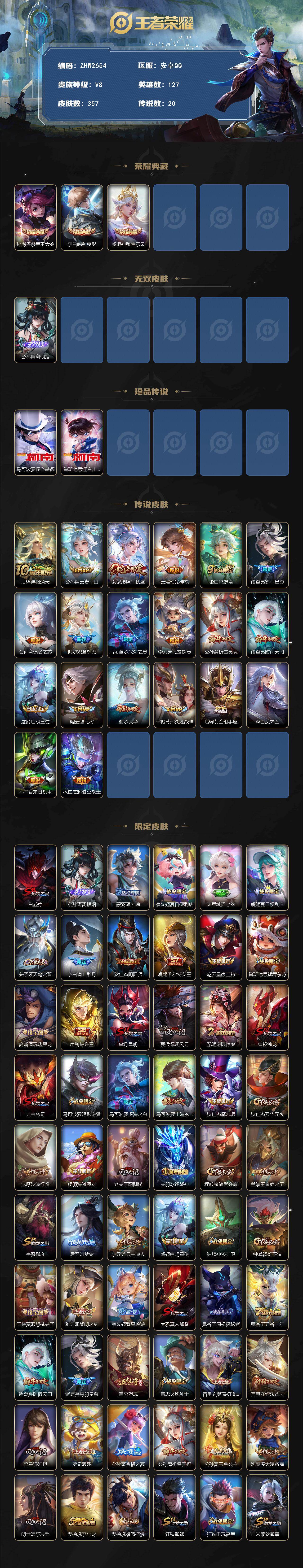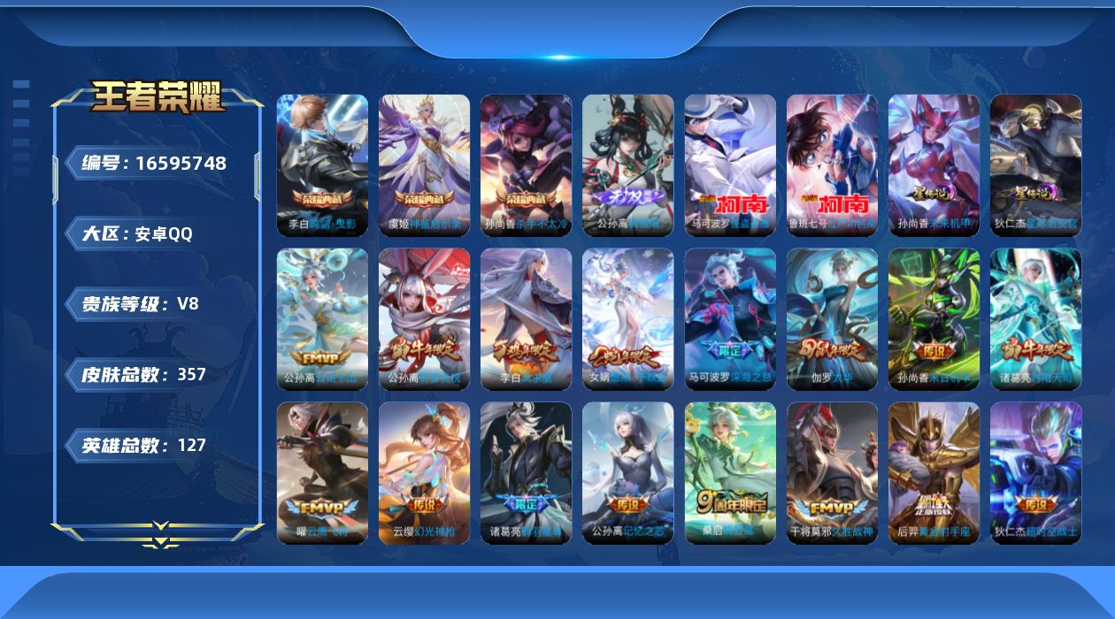 [16595748]安卓q-v8-最强王者段位-127英雄-357皮肤-3典藏皮肤-1无双-2珍品传说-20传说-2星传说-104史诗 【英雄全皮】:刘禅全皮,孙权全皮,黄忠全皮,公孙离全皮,莱西奥全皮,戈娅全皮,影全皮 【荣耀典藏】:孙尚香杀手不太冷,李白鸣剑曳影,虞姬神鉴启示录 【无双皮肤】:公孙离离恨烟 【珍品传说】:马可波罗怪盗基德,鲁班七号江户川柯南 【传说皮肤】:后羿神树通天,公孙离云诺千山,女娲愿照千秋盛,云缨幻光神呛,桑启鸣野蒿,诸葛亮鹤羽星尊,公孙离记忆之芯,伽罗炽翼辉光,马可波罗深海之息,李元芳飞鸢探春,公孙离祈雪灵祝,诸葛亮时雨天司,虞姬启明星使,曜云鹰飞将,伽罗太华,干将莫邪久胜战神,后羿黄金射手座,李白凤求凰,孙尚香末日机甲,狄仁杰超时空战士 【限定皮肤】:白起狰,公孙离离恨烟,蒙犽顽岩魄,蔡文姬夏日便利店,大乔绒语心约,虞姬夏日便利店,姜子牙天穹之誓,李白谪仙醉月,狄仁杰阴阳师,虞姬凯尔特女王,赵云皇家上将,鲁班七号狮舞东方,高渐离玩趣恶龙,扁鹊炼金王,芈月重明,夏侯惇朔风刀,甄姬游园惊梦,曹操烛龙,典韦穷奇,马可波罗暗影游猎,马可波罗深海之息,马可波罗山海玄木吟,狄仁杰魔术师,狄仁杰万华元夜,达摩沙漠行僧,项羽海滩派对,老夫子醍醐杖,关羽冰锋战神,程咬金演武夺筹,兰陵王金庭之子,牛魔御旌,后羿如梦令,李元芳云中旅人,虞姬启明星使,钟馗神迹守卫,钟馗驱傩正仪,干将莫邪胡桃夹子,雅典娜黎明之约,蔡文姬繁星吟游,太乙真人饕餮,鬼谷子原初探秘者,鬼谷子五谷丰年,诸葛亮时雨天司,诸葛亮鹤羽星尊,黄忠烈魂,黄忠火炮绅士,百里玄策原初追逐者,百里守约朱雀志,弈星混沌棋,梦奇顽趣,公孙离蜜橘之夏,公孙离祈雪灵祝,公孙离玉兔公主,沈梦溪大漠名商,明世隐疑决卦,裴擒虎李小龙,裴擒虎擒涛扼浪,狂铁御狮,狂铁电玩高手,米莱狄御霄,云中君纤云弄巧,伽罗太华,伽罗炽翼辉光,盾山御銮,上官婉儿梁祝,嫦娥暖冬兔眠,西施玲珑珍味,鲁班大师探海日志,桑启海盐诗旅,暃星界游侠,戈娅驭风魔法,艾琳流音漫舞,司空震地狱燃心,阿古朵江河有灵,张良古海寻踪,蒙犽百解令,蒙恬荣光圣徽,高渐离燃音魔法,妲己灵卜魔法,鬼谷子天穹祈灯,伽罗琥珀纪元,沈梦溪龙舞盛年,鲁班七号蔬乡物语,李元芳蔬乡物语,刘邦剑破天穹,程咬金群星魔术团,镜青焰无极,项羽苍威无极,刘备异域游侠,周瑜熔金海岸 【年限皮肤】:李白凤求凰