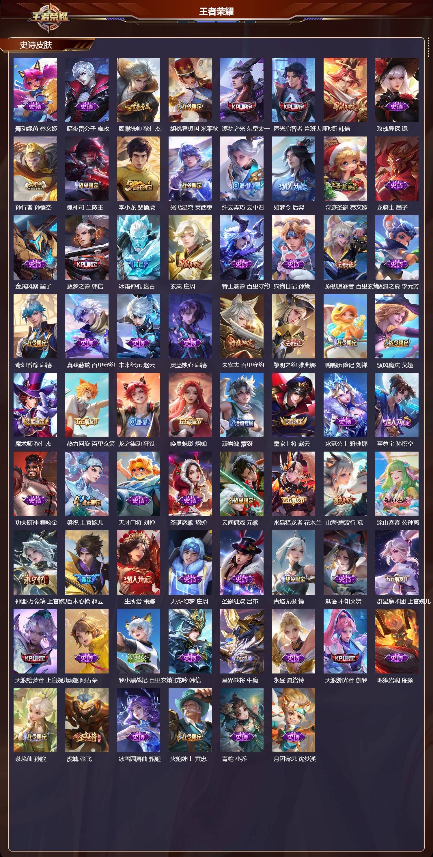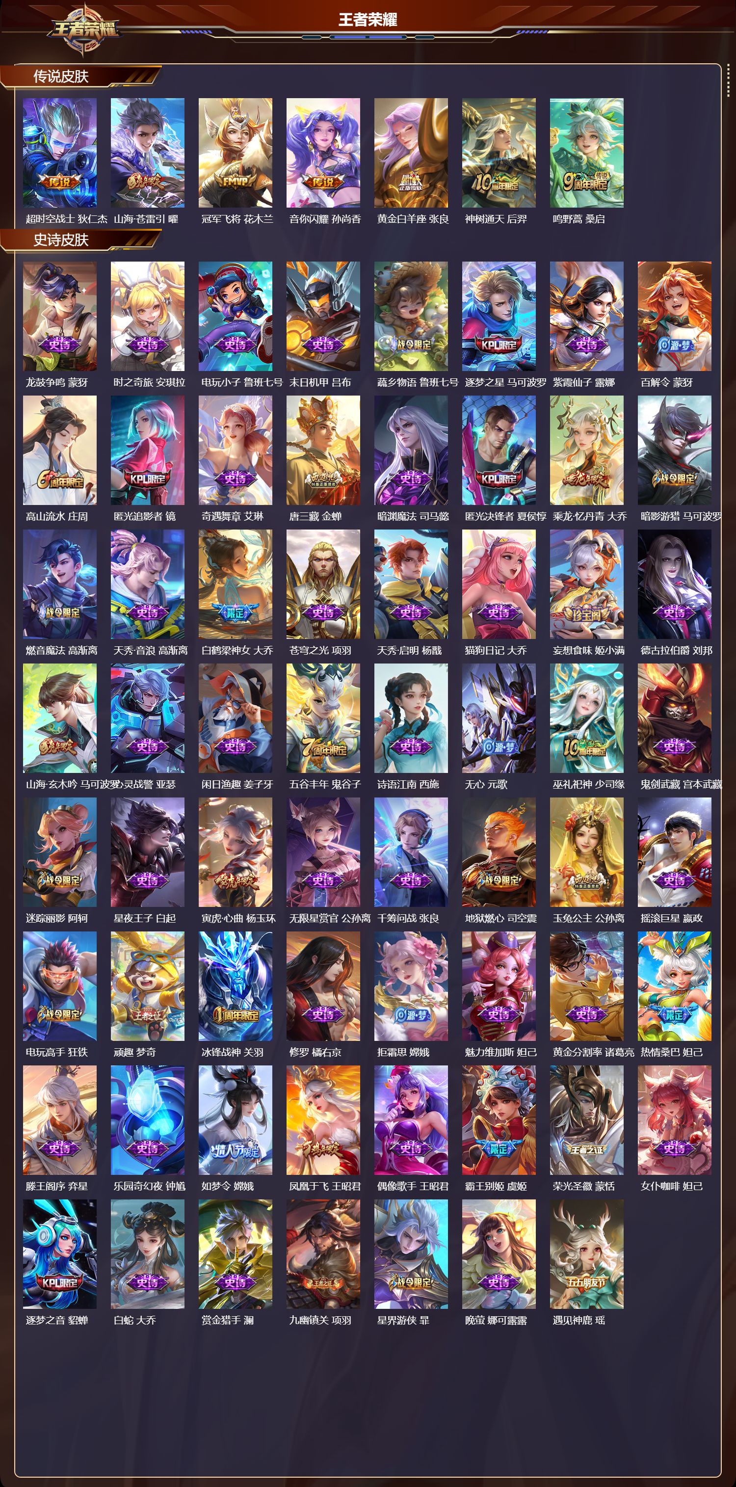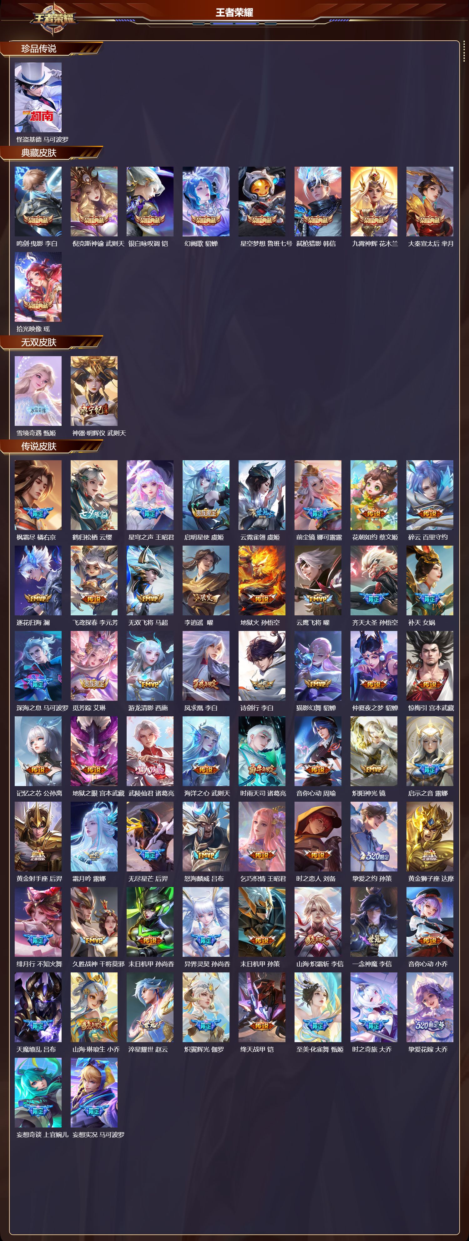 苹果qq/无双王者/505皮肤/128英雄/9典藏/0珍品无双/2无双/1珍品传说/65传说/169史诗/9稀有英雄【1 珍品传说】怪盗基德 马可波罗【9 典藏皮肤】鸣剑·曳影 李白倪克斯神谕 武则天银白咏叹调 铠幻阙歌 貂蝉星空梦想 鲁班七号弑呛猎影 韩信九霄神辉 花木兰大秦宣太后 芈月拾光映像 瑶【2 无双皮肤】雪境奇遇 甄姬神器·明辉仪 武则天【65 传说皮肤】枫霜尽