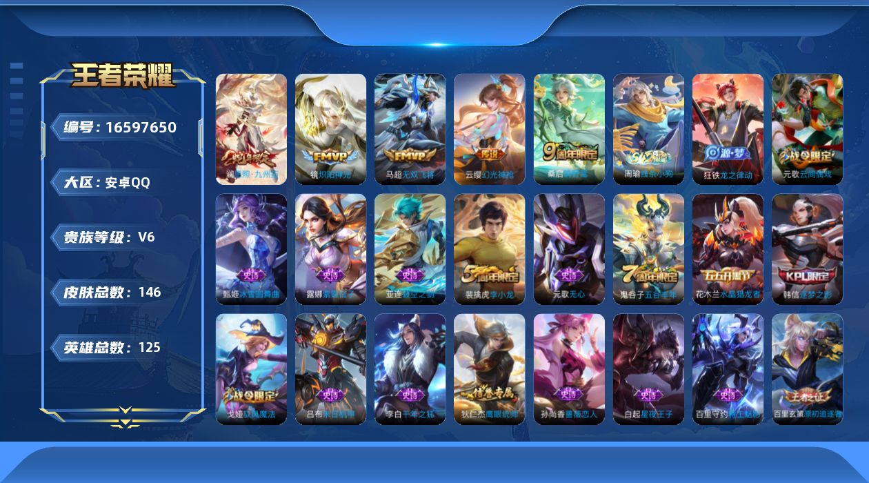[16597650]v6 5传说 125英雄 146皮肤 可修改实名 男号 【英雄全皮】大禹全皮 【稀有英雄】大司命韩信韩跳跳夏洛特夏师傅艾琳橘右京橘子娜可露露鸟人不知火舞赵云金蝉唐僧戈娅 【传说皮】幻光神呛炽阳神光无双飞将 【珍宝阁皮】蔷薇恋人 【赛季/战令皮】噬灭天穹s37古海寻踪s33海盐诗旅s30擒涛扼浪s31探海日志s32驭风魔法玲珑珍味剑破天穹s35天穹祈灯s34青焰无极苍威无极天穹之誓s36疑决卦s19原初探秘者s21万华元夜s22驱傩正仪s24云间偶戏沙漠行僧s26金庭之子s27大漠名商s28云中旅人s29 【史诗皮】龙之律动破空之剑线条小狗-周瑜紫霞仙子苍穹之光特工魅影千年之狐冰冠公主江河有灵末日机甲-吕布节奏热浪水果甜心绅士熊喵星夜王子暗隐猎兽者鬼剑武藏心灵战警水晶猎龙者金属风暴原初追逐者圣诞狂欢鹰眼统帅魅力维加斯无心未来纪元-赵云 【限定皮】愿照·九州拓澜年限鸣野蒿五谷丰年李小龙逐梦之影 【普通皮】谧流熔炉雾都夜雨苍林狼骑星梦巡礼街头霸王功夫炙烤龙舞盛年熔金海岸程咬金群星魔术团暗都幽影破阵·退雄兵铁骨偃魂玫蓝誓约死霸装踏浪烽翎聚星闪耀太极少年妄想特派热血海滩鬼谷子天穹祈灯s34完美运算蔚蓝守将万事如意五福同心龙腾万里归虚梦演-曜海滩丽影海滩派对皇家上将魔术师沉稳之力掌控之力守护之力敏锐之力化身博士炽热元素使纽约教父特工战影圆桌骑士(盾山)乓乓大师万象初新黄金武士次元突破功夫老勺鲨炮海盗猫红桃皇后教廷特使阴阳师汉昭烈帝兔女郎死亡骑士少女阿狸忍·炎影白执事爱心护理救世之瞳白色死神冰雪圆舞曲未来纪元-宫本武藏拳王科学大爆炸阿尔法小队幻乐之宴孤猎修竹墨客灼热之刃幸存者冰刃幻境花见巫女未来旅行龙域领主地府判官福禄兄弟蔷薇王座维京掠夺者激情绿茵赤焰之缨启蛰森极冰防御线魇语军师午夜歌剧院绝影神呛特种部队木偶奇遇记一千零一夜超能战警前尘碧珀绯影无双福将潮玩探月行